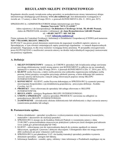 REGULAMIN SKLEPU INTERNETOWEGO Regulamin określa zasady świadczenia usług sprzedaży za pośrednictwem strony internetowej sklepu internetowego działającego pod domeną: www.abc-nailstore.pl. Jest dokumentem wymaganym w świetle art. 13 ustawy z dnia 30 maja 2014 r. o prawach KONSUMENTA (Dz. U. 2014, poz. 827). SPRZEDAWCĄ i ADMINISTRATOREM sklepu internetowego jest firma: Damian Nawrocki "SUN CLASSIC" Adres rejestrowy i do korespondencji: Os.Bolesława Chrobrego 16 lok. 58, 60-681 Poznań, Adres do PRZESYŁEK zwrotów i reklamacji: ul. Jana Rymarkiewicza 3,60-681 Poznań tel. +48 601 344 977 / 601 344 266 e-mail: [email protected] Firma wpisana do Centralnej Ewidencji i Informacji o Działalności Gospodarczej (CEIDG) pod numerem NIP: 7781141005, REGON: 300621276 KUPUJĄCY ma prawo przed złożeniem zamówienia do negocjacji wszelkich zapisów umowy ze Sprzedającym, w tym również zmieniających zapisy poniższego regulaminu - w ramach dopuszczalnych przepisami. Negocjacje, te dla swej ważności wymagają formy pisemnej. W przypadku zrezygnowania przez KUPUJĄCEGO z możliwości zawarcia umowy na drodze indywidualnych negocjacji zastosowanie ma poniższy regulamin. A. Definicje 1. SKLEP INTERNETOWY - oznacza, że UMOWA sprzedaży lub świadczenia usługi zawierana jest drogą elektroniczną i jeżeli stroną umowy jest KONSUMENT to odbywa się na warunkach opisanych w ustawie z dnia 30 maja 2014 r. o prawach KONSUMENTA (Dz. U. 2014, poz. 827). 2. KLIENT osoba fizyczna, a także osoba prawna oraz jednostka organizacyjna niebędąca osobą prawną, której przepisy szczególne przyznają zdolność prawną, a która dokonuje lub zamierza zawrzeć umowę lub korzysta z innych usług oferowanych poprzez stronę SKLEPU INTERNETOWEGO. 3. KONSUMENT - KLIENT, osoba fizyczna dokonującą ze SPRZEDAWCĄ czynności prawnej niezwiązanej bezpośrednio z jej działalnością gospodarczą - precyzyjna definicja - Kodeks Cywilny Art.22. 4. PRODUKT - rzecz oferowana do sprzedaży lub usługa oferowana w SKLEPIE INTERNETOWYM. 5. REGULAMIN - niniejszy Regulamin SKLEPU INTERNETOWEGO. 6. UMOWA SPRZEDAŻY - umowa sprzedaży PRODUKTU zawierana na odległość za pośrednictwem SKLEPU INTERNETOWEGO. 7. ZAMÓWIENIE - oświadczenie złożone elektronicznie lub telefonicznie o chęci zawarcia umowy (zamówienia produktu lub usługi). B. Postanowienia ogólne. 1. Zakres działalności - sprzedaż wysyłkowa z wykorzystaniem strony internetowej kosmetyków, materiałów i akcesoriów do stylizacji paznokci. 2. SPRZEDAWCA stosuje się do Kodeksu Dobrych Praktyk w rozumieniu ustawy z dnia 23.08.2007 o przeciwdziałaniu nieuczciwym praktykom rynkowym (treść dostępna pod adresem www.uokik.gov.pl/download.php?id=546) 3. KLIENT - zobowiązany jest do wprowadzania danych do systemu zgodnych ze stanem faktycznym, zgodnych z prawem i dobrymi obyczajami. Udostępniane dane nie mogą naruszać dóbr osobistych ani praw własności osób trzecich. 4. SPRZEDAWCA jest płatnikiem VAT i do każdej transakcji sprzedaży produktu wystawia dokument sprzedaży - paragon lub fakturę. 5. Informacje handlowe - cenniki, opisy, reklamy i inne informacje o Produktach znajdujące się na stronie WWW SPRZEDAWCY, stanowią zaproszenie do zawarcia umowy w rozumieniu art. 71 Kodeksu Cywilnego. C. Zamówienie. 1. SKLEP INTERNETOWY realizuje zamówienia z wysyłką do Polski. 2. Przed złożeniem zamówienia KLIENT musi się zapoznać z niniejszym REGULAMINEM. Fakt zapoznania się i akceptacji wszystkich postanowień niniejszego regulaminu potwierdza jawnie przy rejestracji w systemie oraz przed ostatecznym potwierdzeniem zamówienia. Formularz zamówienia nie zostanie zaakceptowany bez takiego potwierdzenia. 3. Zamówienie drogą elektroniczną można składać 24 godz. na dobę 7 dni w tygodniu. 4. Zamówienie telefoniczne można składać na numer telefonu podany w zakładce KONTAKT. W przypadku umowy zawartej na odległość poprzez telefon SPRZEDAWCA potwierdza treść proponowanej umowy wysyłając ją do KLIENTA utrwaloną na papierze lub innym trwałym nośniku. KONSUMENT dla ważności umowy składa oświadczenie o przyjęciu warunków i zawarciu umowy - jest ono skuteczne jeżeli zostało utrwalone na papierze lub innym trwałym nośniku po otrzymaniu potwierdzenia od SPRZEDAWCY. 5. Realizacja zamówienia (przygotowanie i wysyłka PRODUKTÓW) przez SPRZEDAWCĘ następuje : • a) po potwierdzeniu zamówienia - jeżeli wybrano płatność przy odbiorze; 6. Termin realizacji zamówienia w przypadku produktów znajdujących się w magazynie - nie dłużej niż 3 dni robocze, licząc od daty ustalonej jak w punkcie poprzednim. W większości przypadków zamówienia realizujemy w ciągu 24 godzin. W przypadku produktów oferowanych na zamówienie termin zostanie określony przy składaniu zamówienia. D. Ceny. 1. Podane w ofercie sklepu ceny produktów są cenami w walucie polskiej i są cenami brutto (zawierają wymagane prawem podatki). 2. Podane ceny produktów nie obejmują kosztów dostawy. 3. Ceną wiążącą dla KLIENTA jest cena aktualna w chwili złożenia zamówienia. E. Formy płatności: 1. za pobraniem - przy odbiorze wysłanych produktów; 2. płatność gotówką przy odbiorze osobistym - zamówione produkty należy odebrać w terminie 10 dni od złożenia zamówienia pod adresem ul. Jana Rymarkiewicza 3,60-681 Poznań; 3. SPRZEDAWCA ma prawo ograniczyć dostępne sposoby płatności, w tym także wymagać dokonania przedpłaty w całości albo części. 4. W przypadku wyboru płatności w formie przedpłaty przelewem KLIENT zobowiązany jest do dokonania zapłaty ceny z tytułu Umowy sprzedaży w terminie 7 dni od dnia jej zawarcia, chyba że Strony Umowy sprzedaży postanowią inaczej. F. Wysyłka towaru 1. Koszty dostawy ponosi KLIENT chyba, że opis oferty produktu stanowi inaczej. 2. KLIENT w trakcie wypełniania interaktywnego formularza zamówienia jest informowany o kosztach i dokonuje wyboru sposobu i ak