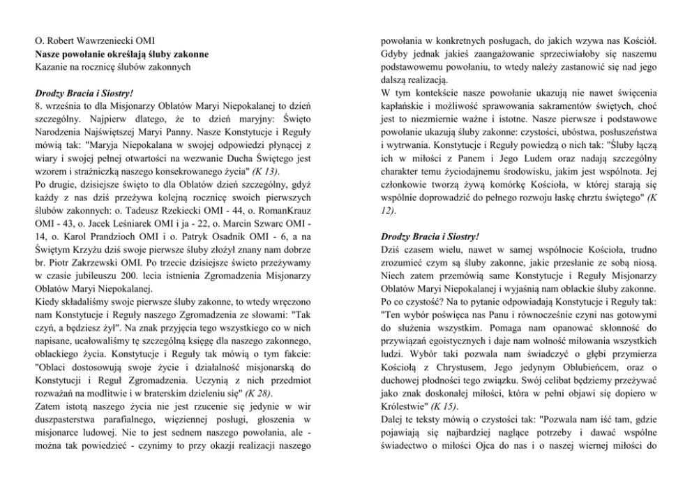 O. Robert Wawrzeniecki OMI Nasze powołanie określają śluby zakonne Kazanie na rocznicę ślubów zakonnych Drodzy Bracia i Siostry! 8. września to dla Misjonarzy Oblatów Maryi Niepokalanej to dzień szczególny. Najpierw dlatego, że to dzień maryjny: Święto Narodzenia Najświętszej Maryi Panny. Nasze Konstytucje i Reguły mówią tak: "Maryja Niepokalana w swojej odpowiedzi płynącej z wiary i swojej pełnej otwartości na wezwanie Ducha Świętego jest wzorem i strażniczką naszego konsekrowanego życia" (K 13). Po drugie, dzisiejsze święto to dla Oblatów dzień szczególny, gdyż każdy z nas dziś przeżywa kolejną rocznicę swoich pierwszych ślubów zakonnych: o. Tadeusz Rzekiecki OMI - 44, o. RomanKrauz OMI - 43, o. Jacek Leśniarek OMI i ja - 22, o. Marcin Szwarc OMI 14, o. Karol Prandzioch OMI i o. Patryk Osadnik OMI - 6, a na Świętym Krzyżu dziś swoje pierwsze śluby złożył znany nam dobrze br. Piotr Zakrzewski OMI. Po trzecie dzisiejsze świeto przeżywamy w czasie jubileuszu 200. lecia istnienia Zgromadzenia Misjonarzy Oblatów Maryi Niepokalanej. Kiedy składaliśmy swoje pierwsze śluby zakonne, to wtedy wręczono nam Konstytucje i Reguły naszego Zgromadzenia ze słowami: "Tak czyń, a będziesz żył". Na znak przyjęcia tego wszystkiego co w nich napisane, ucałowaliśmy tę szczególną księgę dla naszego zakonnego, oblackiego życia. Konstytucje i Reguły tak mówią o tym fakcie: "Oblaci dostosowują swoje życie i działalność misjonarską do Konstytucji i Reguł Zgromadzenia. Uczynią z nich przedmiot rozważań na modlitwie i w braterskim dzieleniu się" (K 28). Zatem istotą naszego życia nie jest rzucenie się jedynie w wir duszpasterstwa parafialnego, więziennej posługi, głoszenia w misjonarce ludowej. Nie to jest sednem naszego powołania, ale można tak powiedzieć - czynimy to przy okazji realizacji naszego powołania w konkretnych posługach, do jakich wzywa nas Kościół. Gdyby jednak jakieś zaangażowanie sprzeciwiałoby się naszemu podstawowemu powołaniu, to wtedy należy zastanowić się nad jego dalszą realizacją. W tym kontekście nasze powołanie ukazują nie nawet święcenia kapłańskie i możliwość sprawowania sakramentów świętych, choć jest to niezmiernie ważne i istotne. Nasze pierwsze i podstawowe powołanie ukazują śluby zakonne: czystości, ubóstwa, posłuszeństwa i wytrwania. Konstytucje i Reguły powiedzą o nich tak: "Śluby łączą ich w miłości z Panem i Jego Ludem oraz nadają szczególny charakter temu życiodajnemu środowisku, jakim jest wspólnota. Jej członkowie tworzą żywą komórkę Kościoła, w której starają się wspólnie doprowadzić do pełnego rozwoju łaskę chrztu świętego" (K 12). Drodzy Bracia i Siostry! Dziś czasem wielu, nawet w samej wspólnocie Kościoła, trudno zrozumieć czym są śluby zakonne, jakie przesłanie ze sobą niosą. Niech zatem przemówią same Konstytucje i Reguły Misjonarzy Oblatów Maryi Niepokalanej i wyjaśnią nam oblackie śluby zakonne. Po co czystość? Na to pytanie odpowiadają Konstytucje i Reguły tak: "Ten wybór poświęca nas Panu i równocześnie czyni nas gotowymi do służenia wszystkim. Pomaga nam opanować skłonność do przywiązań egoistycznych i daje nam wolność miłowania wszystkich ludzi. Wybór taki pozwala nam świadczyć o głębi przymierza Kościołą z Chrystusem, Jego jedynym Oblubieńcem, oraz o duchowej płodności tego związku. Swój celibat będziemy przeżywać jako znak doskonałej miłości, która w pełni objawi się dopiero w Królestwie" (K 15). Dalej te teksty mówią o czystości tak: "Pozwala nam iść tam, gdzie pojawiają się najbardziej naglące potrzeby i dawać wspólne świadectwo o miłości Ojca do nas i o naszej wiernej miłości do Niego" (K 16); "Jak wielkoduszny przykład wielu ludzi świeckich, małżonków lub samotnych często buduje misjonarzy, tak ci ze swojej strony przez swe prawdziwe uczucia i własną wierność będą oparciem dla tych, którzy muszą się zmagać o dochowanie wierności" (R 18c). Czystość zatem jest po to, by całkowicie poświęcić się Bogu na wzór Maryi i być gotowym do bycia dla drugiego człowieka. To znak doskonałej miłości, odpowiedzi na potrzeby wspólnoty wiary oraz okazja, by być oparciem dla zmagających się w walce o wierność w codziennym życiu. Po co ubóstwo? Na to pytanie odpowiadają Konstytucje i Reguły tak: "Ten wybór nas pobudza, abyśmy żyli w ścisłej łączności z Chrystusem i ubogimi. W ten sposób jest on protestem przeciw nadużywaniu władzy i bogactwa oraz zapowiedzią nadejścia świata nowego, wyzwolonego z egoizmu i otwartego n a dzielenie się. W obliczu wymagań naszego posłannictwa i nie zaspokojonych potrzeb, czujemy się czasem bezsilni i bezradni. Wtedy właśnie możemy wiele nauczyć się od ubogich, a zwłaszcza cierpliwości, nadziei i solidarności" (K 20). Dalej, ten szczególny tekst mówi: "Z natchnienia Ducha Świętego, który skłaniał pierwszych chrześcijan do dzielenia się wszystkim, oblaci wszystko oddają do dyspozycji wspólnoty. Zachowują prosty styl życia i uważają za sprawę istotną dla swego Instytutu dawanie zbiorowego świadectwa ewangelicznego wyrzeczenia. Unikają więc wszelkiego luksusu, wszelkiego pozoru luksusu, wszelkiego nieumiarkowanego zysku i wszelkiego gromadzenia dóbr. Podlegają powszechnemu prawu pracy, każdy ze swojej strony wnosi wkład w utrzymanie i apostolat swej wspólnoty oraz radośnie godzi się z faktem, że nie posiada wygód, jakich mógłby pragnąć" (K 21). Zatem ubóstwo staje się znakiem proroczym, będącym wyrzutem sumienia dla świata, gdzie liczy się bogactwo. To także znak tego, że możliwe jest wyzwolenie się z egoizmu i myślenia jedynie o sobie i swoich przyjemnościach. Wreszcie to znak, że w codziennym życiu nie wszystko trzeba mieść, aby być prawdziwie szczęśliwym. Po co posłuszeństwo? Na to pytanie odpowia