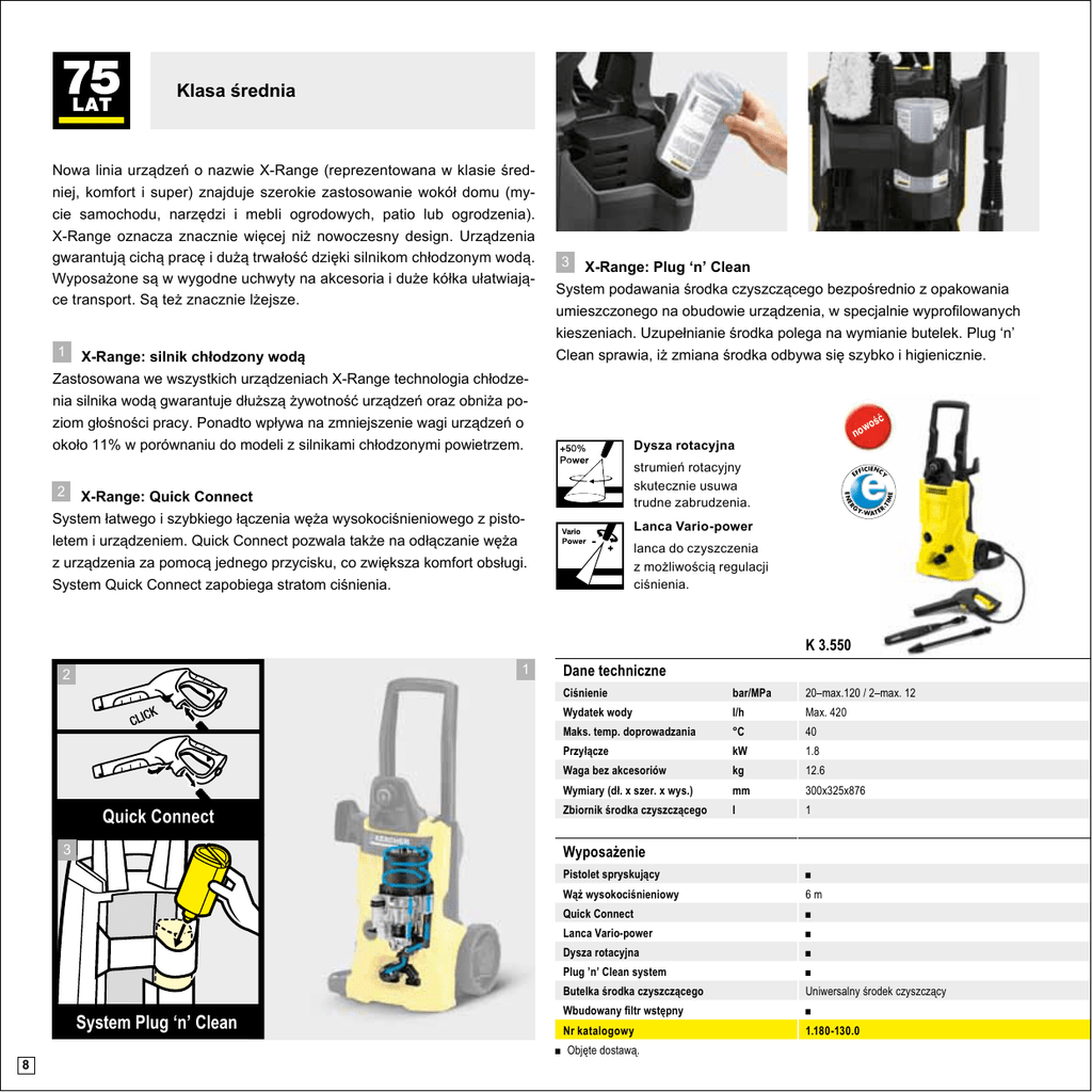 Klasa średnia ść wo no Dysza rotacyjna strumień rotacyjny skutecznie usuwa trudne zabrudzenia. G R X-Range: Quick Connect System łatwego i szybkiego łączenia węża wysokociśnieniowego z pistoletem i urządzeniem. Quick Connect pozwala także na odłączanie węża z urządzenia za pomocą jednego przycisku, co zwiększa komfort obsługi. System Quick Connect zapobiega stratom ciśnienia. EF FICIENCY ENE 2 E X-Range: silnik chłodzony wodą Zastosowana we wszystkich urządzeniach X-Range technologia chłodzenia silnika wodą gwarantuje dłuższą żywotność urządzeń oraz obniża poziom głośności pracy. Ponadto wpływa na zmniejszenie wagi urządzeń o około 11% w porównaniu do modeli z silnikami chłodzonymi powietrzem. X-Range: Plug ‘n’ Clean System podawania środka czyszczącego bezpośrednio z opakowania umieszczonego na obudowie urządzenia, w specjalnie wyprofilowanych kieszeniach. Uzupełnianie środka polega na wymianie butelek. Plug ‘n’ Clean sprawia, iż zmiana środka odbywa się szybko i higienicznie. IM 1 3 ·T Nowa linia urządzeń o nazwie X-Range (reprezentowana w klasie średniej, komfort i super) znajduje szerokie zastosowanie wokół domu (mycie samochodu, narzędzi i mebli ogrodowych, patio lub ogrodzenia). X-Range oznacza znacznie więcej niż nowoczesny design. Urządzenia gwarantują cichą pracę i dużą trwałość dzięki silnikom chłodzonym wodą. Wyposażone są w wygodne uchwyty na akcesoria i duże kółka ułatwiające transport. Są też znacznie lżejsze. Y·W TER A Lanca Vario-power lanca do czyszczenia z możliwością regulacji ciśnienia. K 3.550 1 2 Quick Connect Dane techniczne Ciśnienie bar/MPa 20–max.120 / 2–max. 12 Wydatek wody l/h Max. 420 Maks. temp. doprowadzania °C 40 Przyłącze kW 1.8 Waga bez akcesoriów kg 12.6 Wymiary (dł. x szer. x wys.) mm 300x325x876 Zbiornik środka czyszczącego l 1 Wyposażenie 3 Pistolet spryskujący System Plug ‘n’ Clean 8 ■ Wąż wysokociśnieniowy 6m Quick Connect ■ Lanca Vario-power ■ Dysza rotacyjna ■ Plug ’n’ Clean system ■ Butelka środka czyszczącego Uniwersalny środek czyszczący Wbudowany filtr wstępny ■ Nr katalogowy 1.180-130.0 ■ Objęte dostawą.