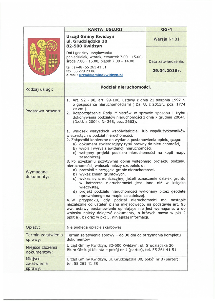 KARTA USŁUGI GG-4 Rodzaj usługi: Urząd Gminy Kwidzyn ul