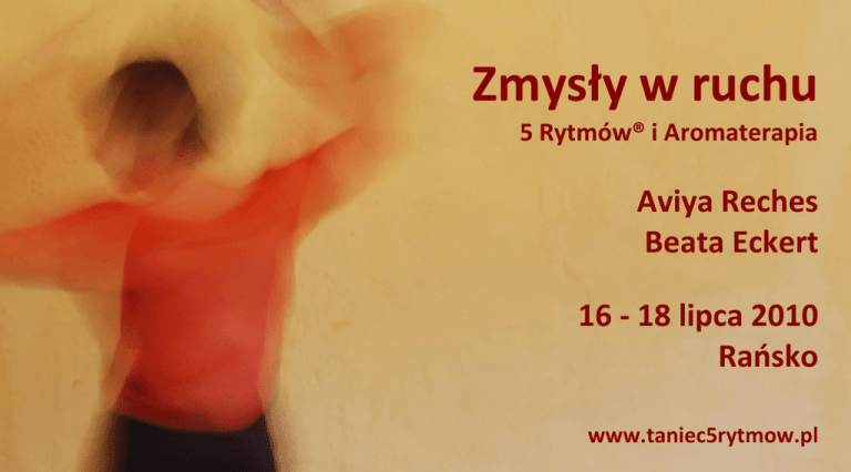 Zmysły w ruchu 5 Rytmów® i Aromaterapia Aviya Reches Beata Eckert 16 - 18 lipca 2010 Raosko www.taniec5rytmow.pl Ten niezwykły warsztat łączy dwie dziedziny pracy z ciałem, 5Rytmów® wg Gabrielle Roth i Aromaterapię. Podążając mapą 5Rytmów i używając olejków eterycznych, będziemy łączyd, taocząc w esencjach zapachowych, samych siebie zmysłami. Poznamy jak różne zapachy eterycznych olejków wpływają na nasz sposób poruszania się. Jaki jest mój ruch gdy czuję zapach ziemi, a jaki gdy zapach ciała? Jaki wpływ ma zapach na moja duszę? Zapachy podobnie jak nasze wzorce ruchu płyną jak fale. Wspierani niezwykłą muzyką i otaczającą nas naturą będziemy przebudzad i uwalniad nasze ciała. Ten warsztat jest dla każdego, kto jest gotowy na nowe doświadczenia i na zataoczenie siebie! Aviya Reches nauczycielka 5Rytmów® wg Gabrielle Roth i Aromaterapeutka www.mc5.co.il/en/ Beata Eckert nauczycielka 5Rytmów® wg Gabrielle Roth www.taniec5rytmow.pl Miejsce: Raosko 9 (koło Międzyrzecza) Termin: 16-18.07.2010 (od piątku 16.07.2010 godz.18.00 do niedzieli 18.07.2010 godz.14.00) Koszt warsztatu: 490 zł. przy wpłacie 140 zł. na konto w tytule ZMYSŁY 440 zł. przy wpłacie 140 zł do 25.06.2010.(na konto jw.) Nr konta 75 1090 1476 0000 0001 1099 6430 Beata Eckert Zapisy i informacje: [email protected] Beata 608 59 46 77 Sylwia 664 02 76 46 Ilośd miejsc bardzo ograniczona, o rezerwacji decyduje kolejnośd wpłat. Prosimy o potwierdzenie wpłaty mailowo lub telefonicznie. Cena zawiera 1 ciepły posiłek każdego dnia i możliwośd spania we wspólnej sali lub pod własnym namiotem (więcej informacji przy zapisach)