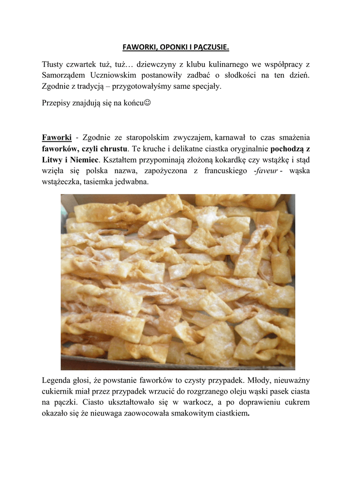 FAWORKI, OPONKI I PĄCZUSIE. Tłusty czwartek tuż, tuż… dziewczyny z klubu kulinarnego we współpracy z Samorządem Uczniowskim postanowiły zadbać o słodkości na ten dzień. Zgodnie z tradycją – przygotowałyśmy same specjały. Przepisy znajdują się na końcu Faworki - Zgodnie ze staropolskim zwyczajem, karnawał to czas smażenia faworków, czyli chrustu. Te kruche i delikatne ciastka oryginalnie pochodzą z Litwy i Niemiec. Kształtem przypominają złożoną kokardkę czy wstążkę i stąd wzięła się polska nazwa, zapożyczona z francuskiego -faveur - wąska wstążeczka, tasiemka jedwabna. Legenda głosi, że powstanie faworków to czysty przypadek. Młody, nieuważny cukiernik miał przez przypadek wrzucić do rozgrzanego oleju wąski pasek ciasta na pączki. Ciasto ukształtowało się w warkocz, a po doprawieniu cukrem okazało się że nieuwaga zaowocowała smakowitym ciastkiem. PĄCZKI Pulchne, okrągłe drożdżowe ciastko nadziewane konfiturą, owocami lub budyniem. Często oprószone cukrem pudrem lub polane lukrem. Choć pączek kojarzy nam się z Polską trafił na nasze stoły najprawdopodobniej z Bliskiego Wschodu lub starożytnego Rzymu. Już wtedy w ostatnie dni karnawału były czasem zabawy i picia a na stołach królowały tłuste potrawy, w tym pączki. Początkowo było to ciasto chlebowe nadziewane słoniną i smażone w smalcu. My przygotowaliśmy jeszcze inną wersję pączusiów- pączki z ricottą. Dopiero z czasem, w XVI wieku, ciastko to zaczęto przyrządzać na słodko. Jako o jednym z tradycyjnych polskich deserów pisał o pączkach Mikołaj Rej, a historycy wspominają, że serwowano je na dworze króla Augusta III. Na Śląsku pączki znane są jako kreple – od niemieckiego słowa Krapfen, czyli ciasta smażonego w tłuszczu, wcześniej funkcjonowały też nazwy bliny czy babałuchy. OPONKI Oponki są odmianą paczka, najczęściej występującą w USA w postaci tzw. donatów Zazwyczaj przygotowuje się je z ciasta z dodatkiem białego sera i w tym przypadku nie używa się drożdży jak przy pączkach. Z ciasta wykrawa się szklanką duże kółko, a w jego środku mniejsze przy użyciu kieliszka. Gotowe oponki wrzuca się do gorącego oleju. Po usmażeniu ciastka posypuje się cukrem pudrem. Nasza ekipa przygotowała „oszukane” oponki nie zawierające twarogu. Ale równie pyszne!!! PRZEPISY NA NASZE SŁODKOŚCI! FAWORKI 2 szklanki mąki, 4 żółtka, ½ łyżeczki proszku do pieczenia, łyżka octu, ½ butelki śmietany. Do smażenia: olej, smalec w proporcji 1:1 Ciasto należy długo wyrabiać rękami. Rozwałkować na cienkie placki, kroić w paseczki, które w połowie nakrajamy i przekładamy. Kładziemy na rozgrzany tłuszcz, smażymy na złoty kolor a następnie ostudzone oprószamy cukrem pudrem. OPONKI 1/2 szklanki mleka, ½ szklanki cukru, 50 dag świeżych drożdży, 2 ½ szklanki mąki, ¼ kostki masła (ok. 60 g), jajko, szczypta soli, olej lub smalec do smażenia. Drożdże rozpuszczamy w ciepłym mleku, dodajemy 2 łyżki cukru i odstawiamy zaczyn na ok. 30-40 minut. Do miski wsypujemy mąkę, cukier, sól, masło jajko i zaczyn. Mieszamy składniki ( można mikserem) aż uzyskamy kulę ciasta. Wkładamy ciasto na minimum godzinę do lodówki. Po wyjęciu rozwałkowujemy na grubość około 8 mm. Szklanką wycinamy koła, a w środku kieliszkiem małe okręgi. Oponki zostawiamy na ok. 40 min, aby podrosly. Następnie smażymy na złoty kolor. Po ostudzeniu oprószmy cukrem pudrem. PĄCZKI Z RICOTTĄ 200 g serka risotta, 2 jaja, 75 g mąki pszennej, 1 łyżka cukru pudru, 1,5 łyżeczki proszku do pieczenia, ½ łyżeczki cynamonu, kilka kropel ekstraktu waniliowego, szczypta soli, olej do smażenia. Ricottę miksujemy z jajkami na gładką masę. Dodajemy mąkę, proszek do pieczenia, cukier puder, cynamon, wanilię i sól. Znów miksujemy na gładko. Na średnią patelnię wlewamy olej (ok. 2 cm wys.) i rozgrzewamy. Zmniejszamy na średni ogień. Zaokrągloną łyżeczką kładziemy partiami ciasto na tłuszcz, zachowując odstępy, gdyż pączki puchną w trakcie smażenia. Smażymy z obu stron na złoto. W razie potrzeby uzupełniamy olej. Usmażone pączki odsączamy na papierowym ręczniku. Ostudzone posypujemy cukrem pudrem. Szybkie i proste mini pączki gotowe ! SMACZNEGO!!!