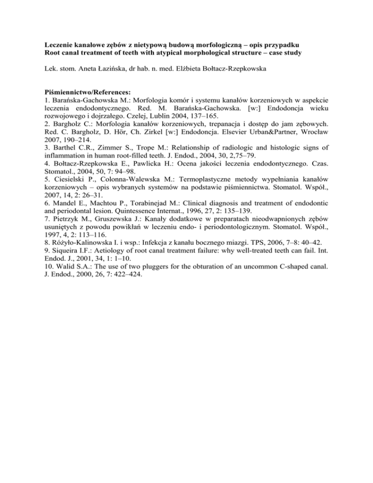 Leczenie kanałowe zębów z nietypową budową morfologiczną – opis przypadku Root canal treatment of teeth with atypical morphological structure – case study Lek. stom. Aneta Łazińska, dr hab. n. med. Elżbieta Bołtacz-Rzepkowska Piśmiennictwo/References: 1. Barańska-Gachowska M.: Morfologia komór i systemu kanałów korzeniowych w aspekcie leczenia endodontycznego. Red. M. Barańska-Gachowska. [w:] Endodoncja wieku rozwojowego i dojrzałego. Czelej, Lublin 2004, 137–165. 2. Bargholz C.: Morfologia kanałów korzeniowych, trepanacja i dostęp do jam zębowych. Red. C. Bargholz, D. Hör, Ch. Zirkel [w:] Endodoncja. Elsevier Urban&Partner, Wrocław 2007, 190–214. 3. Barthel C.R., Zimmer S., Trope M.: Relationship of radiologic and histologic signs of inflammation in human root-filled teeth. J. Endod., 2004, 30, 2,75–79. 4. Bołtacz-Rzepkowska E., Pawlicka H.: Ocena jakości leczenia endodontycznego. Czas. Stomatol., 2004, 50, 7: 94–98. 5. Ciesielski P., Colonna-Walewska M.: Termoplastyczne metody wypełniania kanałów korzeniowych – opis wybranych systemów na podstawie piśmiennictwa. Stomatol. Współ., 2007, 14, 2: 26–31. 6. Mandel E., Machtou P., Torabinejad M.: Clinical diagnosis and treatment of endodontic and periodontal lesion. Quintessence Internat., 1996, 27, 2: 135–139. 7. Pietrzyk M., Gruszewska J.: Kanały dodatkowe w preparatach nieodwapnionych zębów usuniętych z powodu powikłań w leczeniu endo- i periodontologicznym. Stomatol. Współ., 1997, 4, 2: 113–116. 8. Różyło-Kalinowska I. i wsp.: Infekcja z kanału bocznego miazgi. TPS, 2006, 7–8: 40–42. 9. Siqueira I.F.: Aetiology of root canal treatment failure: why well-treated teeth can fail. Int. Endod. J., 2001, 34, 1: 1–10. 10. Walid S.A.: The use of two pluggers for the obturation of an uncommon C-shaped canal. J. Endod., 2000, 26, 7: 422–424.