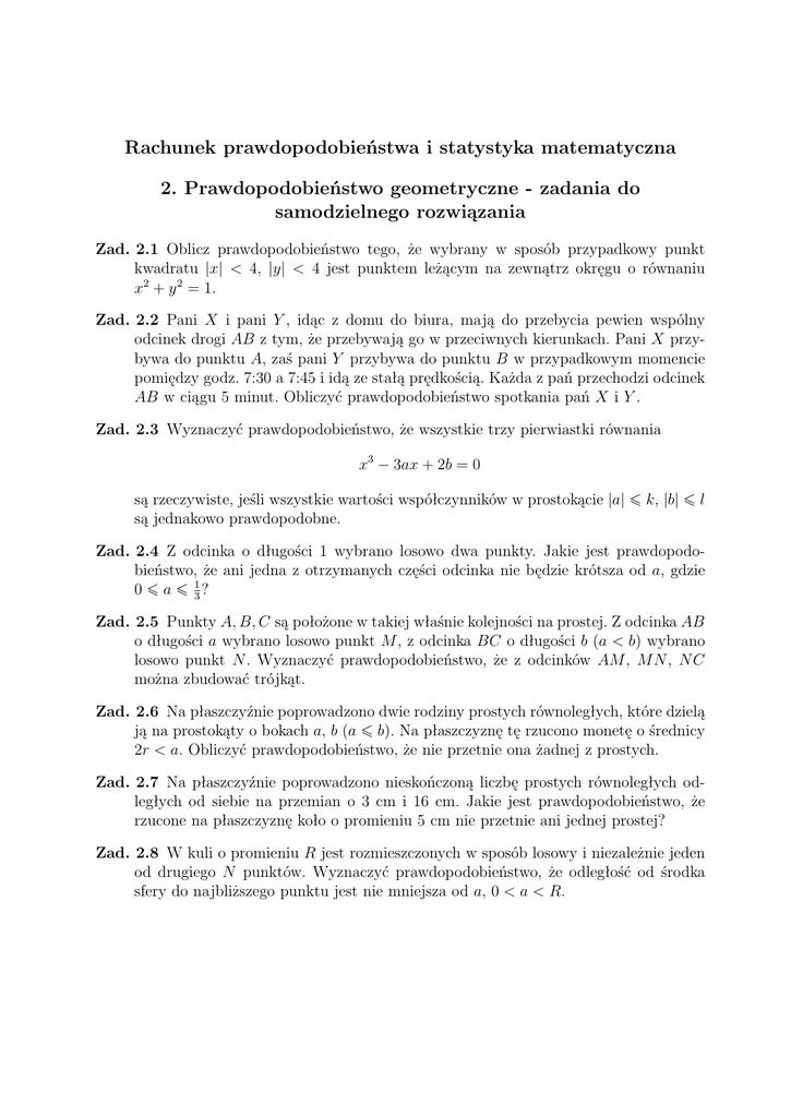 Rachunek prawdopodobieństwa i statystyka matematyczna 2. Prawdopodobieństwo geometryczne - zadania do samodzielnego rozwiązania Zad. 2.1 Oblicz prawdopodobieństwo tego, że wybrany w sposób przypadkowy punkt kwadratu |x| < 4, |y| < 4 jest punktem leżącym na zewnątrz okręgu o równaniu x2 + y 2 = 1. Zad. 2.2 Pani X i pani Y , idąc z domu do biura, mają do przebycia pewien wspólny odcinek drogi AB z tym, że przebywają go w przeciwnych kierunkach. Pani X przybywa do punktu A, zaś pani Y przybywa do punktu B w przypadkowym momencie pomiędzy godz. 7:30 a 7:45 i idą ze stałą prędkością. Każda z pań przechodzi odcinek AB w ciągu 5 minut. Obliczyć prawdopodobieństwo spotkania pań X i Y . Zad. 2.3 Wyznaczyć prawdopodobieństwo, że wszystkie trzy pierwiastki równania x3 − 3ax + 2b = 0 są rzeczywiste, jeśli wszystkie wartości współczynników w prostokącie |a| ¬ k, |b| ¬ l są jednakowo prawdopodobne. Zad. 2.4 Z odcinka o długości 1 wybrano losowo dwa punkty. Jakie jest prawdopodobieństwo, że ani jedna z otrzymanych części odcinka nie będzie krótsza od a, gdzie 0 ¬ a ¬ 31 ? Zad. 2.5 Punkty A, B, C są położone w takiej właśnie kolejności na prostej. Z odcinka AB o długości a wybrano losowo punkt M , z odcinka BC o długości b (a < b) wybrano losowo punkt N . Wyznaczyć prawdopodobieństwo, że z odcinków AM , M N , N C można zbudować trójkąt. Zad. 2.6 Na płaszczyźnie poprowadzono dwie rodziny prostych równoległych, które dzielą ją na prostokąty o bokach a, b (a ¬ b). Na płaszczyznę tę rzucono monetę o średnicy 2r < a. Obliczyć prawdopodobieństwo, że nie przetnie ona żadnej z prostych. Zad. 2.7 Na płaszczyźnie poprowadzono nieskończoną liczbę prostych równoległych odległych od siebie na przemian o 3 cm i 16 cm. Jakie jest prawdopodobieństwo, że rzucone na płaszczyznę koło o promieniu 5 cm nie przetnie ani jednej prostej? Zad. 2.8 W kuli o promieniu R jest rozmieszczonych w sposób losowy i niezależnie jeden od drugiego N punktów. Wyznaczyć prawdopodobieństwo, że odległość od środka sfery do najbliższego punktu jest nie mniejsza od a, 0 < a < R.