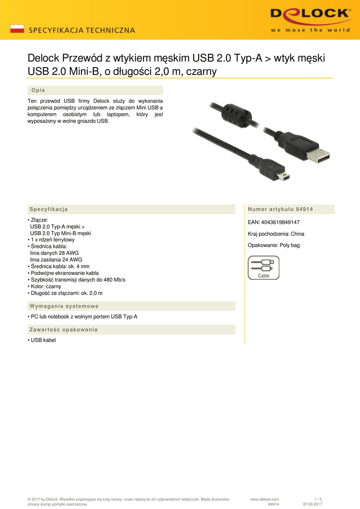 Delock Przewód z wtykiem męskim USB 2.0 Typ-A > wtyk męski USB 2.0 Mini-B, o długości 2,0 m, czarny Opis Ten przewód USB firmy Delock służy do wykonania połączenia pomiędzy urządzeniem ze złączem Mini USB a komputerem osobistym lub laptopem, który jest wyposażony w wolne gniazdo USB. Specyfikacja • Złącze: USB 2.0 Typ-A męski > USB 2.0 Typ Mini-B męski • 1 x rdzeń ferrytowy • Średnica kabla: linia danych 28 AWG linia zasilania 24 AWG • Średnica kabla: ok. 4 mm • Podwójne ekranowanie kabla • Szybkość transmisji danych do 480 Mb/s • Kolor: czarny • Długość ze złączami: ok. 2,0 m Numer artykułu 84914 EAN: 4043619849147 Kraj pochodzenia: China Opakowanie: Poly bag Wymagania systemowe • PC lub notebook z wolnym portem USB Typ-A Zawartość opakowania • USB kabel © 2017 by Delock. Wszelkie pojawiające się tutaj nazwy i znaki należą do ich odpowiednich właścicieli. Błędy drukarskie, zmiany & pomyłki zastrzeżone. www.delock.com 84914 1/2 07.03.2017 Interface złącze 1: 1 x USB 2.0 Typ-A męski złącze 2: 1 x USB 2.0 Typ Mini-B męski Technical characteristics Szybkość transmisji danych: USB 2.0 do 480 Mb/s Physical characteristics Rdzeń ferrytowy: 1x Średnica kabla: 4 mm Wykończenie złącza: niklowane Wykończenie pinów: pozłacane Conductor gauge: linia danych 28 AWG linia zasilania 24 AWG Shielding: double Length: 2m Kolor: czarny © 2017 by Delock. Wszelkie pojawiające się tutaj nazwy i znaki należą do ich odpowiednich właścicieli. Błędy drukarskie, zmiany & pomyłki zastrzeżone. Powered by TCPDF (www.tcpdf.org) www.delock.com 84914 2/2 07.03.2017
