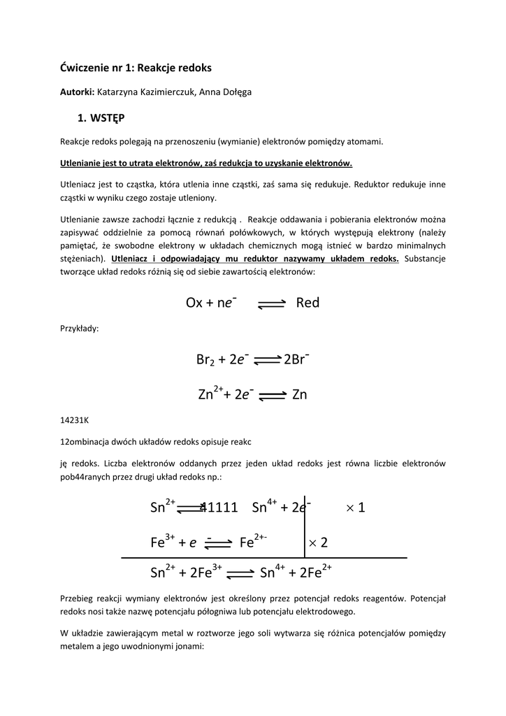 Ćwiczenie nr 1: Reakcje redoks Autorki: Katarzyna Kazimierczuk, Anna Dołęga 1. WSTĘP Reakcje redoks polegają na przenoszeniu (wymianie) elektronów pomiędzy atomami. Utlenianie jest to utrata elektronów, zaś redukcja to uzyskanie elektronów. Utleniacz jest to cząstka, która utlenia inne cząstki, zaś sama się redukuje. Reduktor redukuje inne cząstki w wyniku czego zostaje utleniony. Utlenianie zawsze zachodzi łącznie z redukcją . Reakcje oddawania i pobierania elektronów można zapisywać oddzielnie za pomocą równań połówkowych, w których występują elektrony (należy pamiętać, że swobodne elektrony w układach chemicznych mogą istnieć w bardzo minimalnych stężeniach). Utleniacz i odpowiadający mu reduktor nazywamy układem redoks. Substancje tworzące układ redoks różnią się od siebie zawartością elektronów: Ox + ne- Red Przykłady: Br2 + 2e- 2Br- Zn2++ 2e- Zn 14231K 12ombinacja dwóch układów redoks opisuje reakc ję redoks. Liczba elektronów oddanych przez jeden układ redoks jest równa liczbie elektronów pob44ranych przez drugi układ redoks np.: Sn2+ 41111 Sn4+ + 2e- Fe3+ + e Sn2+ + 2Fe3+ Fe2+- ×1 ×2 Sn4+ + 2Fe2+ Przebieg reakcji wymiany elektronów jest określony przez potencjał redoks reagentów. Potencjał redoks nosi także nazwę potencjału półogniwa lub potencjału elektrodowego. W układzie zawierającym metal w roztworze jego soli wytwarza się różnica potencjałów pomiędzy metalem a jego uwodnionymi jonami: M0 Mn+ + ne- P-+ R⋅T n⋅F [ox] [red] otencjał półogniwa jest określony przez równanie Nernsta, które dla rozcieńczonych roztworów ma `tfggtfggfgrrtyyubgvfghjklbhn bbb vnnbn postać: E = Eo + ln gdzie: • • • • • • R – uniwersalna stała gazowa 8,314 J·K-1 mol-1 T – temperaturę wyrażona w kelwinach n - liczba elektronów wymienianych w reakcji połówkowej F – stała Faradaya równa 96485 C·mol-1 (ładunek liczby Avogadro elektronów NAe-) [red] – stężenie molowe formy zredukowanej [ox] – stężenie molowe formy utlenionej W równaniu tym Eº oznacza potencjał standardowy w temp. 25 °C i przy jednostkowym stężeniu lub ciśnieniu. Potencjał standardowy jest miarą tendencji metalu do przechodzenia do roztworu – określa zdolność utleniającą i redukującą substancji. Układ redoks o wyższym Eº (ukł. utleniający) odbiera elektrony od układu o niższym Eº (ukł. redukującego). Im większa różnica potencjałów tym większa jest siła napędowa reakcji redoks. W trakcie reakcji potencjały półogniw reakcji redoks zmieniają się w taki sposób, że w stanie równowagi zrównują się E1 = E2. Uwaga: Większość reakcji redoks zachodzi w warunkach niestandardowych! Gdy reakcja zachodzi zmieniają się stężenia reagentów i zmienia się siła napędowa reakcji. Ogniwo galwaniczne jest to urządzenie, w którym wytwarzany jest prąd elektryczny – strumień elektronów w przewodniku – dzięki przebiegowi samorzutnej reakcji chemicznej redoks. Ogniwo galwaniczne składa się z dwóch elektrod czyli metalicznych przewodników w kontakcie z elektrolitem. Reakcje utlenienia i redukcji (reakcje elektrodowe) zachodzą w różnych obszarach ogniwa. Siła elektromotoryczna (SEM) ogniwa jest miarą zdolności ogniwa do spowodowania przepływu elektronów. Standardową SEM (wszystkie cząstki w stanach standardowych) obliczamy jako różnicę potencjałów standardowych: Eº = Eº (katoda) – Eº (anoda) Potencjałem standardowym elektrody jest SEM ogniwa, w którym drugą elektrodą jest elektroda wodorowa (Eº=0,0 V). Elektroda wodorowa składa się ze szklanej rury, w której stale płynie wodór pod określonym ciśnieniem omywając folię platynową. Folia jest dodatkowo pokryta rozdrobnioną platyną , która adsorbuje wodór: H+/H2. Platyna nie uczestniczy w reakcji. Standardowa elektroda wodorowa: CH+ = 1 M, pH2 = 105 Pa Uwaga: Potencjały redoks nie są wielkościami absolutnymi! Uwaga: jeżeli w układzie mamy do czynienia z kilkoma utleniaczami to ten o wyższym potencjale redoks będzie zużywany jako pierwszy! Tabela 1 Określanie zdolności utleniającej/redukującej układów redoks Rodzaj substancji Potencjał standardowy Przykłady Eº, [V] Utleniacz silny > (+ 1,5) F2 + 2e -= 2F- +2,87 Utleniacz słaby (+0,5) ÷ (+1,0) +0,75 Reduktor słaby (+0,0) ÷ (+0,5) Reduktor silny < (-0,5) H2SeO3 + 4H+ + 4e – = Se + 3H2O HAsO2 + 3H+ + 3e – = As + 2H2O Li+ + e - = Li +0,25 -3,09 Tabela 2 Potencjały standardowe wybranych układów redoks REAKCJA Potencjał standardowy Eº, [V] F2 + 2 e–= 2F– +2,87 MnO4- + 8H+ + 5e– = Mn2+ + 4H2O +1,51 Cl2 + 2e– = 2Cl– +1,36 Br2 + 2e– = 2Br– +1,065 MnO4 – + 2H2O + 3e– = MnO2 + 4OH– +1,23 IO3– + 6H+ + 6e– = I– + 3H2O +1,04 NO3- + 4H+ + 3e– = NO + 2H2O +0,96 Hg2+ + 2e– = Hg +0,85 MnO4− + e− → MnO42− +0,54 I2 + 2e– = 2I– +0,54 Cu2+ + 2e– = Cu +0,337 SO42– + 4H+ + 2e– = H2SO3 + H2O +0,158 2H+ + e– = H2 0,0 Pb2+ + 2e– = Pb -0,126 Zn2+ + 2e– = Zn -0,76 Al3+ + 3e– = Al -1,67 Mg2+ + 2e– = Mg -2,34 Na+ + e– = Na -2,71 Tak jak już stwierdzono powyżej, przebieg reakcji redoks jest zdeterminowany przez potencjały redoks reagujących substancji, zatem tabele potencjałów redoks mogą nam posłużyć do określania kierunku reakcji redoks między substancjami. Poniżej przedstawiono schemat, którym można się posługiwać przy próbach przewidywania przebiegu reakcji redoks dla reagentów, dla których znane są (zostały zmierzone) potencjały odpowiednich reakcji połówkowych: 1) Wybierz odpowiednie reakcje połówkowe z tablicy potencjałów, 2) Zapisz połówkową reakcję redukcji dla układu redoks o wyższym potencjale (zapisz obok Eo), 3) Zapisz drugą reakcję połówkową jako reakcję utlenienia (zapisz obok Eo z przeciwnym znakiem), 4) Zbilansuj elektrony (nie mnożymy potencjałów!), 5) Dodaj reakcje połówkowe i potencjały. Dodatni potencjał ogniwa, w k