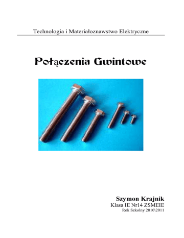 Technologia i Materiałoznawstwo Elektryczne Połączenia Gwintowe Szymon Krajnik Klasa IE Nr14 ZSMEIE Rok Szkolny 2010\2011 TiME – Połączenia gwintowe Szymon Krajnik kl. 1e – 2010/2011 2 Połączenie gwintowe P o ł ąc z e n i e g w i n t o w e - połączenie rozłączne spoczynkowe, w którym elementem łączącym są gwintowane łączniki: śruba z nakrętką lub wkręt. W skład połączenia gwintowego wchodzą także elementy pomocnicze, takie jak podkładki i zawleczki. Podkładki mają za zadanie ochronę elementów złącza przed zadrapaniem w czasie dokręcania łącznika oraz niekiedy wraz z zawleczką zabezpieczania przed samoczynnym odkręcaniem się nakrętki. Ze względu na rodzaj użytego łącznika połączenia gwintowe dzielą się na połączenia śrubowe i wkrętowe. P od k ła d k i Podkładki mają za zadanie ochronę elementów złącza przed zadrapaniem w czasie dokręcania łącznika oraz niekiedy wraz z zawleczką zabezpieczania przed samoczynnym odkręcaniem się nakrętki. W k r ęt y Łącznik w połączeniu gwintowym dociskowym. Alternatywą wkrętu w tym połączeniu jest śruba dociskowa, różniąca się od wkrętu sposobem utwierdzenia, kształtem i typem łba - śruby nie posiadają nacięcia. R o d z a j e W k r ęt ó w 1. 2. 3. 4. 5. 6. 7. 8. 9. 10. blachowkręt samowiertny, łeb z nacięciem PH, wkręt do materiałów warstwowych samowiertny (np. do przykręcania płyt plastykowych do metalu), łeb z nacięciem PH, wkręt montażowy, łeb z nacięciem PH, wkręt montażowy samowiertny, łeb z nacięciem PH, wkręt montażowy, łeb z nacięciem PZ, wkręt do drewna, łeb z nacięciem PZ, wkręt montażowy, łeb sześciokątny z nacięciem PH i prostym, wkręt do pokryć blacharskich, samowiertny, z uszczelką, łeb sześciokątny, wkręt montażowy, łeb sześciokątny z nacięciem prostym, blachowkręt nierdzewny, łeb z nacięciem prostym. TiME – Połączenia gwintowe Szymon Krajnik kl. 1e – 2010/2011 a) b) 3 końcówka samowiertna, skrzydełka rozwiercające miękki materiał Śr u b a To element połączenia gwintowego. W budowie maszyn łączniki te znajdują różnorakie zastosowanie, dlatego też występują w wielu odmianach zawartych w normie PN-91/M-82055. Śruby różnią się między sobą wielkością, kształtem łba, trzpienia oraz zakończenia. R o d z a j e N a k r ęt e k a) b) c) d) e) f) g) sześciokątne koronowe czworokątne okrągłe otworowe okrągłe rowkowe skrzydełkowe radełkowe. R o d z a je g w in t ó w a) b) c) d) e) trójkątny trapezowy symetryczny trapezowy niesymetryczny prostokątny okrągły TiME – Połączenia gwintowe Szymon Krajnik kl. 1e – 2010/2011 4 P o ł ąc z e n i a śr u b o w e W tego rodzaju połączeniach śruba i nakrętka, łączą dwa lub więcej elementów. Elementy te w miejscu łączenia są przewiercane, tak by otwór mieścił śrubę z pasowaniem luźnym. Śruba w takim połączeniu może przenosić tylko i wyłącznie obciążenia osiowe, np. jeżeli elementy połączenia są od siebie w sposób naturalny odciągane np. pokrywa kotła połączona z jego korpusem. Nakrętka w takim połączeniu dokręcana jest na tyle mocno by zapewnić integralność połączenia, gdy nie jest ono obciążone. W przypadku, gdy elementy łączone są obciążone siłami wzdłużnymi działającymi w osi prostopadłej do osi śruby, należy zapewnić połączenie cierne pomiędzy tymi elementami. Realizuje się to przez wstępne naprężenie śruby. Nie spełnienie warunku wstępnego naprężenia, doprowadza do przesunięcia się elementów względem siebie, które ostatecznie swymi krawędziami oprą się o śrubę powodując jej ścinanie, a w ekstremalnych sytuacjach zniszczenie. Oprócz siły osiowej pochodzącej od obciążenia złącza lub naprężenia osiowego, śruba jest obciążona skręcającym momentem siły. Zgodnie z tym, obliczenia wytrzymałościowe połączenia polegają na sprawdzeniu śruby ze względu na kryterium wytrzymałości na rozciąganie kr i skręcanie ks. TiME – Połączenia gwintowe Szymon Krajnik kl. 1e – 2010/2011 5 Rodzaje wkrętów (a – c) i śrub (d-l) P o ł ąc z e n i a śr u b o w e d o c i s k o w e ( w k r ęt o w e ) Wkręty do drewna mogą być wkręcane w miękkie drewno bezpośrednio bez żadnego przygotowania. W przypadku twardego drewna może być konieczne nawiercenie otworu pod wkręt wiertłem co najmniej o numer mniejszym niż wkręt. Wkręty do materiałów budowlanych (cement, gips, cegła itp.) umieszczane są w tych materiałach 6 TiME – Połączenia gwintowe Szymon Krajnik kl. 1e – 2010/2011 z pomocą kołków rozporowych po wcześniejszym nawierceniu otworu w materiale, o rozmiarze odpowiadającym wielkości kołka. Połączenia śrubowe pasowane Połączenie przeznaczone do przenoszenia sił poprzecznych. Nakrętka w tym połączeniu zabezpiecza śrubę przed wypadnięciem. Połączenia takie liczy się na ścinanie i naciski powierzchniowe wywierane na powierzchnię trzpienia śruby. Śruba względem otworu jest pasowana wciskowo.