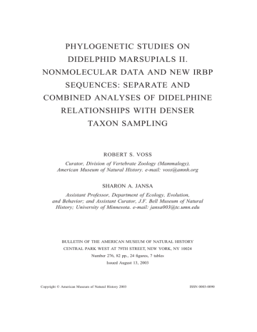 PHYLOGENETIC STUDIES ON DIDELPHID MARSUPIALS II. NONMOLECULAR DATA AND NEW IRBP SEQUENCES: SEPARATE AND COMBINED ANALYSES OF DIDELPHINE RELATIONSHIPS WITH DENSER TAXON SAMPLING ROBERT S. VOSS Curator, Division of Vertebrate Zoology (Mammalogy), American Museum of Natural History. e-mail: [email protected] SHARON A. JANSA Assistant Professor, Department of Ecology, Evolution, and Behavior; and Assistant Curator, J.F. Bell Museum of Natural History; University of Minnesota. e-mail: [email protected] BULLETIN OF THE AMERICAN MUSEUM OF NATURAL HISTORY CENTRAL PARK WEST AT 79TH STREET, NEW YORK, NY 10024 Number 276, 82 pp., 24 figures, 7 tables Issued August 13, 2003 Copyright q American Museum of Natural History 2003 ISSN 0003-0090 2 BULLETIN AMERICAN MUSEUM OF NATURAL HISTORY NO. 276 CONTENTS Abstract . . . . . . . . . . . . . . . . . . . . . . . . . . . . . . . . . . . . . . . . . . . . . . . . . . . . . . . . . . . . . . . . . . . . . . . Introduction . . . . . . . . . . . . . . . . . . . . . . . . . . . . . . . . . . . . . . . . . . . . . . . . . . . . . . . . . . . . . . . . . . . . Materials and Methods . . . . . . . . . . . . . . . . . . . . . . . . . . . . . . . . . . . . . . . . . . . . . . . . . . . . . . . . . . Taxon Sampling and Phylogenetic Assumptions . . . . . . . . . . . . . . . . . . . . . . . . . . . . . . . . . . Taxonomic Identifications . . . . . . . . . . . . . . . . . . . . . . . . . . . . . . . . . . . . . . . . . . . . . . . . . . . . . . Nonmolecular Character Survey and Coding Conventions . . . . . . . . . . . . . . . . . . . . . . . . . Molecular Sequencing and Character Coding . . . . . . . . . . . . . . . . . . . . . . . . . . . . . . . . . . . . Parsimony Methods . . . . . . . . . . . . . . . . . . . . . . . . . . . . . . . . . . . . . . . . . . . . . . . . . . . . . . . . . . Likelihood Methods . . . . . . . . . . . . . . . . . . . . . . . . . . . . . . . . . . . . . . . . . . . . . . . . . . . . . . . . . . Combined Analysis . . . . . . . . . . . . . . . . . . . . . . . . . . . . . . . . . . . . . . . . . . . . . . . . . . . . . . . . . . Online Data Archives . . . . . . . . . . . . . . . . . . . . . . . . . . . . . . . . . . . . . . . . . . . . . . . . . . . . . . . . Nonmolecular Characters and Analytic Results . . . . . . . . . . . . . . . . . . . . . . . . . . . . . . . . . . . . External Morphology . . . . . . . . . . . . . . . . . . . . . . . . . . . . . . . . . . . . . . . . . . . . . . . . . . . . . . . . . Cranium and Mandible . . . . . . . . . . . . . . . . . . . . . . . . . . . . . . . . . . . . . . . . . . . . . . . . . . . . . . . Dentition . . . . . . . . . . . . . . . . . . . . . . . . . . . . . . . . . . . . . . . . . . . . . . . . . . . . . . . . . . . . . . . . . . . Karyotypes . . . . . . . . . . . . . . . . . . . . . . . . . . . . . . . . . . . . . . . . . . . . . . . . . . . . . . . . . . . . . . . . . Dataset Summary and Analytic Results . . . . . . . . . . . . . . . . . . . . . . . . . . . . . . . . . . . . . . . . . Molecular Data and Analytic Results . . . . . . . . . . . . . . . . . . . . . . . . . . . . . . . . . . . . . . . . . . . . . Parsimony Analysis of IRBP Sequence Data . . . . . . . . . . . . . . . . . . . . . . . . . . . . . . . . . . . . Likelihood Analysis of IRBP Sequences . . . . . . . . . . . . . . . . . . . . . . . . . . . . . . . . . . . . . . . . Analysis of the Combined Data . . . . . . . . . . . . . . . . . . . . . . . . . . . . . . . . . . . . . . . . . . . . . . . . . Discussion . . . . . . . . . . . . . . . . . . . . . . . . . . . . . . . . . . . . . . . . . . . . . . . . . . . . . . . . . . . . . . . . . . . . Dataset Comparisons . . . . . . . . . . . . . . . . . . . . . . . . . . . . . . . . . . . . . . . . . . . . . . . . . . . . . . . . . Nonmolecular Evidence for Didelphine Relationships . . . . . . . . . . . . . . . . . . . . . . . . . . . . Effects of Denser Taxon Sampling . . . . . . . . . . . . . . . . . . . . . . . . . . . . . . . . . . . . . . . . . . . . . Likelihood Analysis . . . . . . . . . . . . . . . . . . . . . . . . . . . . . . . . . . . . . . . . . . . . . . . . . . . . . . . . . . Effects of Combining Nonmolecular and IRBP Data . . . . . . . . . . . . . . . . . . . . . . . . . . . . . The Marmosa Problem . . . . . . . . . . . . . . . . . . . . . . . . . . . . . . . . . . . . . . . . . . . . . . . . . . . . . . . Priorities for Future Research . . . . . . . . . . . . . . . . . . . . . . . . . . . . . . . . . . . . . . . . . . . . . . . . . A New Genus for ‘‘Marmosa’’ canescens . . . . . . . . . . . . . . . . . . . . . . . . . . . . . . . . . . . . . . . . . Tlacuatzin, new genus . . . . . . . . . . . . . . . . . . . . . . . . . . . . . . . . . . . . . . . . . . . . . . . . . . . . . . . . Acknowledgments . . . . . . . . . . . . . . . . . . . . . . . . . . . . . . . . . . . . . . . . . . . . . . . . . . . . . . . . . . . . . References . . . . . . . . . . . . . . . . . . . . . . . . . . . . . . . . . . . . . . . . . . . . . . . . . . . . . . . . . . . . . . . . . . . . Appendix 1: Morphological Specimens Examined . . . . . . . . . . . . . . . . . . . . . . . . . . . . . . . . . Appendix 2: New Specimens Sequenced for IRBP . . . . . . . . . . . . . . . . . . . . . . . . . . . . . . . . . Appendix 3: Notes on Identifications and Nomenclature . . . . . . . . . . . . . . . . . . . . . . . . . . . . Appendix 4: Rejected Nonmolecular Characters . . . . . . . . . . . . . . . . . . . . . . . . . . . . . . . . . . . Appendix 5: Nonmolecular Data Matrix . . . . . . . . . . . . . . . . . . . . . . . . . . . . . . . . . . . . . . . . . . 3 3 6 6 7 8 10 11 11 11 12 12 12 22 34 42 44 48 49 52 52 55 55 56 57 57 58 59 60 61 61 65 66 74 77 77 79 81 2003 VOSS AND JANSA: DIDELPHID PHYLOGENY 3 ABSTRACT In order to test the results of a previous study of didelphid marsupial phylogeny based on IRBP nuclear gene sequences (Jansa and Voss, 2000. Phylogenetic studies on didelphid marsupials I. Introduction a