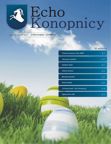 styczeń - marzec 2010 Informator Gminny W wydaniu: Podsumowanie roku 2009 str. 3 Strażacki opłatek str. 4 Budżet 2010 str. 5 Dzień seniora str. 8 Bal gimnazjalny str. 8 Dzień kobiet str. 9 „Schetynówki” dla Konopnicy str. 10 Ogłoszenie LGD str. 11 Z okazji Świąt Wielkiej Nocy życzymy wszystkim mieszkańcom Gminy Konopnica zdrowia i pomyślności. Niech ten wyjątkowy czas Zmartwychwstania Pańskiego upłynie Wam w rodzinnym gronie, w szczęściu i radości. Wójt Mirosław Żydek Zastępca Wójta Konrad Banach Przewodniczący Rady Gminy Andrzej Duda Podsumowanie roku 2009 Minął kolejny rok pracy naszych gminnych samorządowców. Czas podsumować ostatnie dwanaście miesięcy pod względem inwestycji rozpoczętych i zrealizowanych w Konopnicy. Tegoroczna ocena będzie szczególnie ważna z punktu widzenia zbliżających się wyborów, dlatego sumiennie przedstawiamy naszym czytelnikom co zmieniło się w Konopnicy w 2009 roku. Ludność Od lat obserwujemy tendencję wzrostową w liczbie mieszkańców Konopnicy. Aż trudno uwierzyć, że od 2006 r. liczba naszych mieszkańców wzrosła o prawie pół tysiąca. W roku 2009 mieliśmy 11 506 obywateli konopnickich. Warto podkreślić, że nasza gmina to jeden z najchętniej wybieranych adresów przez przesiedlających się mieszkańców Lublina. Wpływ na ten fakt ma nie tylko bliskość miasta, ale również stale rosnący komfort życia jaki oferuje nasza gmina: nowe drogi, wyremontowane placówki oświatowe, sprawnie działający urząd. Infrastruktura drogowa Wyremontowana i zmodernizowana sieć dróg komunikacyjnych to podstawowe kryterium oceny pracy samorządowców. W obecnej dobie motoryzacji przeciętna rodzina posiada minimum jeden samochód i siłą rzeczy staliśmy się codziennymi użytkownikami dróg. Od ich stanu zależy nie tylko komfort naszej jazdy, ale przede wszystkim jej bezpieczeństwo. Od 2007 do 2009 roku włącznie Gmina Konopnica wydatkowała łącznie ponad 5,5 mln złotych na modernizację i budowę dróg gminnych, tj. ponad 16 km. W tym samym okresie, wspólnie z Powiatem Lubelskim wykonała 15 km dróg, z finansowym wkładem naszej gminy w wysokości 2,3 mln złotych. Oświetlenie drogowe zaprojektowane i wykonane zostało na odcinku ok. 20 km. Poza finansowaniem budżetowym, nasza gmina pozyskała na cele rozbudowy i modernizacji infrastruktury drogowej środki z Funduszu Ochrony Gruntów Rolnych, Regionalnego Programu Operacyjnego Województwa Lubelskiego, MSWiA i Narodowego Programu Przebudowy Dróg Lokalnych. Zemborzyce Tereszyńskie, Wojciechowskie, Dolne i Radawiec Mały. W celu uniezależnienia się od operatorów zewnętrznych dostarczających wodę na teren Gminy Konopnica podjęta została decyzja o remoncie stacji uzdatniania wody w Szerokim i budowie takiej stacji w Radawcu Dużym. Na zadania te Gmina Konopnica pozyskała środki w ramach Zintegrowanego Programu Operacyjnego Rozwoju Regionalnego, Programu Rozwoju Obszarów Wiejskich, Wojewódzkiego Funduszu Ochrony Środowiska i Gospodarki Wodnej, a także z Budżetu Państwa. Oświata i infrastruktura sportowa W naszej gminie znajduje się pięć szkół podstawowych i gimnazjum. Na utrzymanie placówek Gmina przeznacza 9 mln złotych rocznie. Dodatkowo, na sfinansowanie remontów budynków szkolnych oraz obiektów sportowych oraz zajęcia pozalekcyjne pozyskane zostały środki ze Zintegrowanego Programu Operacyjnego Rozwoju Regionalnego, z Europejskiego Funduszu Społecznego Kapitału Ludzkiego, z Ministerstwa Edukacji Narodowej, z Funduszu Rozwo j u Ku l t u r y F i zyc z n e j i S p o r t u , z Powiatowego Centrum Pomocy Rodzinie oraz Wojewódzkiego Funduszu Ochrony Środowiska i Gospodarki Wodnej. W ramach umowy z Ministerstwem Kultury i Dziedzictwa Narodowego w roku 2009 Gmina Konopnica zrealizowała remont budynku domu kultury w Motyczu i adaptacje budynku w OSP w Radawczyku Drugim na potrzeby Ośrodka Działań Twórczych. Całkowity koszt zadania wynosił ponad 450 000 zł z czego środki finansowe MKiDN w kwocie ponad 270 000 zł. Równocześnie zakupione zostało wyposażenie (meble, urządzenia służące do edukacji młodzieży) za blisko 100 000 zł, które w całości pochodzą z dotacji MKiDN. Straż Pożarna Wodociągi i kanalizacje W naszej Gminie znajduje się 11 jednostek Ochotniczej Straży Pożarnej: w Radawczyku Drugim, Konopnicy, Kozubszczyźnie, Motyczu, Motyczu Leśnym, Pawlinie, Szerokim, Tereszynie, Zemborzycach Tereszyńskich, Uniszowicach i Radawcu Dużym. Budżetowe nakłady na ochronę przeciwpożarową wyniosły w 2009r. 583 000 zł. W roku bieżącym planuje się ponad dwukrotne ich zwiększenie do kwoty 1 364 000 złotych, w związku z projektem realizowanym z RPO na zakup samochodu wraz z wyposażeniem dla jednostki OSP będącej w Krajowym Systemie Ratowniczo-Gaśniczym. Program sanitacji wsi poprzez budowę kanalizacji zbiorczych oraz przydomowych oczyszczalni ścieków rozpoczęty został na przełomie 2006/2007 roku. Do tej pory zrealizowane zostały kanalizacje we wsi Stasin a w 2010r. rozpoczną się w miejscowości Konopnica. Równolegle z kanalizacją zbiorczą powstaje 158 sztuk przydomowych oczyszczalni w miejscowościach Pawlin, W obecnej kadencji pozyskano samochody pożarnicze: 2006r. - Ford Transit z dotacją Zarządu Głównego ZOSP dla OSP Zemborzyce Tereszyńskie. 2007r - Ford Transit z dotacją Zarządu Głównego ZOSP dla OSP Pawlin. 2008r - Mercedes Benz z dotacją Zarządu Głównego ZOSP dla OSP Kozubszczyzna, - Star 244 przekazany z KM PSP w Lublinie. 2009r. - Star 244 przekazany z OSP Pawlin do OSP Konopnica, - Star 26 przekazany do celów szkoleniowych do OSP Tereszyn. W maju ubiegłego roku oddana została również do użytku odremontowana strażnica w Radawcu Dużym, Radawczyku Drugim i Zemborzycach Tereszyńskich. Tak, w telegraficznym skrócie, prezentował się rok 2009 jeśli chodzi o pracę i osiągnięcia naszych samorządowców. Musimy bowiem pamiętać, że od ic