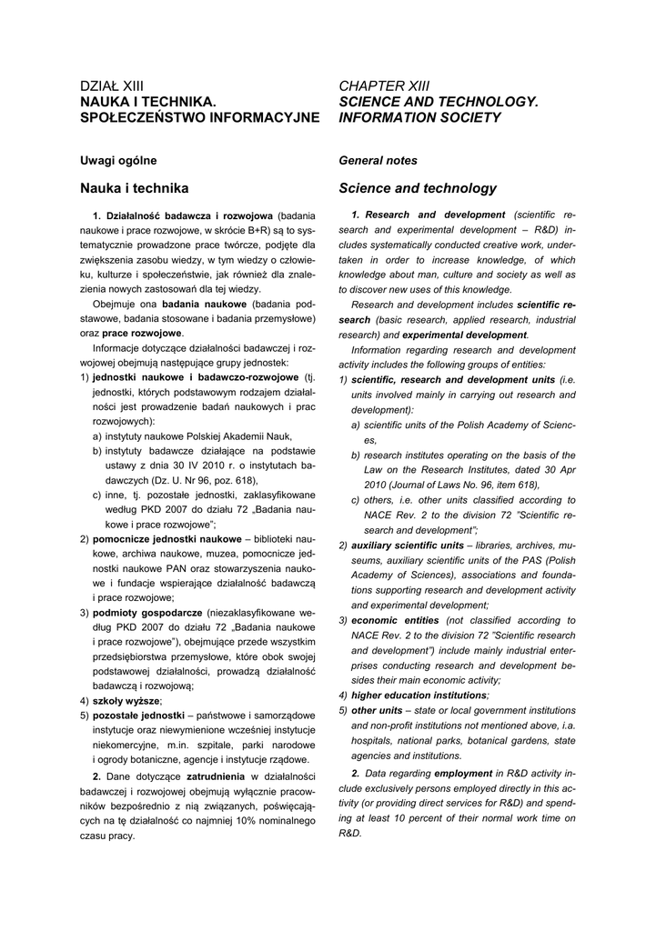 DZIAŁ XIII NAUKA I TECHNIKA. SPOŁECZEŃSTWO INFORMACYJNE CHAPTER XIII SCIENCE AND TECHNOLOGY. INFORMATION SOCIETY Uwagi ogólne General notes Nauka i technika Science and technology 1. Działalność badawcza i rozwojowa (badania naukowe i prace rozwojowe, w skrócie B+R) są to systematycznie prowadzone prace twórcze, podjęte dla zwiększenia zasobu wiedzy, w tym wiedzy o człowieku, kulturze i społeczeństwie, jak również dla znalezienia nowych zastosowań dla tej wiedzy. Obejmuje ona badania naukowe (badania podstawowe, badania stosowane i badania przemysłowe) oraz prace rozwojowe. Informacje dotyczące działalności badawczej i rozwojowej obejmują następujące grupy jednostek: 1) jednostki naukowe i badawczo-rozwojowe (tj. jednostki, których podstawowym rodzajem działalności jest prowadzenie badań naukowych i prac rozwojowych): a) instytuty naukowe Polskiej Akademii Nauk, b) instytuty badawcze działające na podstawie ustawy z dnia 30 IV 2010 r. o instytutach badawczych (Dz. U. Nr 96, poz. 618), c) inne, tj. pozostałe jednostki, zaklasyfikowane według PKD 2007 do działu 72 „Badania naukowe i prace rozwojowe”; 2) pomocnicze jednostki naukowe – biblioteki naukowe, archiwa naukowe, muzea, pomocnicze jednostki naukowe PAN oraz stowarzyszenia naukowe i fundacje wspierające działalność badawczą i prace rozwojowe; 3) podmioty gospodarcze (niezaklasyfikowane według PKD 2007 do działu 72 „Badania naukowe i prace rozwojowe”), obejmujące przede wszystkim przedsiębiorstwa przemysłowe, które obok swojej podstawowej działalności, prowadzą działalność badawczą i rozwojową; 4) szkoły wyższe; 5) pozostałe jednostki – państwowe i samorządowe instytucje oraz niewymienione wcześniej instytucje niekomercyjne, m.in. szpitale, parki narodowe i ogrody botaniczne, agencje i instytucje rządowe. 2. Dane dotyczące zatrudnienia w działalności badawczej i rozwojowej obejmują wyłącznie pracowników bezpośrednio z nią związanych, poświęcających na tę działalność co najmniej 10% nominalnego czasu pracy. 1. Research and development (scientific research and experimental development – R&D) includes systematically conducted creative work, undertaken in order to increase knowledge, of which knowledge about man, culture and society as well as to discover new uses of this knowledge. Research and development includes scientific research (basic research, applied research, industrial research) and experimental development. Information regarding research and development activity includes the following groups of entities: 1) scientific, research and development units (i.e. units involved mainly in carrying out research and development): a) scientific units of the Polish Academy of Sciences, b) research institutes operating on the basis of the Law on the Research Institutes, dated 30 Apr 2010 (Journal of Laws No. 96, item 618), c) others, i.e. other units classified according to NACE Rev. 2 to the division 72 ”Scientific research and development”; 2) auxiliary scientific units – libraries, archives, museums, auxiliary scientific units of the PAS (Polish Academy of Sciences), associations and foundations supporting research and development activity and experimental development; 3) economic entities (not classified according to NACE Rev. 2 to the division 72 ”Scientific research and development”) include mainly industrial enterprises conducting research and development besides their main economic activity; 4) higher education institutions; 5) other units – state or local government institutions and non-profit institutions not mentioned above, i.a. hospitals, national parks, botanical gardens, state agencies and institutions. 2. Data regarding employment in R&D activity include exclusively persons employed directly in this activity (or providing direct services for R&D) and spending at least 10 percent of their normal work time on R&D. Ekwiwalenty pełnego czasu pracy (EPC) są to jednostki przeliczeniowe służące do ustalenia faktycznego zatrudnienia w działalności badawczo-rozwojowej. Jeden ekwiwalent pełnego czasu pracy oznacza jeden osoborok poświęcony wyłącznie na działalność badawczo-rozwojową. 3. Nakłady na działalność badawczą i rozwojową obejmują nakłady bieżące poniesione na badania podstawowe, stosowane i prace rozwojowe oraz nakłady inwestycyjne na środki trwałe związane z działalnością B+R, niezależnie od źródła pochodzenia środków finansowych. Nakłady bieżące od 2003 r. podaje się bez kosztów zakupu lub wytworzenia aparatury naukowo-badawczej, spełniającej kryteria zaliczania do środków trwałych, niezbędnej do wykonania określonych prac B+R, lecz zgodnie z rozporządzeniem Ministra Nauki i Informatyzacji z dnia 4 sierpnia 2005 (Dz. U. Nr 161, poz. 1359) do czasu zakończenia tych prac nieujętej w ewidencji środków trwałych jednostki. Koszty te ujmowane są w nakładach inwestycyjnych na środki trwałe. 4. Dane o nakładach na działalność badawczą i rozwojową według źródeł finansowania opracowano zgodnie z metodologią stosowaną przez EUROSTAT i obejmują następujące sektory finansujące, z których pochodzą środki na finansowanie działalności badawczej i rozwojowej: 1) sektor rządowy krajowe jednostki rządowe (m.in. ministerstwa) i samorządowe, (w tym jednostki samorządu terytorialnego), jednostki naukowe PAN i instytuty badawcze podlegające ministerstwom, powołane na podstawie ustawy o instytutach badawczych (Dz. U. 2010 Nr 96, poz. 618), 2) sektor przedsiębiorstw krajowe podmioty gospodarcze, 3) sektor szkolnictwa wyższego krajowe szkoły wyższe oraz podległe im instytuty badawcze, stacje doświadczalne i kliniki, 4) sektor prywatnych instytucji niekomercyjnych krajowe: fundacje, partie polityczne, związki zawodowe, związki konsumentów, towarzystw i stowarzyszeń (zawodowych, naukowych, religijnych itp.) oraz osoby fizyczne, 5) zagranica organizacje 