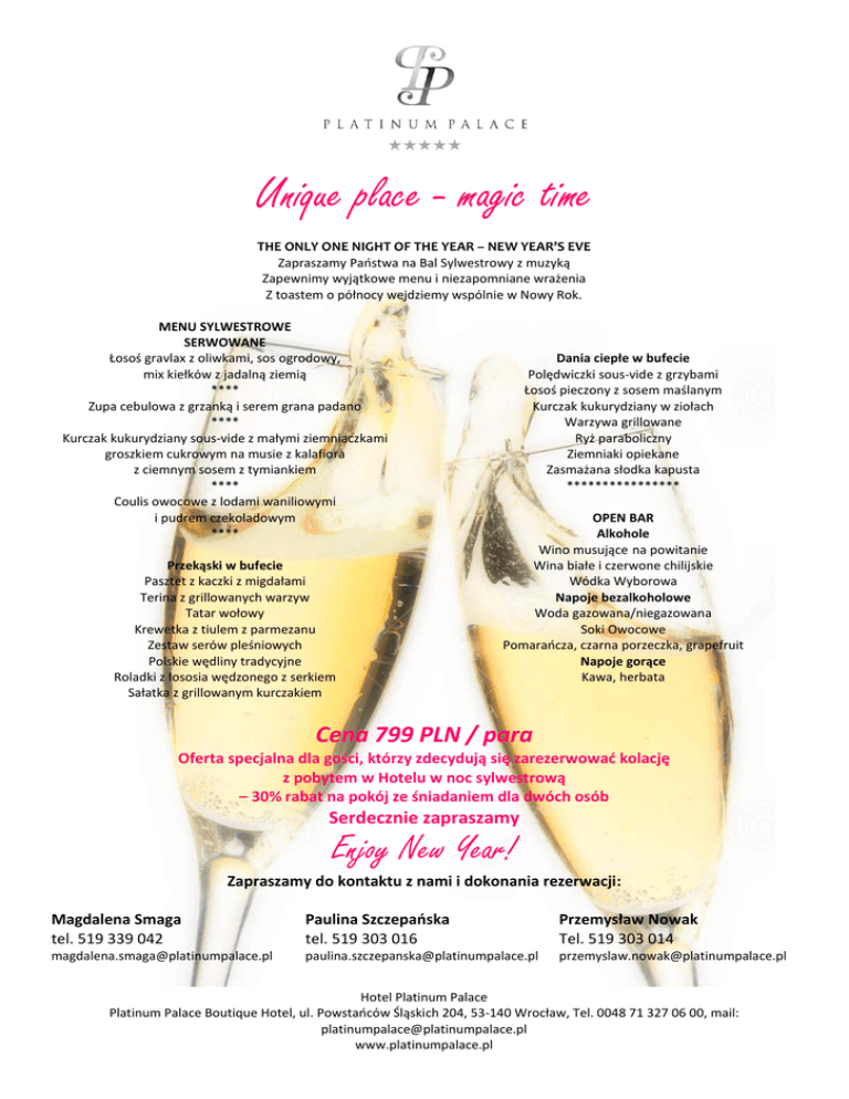 Unique place - magic time THE ONLY ONE NIGHT OF THE YEAR – NEW YEAR’S EVE Zapraszamy Państwa na Bal Sylwestrowy z muzyką Zapewnimy wyjątkowe menu i niezapomniane wrażenia Z toastem o północy wejdziemy wspólnie w Nowy Rok. MENU SYLWESTROWE SERWOWANE Łosoś gravlax z oliwkami, sos ogrodowy, mix kiełków z jadalną ziemią **** Zupa cebulowa z grzanką i serem grana padano **** Kurczak kukurydziany sous-vide z małymi ziemniaczkami groszkiem cukrowym na musie z kalafiora z ciemnym sosem z tymiankiem **** Coulis owocowe z lodami waniliowymi i pudrem czekoladowym **** Przekąski w bufecie Pasztet z kaczki z migdałami Terina z grillowanych warzyw Tatar wołowy Krewetka z tiulem z parmezanu Zestaw serów pleśniowych Polskie wędliny tradycyjne Roladki z łososia wędzonego z serkiem Sałatka z grillowanym kurczakiem Dania ciepłe w bufecie Polędwiczki sous-vide z grzybami Łosoś pieczony z sosem maślanym Kurczak kukurydziany w ziołach Warzywa grillowane Ryż paraboliczny Ziemniaki opiekane Zasmażana słodka kapusta **************** OPEN BAR Alkohole Wino musujące na powitanie Wina białe i czerwone chilijskie Wódka Wyborowa Napoje bezalkoholowe Woda gazowana/niegazowana Soki Owocowe Pomarańcza, czarna porzeczka, grapefruit Napoje gorące Kawa, herbata Cena 799 PLN / para Oferta specjalna dla gości, którzy zdecydują się zarezerwować kolację z pobytem w Hotelu w noc sylwestrową – 30% rabat na pokój ze śniadaniem dla dwóch osób Serdecznie zapraszamy Enjoy New Year! Zapraszamy do kontaktu z nami i dokonania rezerwacji: Magdalena Smaga tel. 519 339 042 Paulina Szczepańska tel. 519 303 016 Przemysław Nowak Tel. 519 303 014 [email protected] [email protected] [email protected] Hotel Platinum Palace Platinum Palace Boutique Hotel, ul. Powstańców Śląskich 204, 53-140 Wrocław, Tel. 0048 71 327 06 00, mail: [email protected] www.platinumpalace.pl