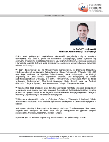 ePOLSKA XX LAT PÓŹNIEJ dr Rafał Trzaskowski Minister Administracji i Cyfryzacji Doktor nauk politycznych, wykładowca akademicki specjalizujący się w tematyce europejskiej. Od 2009 r. poseł do Parlamentu Europejskiego, gdzie zajmował się sprawami związanymi z realizacją traktatów UE, unijnym budżetem, ochroną prywatności i Europejską Agendą Cyfrową oraz przepisami o ponownym wykorzystywaniu informacji sektora publicznego. W 2004 doktoryzował się na Uniwersytecie Warszawskim, w Instytucie Stosunków Międzynarodowych na Wydziale Dziennikarstwa i Nauk Politycznych. W latach 1991-1996 równolegle studiował na Wydziale Dziennikarstwa, Nauk Politycznych oraz Filologii Angielskiej. W 2002 uzyskał stypendium Instytutu Unii Europejskiej ds. Badań nad Bezpieczeństwem w Paryżu, a w 1996 – Uniwersytetu w Oxfordzie. Uczył się także w Stanach Zjednoczonych (Cranbrook-Kingswood High School) oraz w Australii (Marcellin College w Sydney). Jest absolwentem College d’Europe w Natolinie. W latach 2000-2001 pracował jako doradca Sekretarza Komitetu Integracji Europejskiej w gabinecie szefa Urzędu Komitetu Integracji Europejskiej. Od 2004 do 2009 był doradcą przewodniczącego Komisji Spraw Zagranicznych Parlamentu Europejskiego oraz Delegacji Platformy Obywatelskiej w Parlamencie Europejskim. Wykładowca akademicki, m.in. w Collegium Civitas w Warszawie i Krajowej Szkole Administracji Publicznej. Przez wiele lat był również analitykiem w Centrum Europejskim – Natolin. Jest synem pianisty i kompozytora jazzowego Andrzeja Trzaskowskiego. Sam mówi, że jemu słoń nadepnął na ucho, choć ma je niewątpliwie do języków obcych: zna angielski, francuski, hiszpański, rosyjski i włoski. Prywatnie jest szczęśliwym mężem i ojcem Oli i Stasia. Ma jeden nałóg: książki. Sekretariat Forum: BizTech Konsulting SA, 01-018 Warszawa, ul. Wolność 3A, tel. 22 100 10 01, fax 22 100 10 99 e-mail: [email protected], www.forumti.pl
