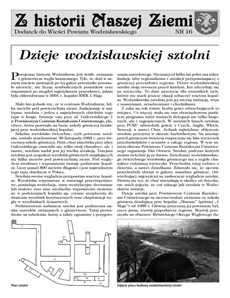 Z historii Naszej Ziemi Dodatek do Wieści Powiatu Wodzisławskiego NR 16 Dzieje wodzisławskiej sztolni P owojenna historia Wodzisławia jest ściśle związana z górnictwem węgla kamiennego. Tyle, że dziś w sa− mym mieście pamiątek po tej gałęzi przemysłu pozosta− ło niewiele, nie licząc symbolicznych pomników oraz wspomnień po niegdyś największym pracodawcy, jakim była zlikwidowana w 2001 r. kopalni KWK 1 Maja. Mało kto jednak wie, że w centrum Wodzisławia, kil− ka metrów pod powierzchnią ziemi, funkcjonuje w naj− lepsze sztolnia – jeden z największych obiektów tego typu w kraju. Istnieje ona przy ul. Gałczyńskiego 1 w Powiatowym Centrum Kształcenia Ustawicznego, pla− cówce, która powstała na bazie szkoły górniczej działa− jącej przy wodzisławskiej kopalni. Szkolne wyrobisko ćwiczebne, czyli potocznie sztol− nia, zostało uruchomione 30 listopada 1984 r. przy ów− czesnej szkole górniczej. Dziś, choć placówka przy ulicy Gałczyńskiego zmieniła nie tylko swój charakter, ale i nazwę, sztolnia nadal jest jej wielką atrakcją. Tutejsza sztolnia jest zespołem wyrobisk górniczych znajdujących się kilka metrów pod powierzchnią ziemi. Pod wzglę− dem struktury i wyposażenia imituje podziemie kopal− ni. Liczy ponad 500 metrów długości i jest największym tego typu obiektem w Polsce. Sztolnia swoim wyglądem przypomina wnętrze kopal− ni. Wyrobiska wyposażone w rurociągi przeciwpożaro− we, posiadają wentylację, tamy wentylacyjne drewniane lub stalowe oraz inne niezbędne wyposażenie stosowa− ne w podziemiach kopalni np. czynne urządzenia do drążenia wyrobisk korytarzowych oraz eksploatacji wę− gla w wyrobiskach ścianowych. Podstawowym zadaniem sztolni jest praktyczna na− uka zawodów związanych z górnictwem. Tutaj prowa− dzone są szkolenia, kursy a także egzaminy z przygoto− wania zawodowego. Niemniej od kilku lat pełni ona także funkcję izby regionalizmu i atrakcji przypominającej o górniczej przeszłości regionu. Drzwi wodzisławskiej sztolni stoją otworem przed każdym, kto zdecyduje się na wycieczkę. To duże przeżycie dla wszystkich tych, którzy nie mieli jeszcze okazji zobaczyć wnętrza kopal− ni. Wodzisławska sztolnia jest jej wierną imitacją, wraz z maszynami, urządzeniami i chodnikami. Z roku na rok rośnie liczba gości odwiedzających to miejsce. Co więcej, stała się ona obowiązkowym punk− tem programu wizyt ważnych delegacji nie tylko krajo− wych, ale i zagranicznych. W ostatnich latach sztolnię przy PCKU odwiedzili goście z Czech, Anglii, Włoch, Szwecji, a nawet Chin. Jednak największe oblężenie sztolnia przeżywa w okresie barbórkowym. Na miesiąc przed górniczym świętem rozpoczyna się fala wycieczek przedszkolaków i uczniów z całego regionu. W tym sa− mym okresie Powiatowe Centrum Kształcenia Ustawicz− nego organizuje Dni Otwarte Sztolni, podczas których można zwiedzić ją za darmo. Zwiedzanie wodzisławskie− go ćwiczebnego wyrobiska górniczego ma z reguły cha− rakter rodzinnej wycieczki. Przychodzą tutaj rodzice z dziećmi, a nawet dziadkami. Zdarzało się, że ojcowie przychodzili ubrani w galowe mundury górnicze. Od− wiedzający najczęściej są zaskoczeni wyglądem sztolni. Dziwią się też, że choć mieszkają w okolicy od dziecka, nie mieli pojęcia, że coś takiego jak sztolnia w Wodzi− sławiu istnieje. Dzieje sztolni przy Powiatowym Centrum Kształce− nia Ustawicznego są nierozerwalnie związane ze szkołą górniczą działającą przy kopalni „Mszana” (później „1 Maja”) od 1955 r. Główną przyczyną jej powstania był, rzecz jasna, rozwój gospodarczy regionu. Rozwój prze− mysłu na obszarze Rybnickiego Okręgu Węglowego da− Plan sztolni Zdjęcie placu budowy wodzisławskiej sztolni tuje się od XIII w., gdy na tym terenie powstały pierw− sze odlewnie, kuźnie i cegielnie. Zmiana oblicza gospo− darczego Wodzisławia Śl. nastąpiła na przełomie XVIII i XIX w. W tym okresie w rejonie miasta rozwijał się przemysł wydobywczy i hutniczy. W wyniku odkrycia po− kładów węgla kamiennego uruchomiono na przełomie tych stuleci pierwsze okoliczne kopalnie. Po zakończeniu II wojny światowej nastąpił przełom. Duże obiekty przemysłowe Śląska objęto intensywną odbudową w związku z planem trzyletnim (1947−49) oraz sześcioletnich (1950−55). W 1952 r. Komitet Ekonomicz− ny Rady Ministrów podjął uchwałę o rozbudowie Ryb− nickiego Okręgu Węglowego. W następstwie tej decyzji oddano do eksploatacji cztery kopalnie: w Szczygłowi− cach, Jastrzębiu, Moszczenicy i Wodzisławiu Śl. („Msza− na”). Budowę kopalni „Mszana” rozpoczęto w 1952 r., a w 1960 r. jej nazwę zmieniono na „1 Maja”. Szybki rozwój górnictwa spowodował konieczność przygotowania odpowiednio wykształconych kadr. W związku z tym Centralny Zarząd Szkolenia Zawodowe− go Ministerstwa Górnictwa i Energetyki przeprowadził wstępne rozmowy z Centralnym Zarządem Przedsiębior− stwa Budowy Kopalń w Mikołowie w sprawie otwarcia zasadniczej Szkoły Górniczej przy kopalni „Mszana”. Datę otwarcia szkoły ustalono na 1 września 1955 r. Pierwszym dyrektorem szkoły został Karol Adamek. Początki były trudne. Wiązało się to z niedomogami infrastruktury materialno−dydaktycznej. W latach 1955− 72 Zasadnicza Szkoła Górnicza funkcjonowała w 3 ba− rakach, mieszczących się przy kopalni na Wilchwach. Baraki były murowane, składały się z 6 sal o powierzch− ni 42 m kw., 7 pokoi 21 m kw., sieni i korytarza. Udo− stępnione były 3 sale wykładowe, sekretariat, kancela− ria dyrektora oraz pokój nauczycielski. Dodatkowy ba− rak stanowiła świetlica kopalniana, która pełniła także funkcję biblioteki. Biblioteka szkolna została otwarta dopiero w styczniu 1956 r. i liczyła 526 książek. W pierwszym roku szkolnym 1955/56 naukę rozpo− częły 2