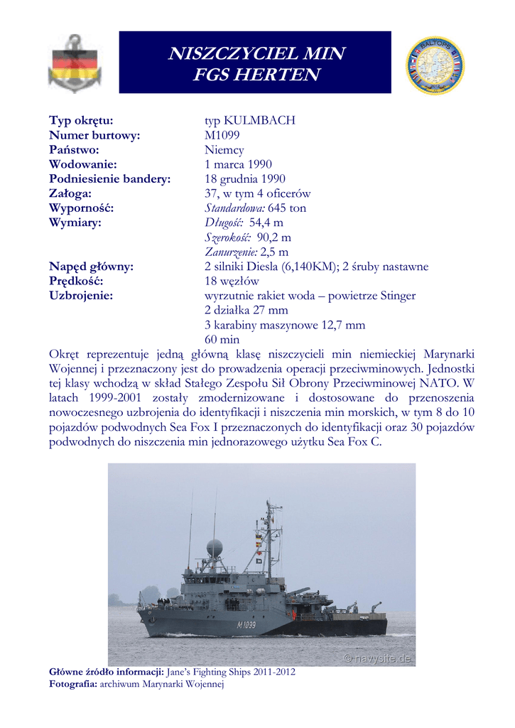NISZCZYCIEL MIN FGS HERTEN Typ okrętu: Numer burtowy: Państwo: Wodowanie: Podniesienie bandery: Załoga: Wyporność: Wymiary: typ KULMBACH M1099 Niemcy 1 marca 1990 18 grudnia 1990 37, w tym 4 oficerów Standardowa: 645 ton Długość: 54,4 m Szerokość: 90,2 m Zanurzenie: 2,5 m Napęd główny: 2 silniki Diesla (6,140KM); 2 śruby nastawne Prędkość: 18 węzłów Uzbrojenie: wyrzutnie rakiet woda – powietrze Stinger 2 działka 27 mm 3 karabiny maszynowe 12,7 mm 60 min Okręt reprezentuje jedną główną klasę niszczycieli min niemieckiej Marynarki Wojennej i przeznaczony jest do prowadzenia operacji przeciwminowych. Jednostki tej klasy wchodzą w skład Stałego Zespołu Sił Obrony Przeciwminowej NATO. W latach 1999-2001 zostały zmodernizowane i dostosowane do przenoszenia nowoczesnego uzbrojenia do identyfikacji i niszczenia min morskich, w tym 8 do 10 pojazdów podwodnych Sea Fox I przeznaczonych do identyfikacji oraz 30 pojazdów podwodnych do niszczenia min jednorazowego użytku Sea Fox C. Główne źródło informacji: Jane’s Fighting Ships 2011-2012 Fotografia: archiwum Marynarki Wojennej