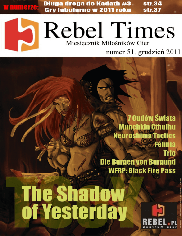 Rebel Times Wydawca: REBEL.pl Redaktor naczelny: Tomasz 'Sting' Chmielik Zastępca redaktora naczelnego: Marcin 'ajfel' Zawiślak Redakcja i korekta tekstów: Hubert Bartos Tomasz 'Sting' Chmielik Marcin 'Seji' Segit Redakcja: Michał 'de99ial' Romaniuk Mateusz 'Darcane' Nowak Arkady Saulski Rafał Cholewa Mateusz 'JAskier' Pitulski Tomasz 'Gambit' Dobosz Maciej 'repek' Reputakowski Andrzej 'ShadEnc' Stój Marcin 'Ezechiel' Zaród Cezary Domalski Grafika, skład: Marcin 'ajfel' Zawiślak Redakcja zastrzega sobie prawo do skracania i adiustacji tekstów oraz zmiany tytułów. Materiałów nie zamówionych, nie zwracamy. Przedruk z gazety dozwolony jest jedynie za pisemną zgodą wydawcy. Redakcja nie odpowiada za treść reklam i ogłoszeń. Wydawca ma prawo odmówić zamieszczenia ogłoszenia i reklamy, jeśli ich treść lub forma są sprzeczne z linią programową lub charakterem pisma oraz interesem wydawcy [art. 36 pkt 4 Prawa Prasowego]. Czekamy na Wasze opinie i komentarze. Kierujcie je na nasz adres: [email protected] 2 Serdecznie witam Was w grudniowym numerze Rebel Timesa. Grudzień to miesiąc specyficzny, głównie za sprawą Świąt i ogromnej machiny marketingowej, która już chyba na stałe wpisała się w ich tradycję. Zawsze, gdy o tym myślę, dopada mnie smutna refleksja, że ciepłych i rodzinnych spotkań w gronie najbliższych można już tylko doświadczyć w… reklamach telewizyjnych, które chcą nam sprzedać jakieś produkty, odwołując się do nostalgicznych obrazów zakodowanych gdzieś głęboko w naszej podświadomości. Strzelam w ciemno, że większość z nas ruszy do centrów handlowych lub internetowych sklepów, aby odbyć coroczny rytuał zakupowy (część pewnie ma to już za sobą). Być może lektura niniejszego numeru pozwoli Wam rozsądnie wybrać prezent, z którego wasi najbliżsi będą mieli ogromną frajdę. Zresztą nie tylko oni! Jak już wypakujecie wszystkie te wspaniałe gry z ozdobnego papieru, zorganizujcie jakiś stół i wypróbujcie je zaraz po wigilijnej kolacji. Cóż może być bowiem lepszego od zebrania całej rodziny przy grach, które angażują bez reszty? Ponowne obejrzenie „Kevina samego w domu” w telewizji? Szczerzę wątpię. Życzę Wam wszystkim zdrowych i wesołych świąt oraz udanego Sylwestra. Do zobaczenia za miesiąc! Grudzień 2011 Nr 51, Grudzień 2011 Spis treści 25 Gdzie wasze kości porzucone Die Burgen von Burgund 2 Wstępniak ... czyli jak zwykle kilka słów na początek 4 Aktualności … czyli co nowego w świecie gier 8 Cudów nie ma 7 Cudów Świata 11 14 Horror na wesoło Postapokalipsa w sosie fantastycznym The Shadow of Yesterday 31 Toporem i kuflem WFRP: Black Fire Pass 34 Napisane, by straszyć Długa droga do Kadath #3 Munchkin Cthulhu 37 Gry fabularne w 2011 roku Figurkowa Neuroshima 42 Plany na styczeń Neuroshima Tactics 21 28 czyli: co w następnym numerze? Wiek odkryć na kocich wyspach Felinia 23 Szalony zawrót głowy Trio 3 Rebel Times Aktualności Władcy i Pupile Podziemi, czyli dwie gry Vlaady Chvatila po polsku stycznych klimatach. Tym razem jednak, zamiast zarządzać kompleksem podziemi wypełnionych potworami i pułapkami, wcielamy się w chochlika, który postanowił zbić fortunę, otwierając sklep zoologiczny dla władców podziemi. Prowadzenie interesu jest dla chochlika całkiem fajną sprawą, ale też sporym wyzwaniem intelektualnym. W jaki sposób przechytrzyć konkurentów i wygrać zbliżający się pokaz? Który zwierzak znajdzie największe uznanie w oczach klienta? Jak wytrzymałe muszą być klatki? Ilu pracowników wyląduje w szpitalu, jeśli źle to ocenisz? Gra przeznaczona jest dla 2-4 graczy w wieku od 13 lat. Czas rozgrywki to około 90 minut. Galakta pod choinką Dużo pisaliśmy o bliższych i dalszych planach wydawnictwa Galakta dotyczących polskich edycji gier wydawnictwa Fantasy Flight Games. Cztery z zapowiadanych tytułów trafiły do sprzedaży z początkiem grudnia, a więc mogą znaleźć się wśród gwiazdkowych prezentów. Są to: Blood Bowl: Menadżer Drużyny, Gears of War: Gra planszowa, Rune Age oraz nowa edycja Dust Tactics. Przed świętami trafi także do sprzedaży planszowa Gra o Tron. Polska edycja Dungeon Lords zapowiadana była już dawno. Wydawnictwo Rebel zrekompensowało nam znaczne opóźnienie premiery, tuż przed gwiazdką wysyłając do sprzedaży ten długo oczekiwany tytuł (rodzimy tytuł brzmi Władcy Podziemi) wraz z Pupilami Podziemi, polską edycją drugiej planszówki Vlaady Chvatila (czyli wydanej w tym roku Dungeon Petz). O Dungeon Lords sporo napisaliśmy już na łamach Rebel Timesa. Drugi tytuł to podobna konwencja, dostajemy zatem kolejną poważną strategię w niepoważnych, humory- 4 Grudzień 2011 Figurkowy Wolsung Wielki powrót War of the Ring Dla fanów Wolsunga od dłuższego czasu dostępne są na rynku efektowne, steampunkowe figurki wykonane przez Micro Art Studio. Mogą one stanowić cieszący oko gadżet dla kolekcjonerów, jak również sympatyczną pomoc na wolsungowych sesjach. To jednak nie wszystko, trwają bowiem pracę nad figurkowym skirmishem w świecie Wolsunga. Ku uciesze fanów na Gwiazdkę została udostępniona przez Micro Art Studio wersja beta zasad tejże gry. Dokument w języku angielskim można pobrać pod adresem: http://www.wolsung-ssg.com/?p=21 Włoskie wydawnictwo Ares Games powstało w tym roku, zapowiadając wydanie nowych edycji gier pierwotnie wydanych przez Nexus. Pierwszą z nich będzie nowa odsłona nieco przebrzmiałego hitu War of the Ring (dużej planszowej strategii dla dwóch osób wydanej w 2004 roku, której akcja dzieje się, rzecz jasna, w Tolkienowskim Śródziemiu). Polskich graczy z pewnością ucieszy fakt, że nakładem Galakty gra ta ukaże się także po polsku. Premiera będzie miała miejsce wiosną, równolegle z wersją włoskiej, niemieckiej i hiszpańskiej. Co dalej z polską edycją Dungeons&Dragons? Ku ogromnemu zaskoczeniu polskich f
