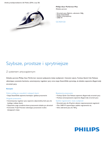 Ulotka przedsprzedażowa dla Polska (2016, Luty 20) Philips Azur Performer Plus Żelazko parowe • Strumień pary 45g/min, uderzenie 160g • Stopa SteamGlide • System antywapienny • 2400 W GC4501/20 Szybsze, prostsze i sprytniejsze Z systemem antywapiennym Żelazko parowe Philips Azur Performer stanowi połączenie dużej wydajności i łatwości użycia. Funkcja Quick Calc Release ułatwiająca usuwanie kamienia, automatyczny regulator pary oraz stopa SteamGlide sprawiają, że żelazko zapewnia długotrwały strumień pary. Korzyści Dobry poślizg po wszystkich rodzajach tkanin Bezpieczne prasowanie • Stopa SteamGlide zapewnia łatwiejsze i gładsze prasowanie • Funkcja Quick Calc Release zapewnia długotrwały strumień pary • Funkcja samoczyszczenia zapewnia długotrwały strumień pary Wygoda prasowania • Automatyczny regulator pary zapewnia odpowiednią ilość pary do każdego rodzaju tkanin • Optymalna waga umożliwia łatwe przesuwanie żelazka po ubraniach • Końcówka Triple Precision ułatwiająca prasowanie trudno dostępnych miejsc Szybkie nagrzewanie i duża wydajność • Strumień pary do 45 g/min ułatwia rozprasowywanie zagnieceń • Moc 2400 W zapewniająca szybkie nagrzewanie się • Silne uderzenie pary do 160 g Azur Performer Plus Cechy Strumień pary do 45 g/min Moc 2400 W zapewniająca szybkie nagrzewanie się Ciągły strumień pary do 45 g/min zapewnia doskonałą ilość pary pozwalającą skutecznie rozprasować wszystkie zagniecenia. Dzięki mocy 2400 W żelazko parowe Azur Performer szybko się nagrzewa i oferuje dużą wydajność, aby zapewnić doskonałe efekty prasowania. Automatyczny regulator pary Funkcja Quick Calc Release Dzięki automatycznemu regulatorowi pary nie trzeba się już martwić o dobór odpowiedniej ilości pary. Wystarczy ustawić temperaturę do prasowania określonego rodzaju tkaniny i gotowe. Regularne czyszczenie żelazka z kamienia zapewnia długotrwały strumień pary i lepsze efekty prasowania. Funkcja Quick Calc Release sprawia, że regularne czyszczenie żelazka parowego z drobin kamienia jest tak proste, jak wylewanie wody z żelazka po każdym prasowaniu. Bardzo wydajna funkcja samoczyszczenia zajmie się resztą. Optymalna waga Funkcja samoczyszczenia Żelazko ma optymalną wagę, przez co umożliwia łatwe prasowanie wszelkich tkanin. Prasowanie jest mniej kłopotliwe, a przekładanie żelazka na deskę do prasowania i z powrotem na podstawę jest łatwe. Stopa SteamGlide Poza funkcją Quick Calc Release bardziej dokładne czyszczenie stopy żelazka usuwa najbardziej oporne osady z kamienia. Czysta stopa zwiększy wydajność strumienia pary i poprawi efekty prasowania. Silne uderzenie pary do 160 g Stopa SteamGlide zapewnia żelazku parowemu Azur Performer doskonały poślizg, wysoką odporność na zarysowania i łatwość czyszczenia. Końcówka Triple Precision Funkcji silnego uderzenia pary można używać do prasowania w pionie i usuwania uporczywych zagnieceń. Końcówka stożka parowego żelazka Philips Azur Performer jest precyzyjna na 3 sposoby: ma spiczastą końcówkę, rowek do prasowania wokół guzików oraz gładki kształt. Końcówka Triple Precision pozwala dotrzeć nawet do najtrudniej dostępnych miejsc, m.in. obszaru wokół guzików oraz pomiędzy plisami. Dane wkrótce ulegną zmianie 2016, Luty 20 Azur Performer Plus Specyfikacje Dane wkrótce ulegną zmianie 2016, Luty 20 Azur Performer Plus Prosimy pamiętać, że jest to ulotka przedsprzedażowa. Treść ulotki jest zgodna z naszą najlepszą wiedzą w momencie publikacji i w odniesieniu do danego kraju (podane powyżej). Treść ulotki może ulec zmianie bez powiadomienia. Firma Philips nie ponosi odpowiedzialności za treść ulotki. Wygodne użytkowanie Długość przewodu zasilającego Pojemność zbiornika wody Blokada kapania Napełnianie w dowolnym momencie podczas użytkowania Drzwiczki otwierające się na boki Gumowany uchwyt Stopa żelazka 2m 300 ml Przechowywanie TAK Wymiary opakowania TAK Stopa SteamGlide 45 g/min 2400 W 160 g TAK TAK TAK Wydajność energetyczna Energooszczędność* Opakowanie produktu Instrukcja obsługi 20 % W 100% nadające się do recyklingu 100% papier przetworzony Gwarancja 2 lata gwarancji Usuwanie kamienia i czyszczenie TAK TAK Szybkie usuwanie zagnieceń Ciągłe wytwarzanie pary Moc Silne uderzenie pary Zróżnicowane poziomy pary Prasowanie w pionie Spryskiwacz Kontrola kamienia Schowek na przewód Wysokość Szerokość Głębokość Waga netto Waga brutto EAN Liczba produktów w zestawie Kraj pochodzenia Kod towaru według Systemu Zharmonizowanego (HS) Funkcja Quick Calc Release Zacisk do przewodu zasilającego 16,00 cm 32,60 cm 14,00 cm 1,45 kg 1,68 kg 08710103769262 1 ID 851640 Karton zewnętrzny Długość Szerokość Wysokość Waga brutto EAN Liczba opakowań konsumenckich 34,10 cm 30,00 cm 36,00 cm 7,36 kg 18710103769269 4 TAK Dane wkrótce ulegną zmianie 2016, Luty 20 Azur Performer Plus Dane wkrótce ulegną zmianie 2016, Luty 20 Version: 4.0.1 EAN: 08710103769262 © 2016 Koninklijke Philips Electronics N.V. Wszelkie prawa zastrzeżone Dane mogą ulec zmianie bez uprzedniego powiadomienia. Znak towarowy jest własnością Koninklijke Philips Electronics N.V. lub odpowiednich podmiotów . www.philips.com