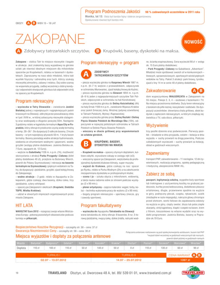 Program Podnoszenia Jakości 98 % zadowolonych uczestników w 2011 roku Monika, lat 13: Obóz był bardzo fajny i dobrze zorganizowany. Opiekunowie również byli bardzo mili. OBOZY: WIEK 13 – 18 LAT ZAKOPANE NOWOŚĆ Zdobywcy tatrzańskich szczytów. Zakopane – stolica Tatr to miejsce niezwykłe i bogate w atrakcje. Jest znakomitą bazą wypadową na górskie szlaki jak również idealnym miejscem dla miłośników spacerów po Krupówkach, relaksu w basenach i dyskotekach. Zapraszamy na nasz obóz młodzież, która lubi wysiłek fizyczny i adrenalinę oraz tych, którzy szukają niezwykłej atmosfery, zabawy i relaksu. Daj sobie szansę na wspaniała przygodę, zadbaj wcześniej o dobrą kondycję i odpowiedni ekwipunek górołaza lub odpowiedni strój na spacery po Krupówkach. Program rekreacyjny – wycieczka w Tatry Słowackie – zwiedzanie Jaskini Bielskiej jednej z największych i najpiękniejszych jaskiń krasowych na Słowacji, odkrytej przez poszukiwaczy złota w I poł. XVIII w., w której zobaczymy niezwykłe stalagmity oraz wodospady o długości powyżej 50m. Następnie 3 godzinny relaks w kąpielisku termalnym Aqua City w Popradzie, który oferuje krystalicznie czystą wodę termalną o temp. 28–36 °. Do dyspozycji 3 odkryte baseny, 2 kryte baseny – w tym największy pływacki 50 m, 1 kryty basen termalny. Baseny posiadają wodne atrakcje:hydromasaże, siedzenia ze strumieniami wodnymi i gejzerami, wodne grzybki (wstępy płatne dodatkowo: Jaskinia Bielska ok. 7 Euro, aquapark ok. 12 Euro); – wejście na Gubałówkę 1126 m. n.p.m. (1h), możliwość skorzystania z atrakcji Parku Przygody i Zabawy (bilet płatny dodatkowo 40 zł), przejście na Butorowy Wierch, powrót do Polany Szymoszkowej i rekreacja na basenie termalnym na Szymoszkowej z pięknym widokiem na Tatry, do dyspozycji: zjeżdżalnie, grzybki; zjazd koleją linową do Zakopanego; – wodne atrakcje – 2 godz. relaks w Aquaparku w Zakopanem, gdzie czekają: dwa baseny, dzika rzeka, trzy zjeżdżalnie, cztery whirlpool; – spacery po Zakopanem i okolicach (Krupówki, Siedziba TOPR, Wielka Krokiew); – udział w otwartych imprezach organizowanych przez miasto Zakopane. Krupówki, baseny, dyskoteki na maksa. Program rekreacyjny + program ZDOBYWCY TATRZAŃSKICH SZCZYTÓW – piesza wycieczka górska na Kasprowy Wierch 1987 m. n.p.m. (6–7 h) wejście z przewodnikiem, odpoczynek w schronisku Murowaniec, zjazd kolejką linową do Kuźnic; – piesza wycieczka górska na Giewont 1894 m. n.p.m. (8–9 h) jeden z najpopularniejszych szczytów Tatr Polskich, odpoczynek w schronisku na hali Kondratowej; – piesza wycieczka górska do Doliny Kościeliskiej (4h) na halę Ornak 1100 m n.p.m., zwiedzanie Wąwozu Kraków oraz jaskiń Smoczej Jamy, Mroźnej (jedynej oświetlonej w Tatrach Polskich), Mylnej i Raptawickiej; – piesza wycieczka górska przez Dolinę Roztoki i Dolinę Pięciu Stawów Polskich do Morskiego Oka (10h), odpoczynek w najwyżej położonym schronisku w Tatrach Polskich w Dolinie Pięciu Stawów Polskich; – wieczory w chacie grillowej przy wspomnieniach ze szlaków górskich. KRUPÓWKI, BASENY, DYSKOTEKI NA MAKSA – Krupówki na maksa – spacery słynnym deptakiem, kultowe zabytki, wyszukane zakupy w zasięgu ręki (x3); – wieczorny spacer po Zakopanem, wejściówka do profesjonalnej dyskoteki;klubowe klimaty, super muzyka; – wyjazd do Krakowa, gdzie czekają na nas: spacer po Rynku, relaks w Parku Wodnym (2h) a na zakończenie niezapomniana dyskoteka w profesjonalnym klubie; – scena i ja – sztuka obycia z mikrofonem, widownią, a także nauka radzenia sobie ze stresem podczas występu (2 x 90 min.); – plener artystyczny – zajęcia malarskie: węgiel, farby, kolaż – technika wykonania pracy do wyboru (2 x 90 min); – bogaty program rekreacyjno – sportowy (mecze, gry i zawody sportowe). HIT LATA Program fakultatywny WARSZTAT Euro 2012 – rozegrasz swoje własne Mistrzostwa Europy ; pokonaj pozostałych obozowiczów podczas turnieju w piłkarzyki. – wycieczka do Aquaparku Tatralandia na Słowacji www.tatralandia.sk, który oferuje: 8 basenów, 8 rur, 3-torową zjeżdżalnię, rwącą rzekę, dzikie źródła, natryski wod- Bezpieczeństwo Kosztów Rezygnacji – szczegóły str. 58 – cena: 37 zł Gwarancja Niezmienności Ceny – szczegóły str. 58 – cena: 30 zł ne, ściankę wspinaczkową. Cena wycieczki 90 zł + wstęp ok. 15 Euro płatny dodatkowo; – Park Przygody i Zabawy na Gubałówce „Adventure”. Młodzież może spróbować swoich sił w konkurencjach – linowych, sprawnościowych, sportowych wśród pięknych widoków na Tatry. Pakiet 3 atrakcji: park linowy, tyrolka, zjazd z liny 14 m w cenie 40 zł płatny dodatkowo. Zakwaterowanie dom wypoczynkowy MAŁGORZATA w Zakopanem na 55 miejsc. Pokoje 2, 3, 4 – osobowe z łazienkami i TV. Na miejscu przestronna stołówka. Duży teren rekreacyjny z boiskiem do piłki nożnej, koszykówki i siatkówki. Do dyspozycji uczestników: drewniana chata grillowa, obok budynek z zapleczem rekreacyjnym, w którym znajdują się: świetlica z TV, sala disco, piłkarzyki. Wyżywienie trzy posiłki dziennie oraz podwieczorek. Pierwszy posiłek – śniadanie w dniu przyjazdu, ostatni – kolacja w dniu wyjazdu + suchy prowiant na drogę powrotną. Podczas całodziennych wycieczek – suchy prowiant za kolację, obiad w godzinach wieczornych. Zapewniamy transport PKP, zakwaterowanie – 11 noclegów, 12 dni żywieniowych, realizację programu, opiekę pedagogiczną i medyczną, ubezpieczenie NNW i KL. Zabierz ze sobą paszport, legitymację szkolną, wygodne buty sportowe lub trekingowe z usztywnioną kostką na grubszej podeszwie, kurtkę przeciwdeszczową, dodatkowo płaszcz ortalionowy, długie, przewiewne spodnie na wyjście w góry, podręczny plecak, czapka, rękawiczki, szalik (niezbędne w razie niepogody), nakrycie głowy chroniące przed słońcem, worki foliowe do zapakowania odzieży na wyjścia w 