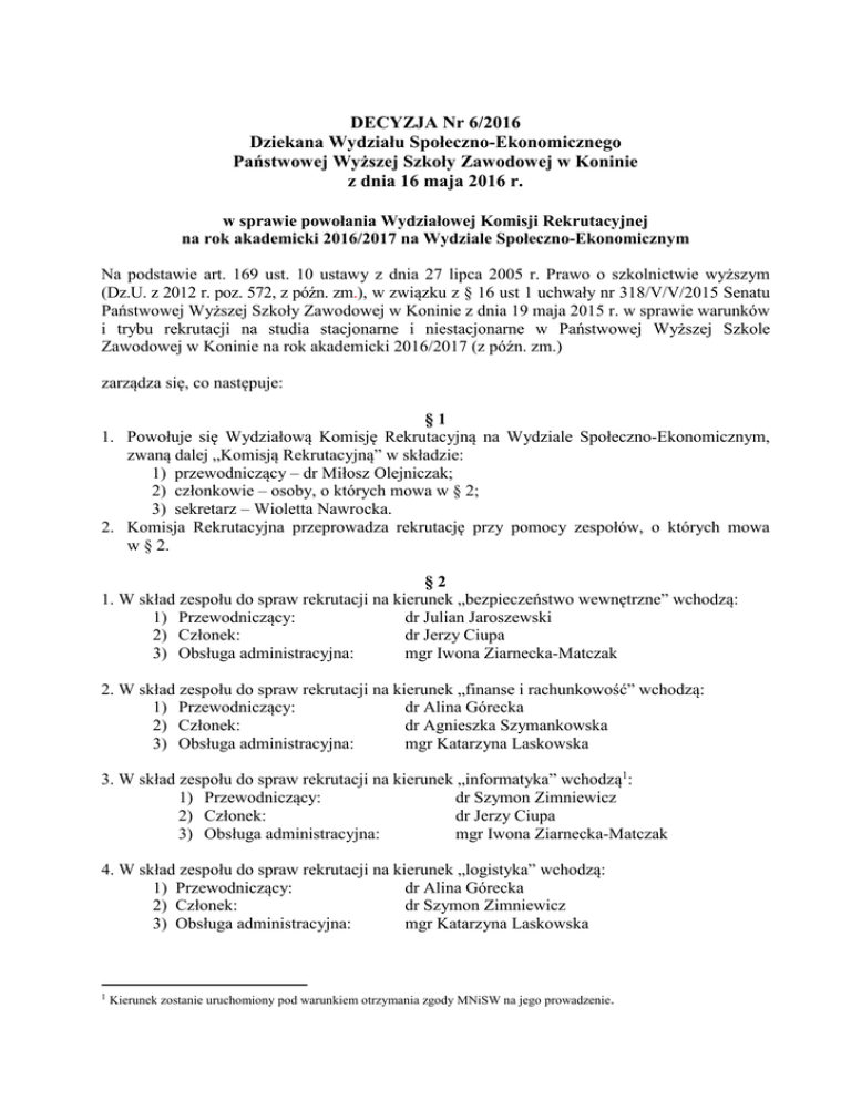 DECYZJA Nr 6/2016 Dziekana Wydziału Społeczno-Ekonomicznego Państwowej Wyższej Szkoły Zawodowej w Koninie z dnia 16 maja 2016 r. w sprawie powołania Wydziałowej Komisji Rekrutacyjnej na rok akademicki 2016/2017 na Wydziale Społeczno-Ekonomicznym Na podstawie art. 169 ust. 10 ustawy z dnia 27 lipca 2005 r. Prawo o szkolnictwie wyższym (Dz.U. z 2012 r. poz. 572, z późn. zm.), w związku z § 16 ust 1 uchwały nr 318/V/V/2015 Senatu Państwowej Wyższej Szkoły Zawodowej w Koninie z dnia 19 maja 2015 r. w sprawie warunków i trybu rekrutacji na studia stacjonarne i niestacjonarne w Państwowej Wyższej Szkole Zawodowej w Koninie na rok akademicki 2016/2017 (z późn. zm.) zarządza się, co następuje: §1 1. Powołuje się Wydziałową Komisję Rekrutacyjną na Wydziale Społeczno-Ekonomicznym, zwaną dalej „Komisją Rekrutacyjną” w składzie: 1) przewodniczący – dr Miłosz Olejniczak; 2) członkowie – osoby, o których mowa w § 2; 3) sekretarz – Wioletta Nawrocka. 2. Komisja Rekrutacyjna przeprowadza rekrutację przy pomocy zespołów, o których mowa w § 2. §2 1. W skład zespołu do spraw rekrutacji na kierunek „bezpieczeństwo wewnętrzne” wchodzą: 1) Przewodniczący: dr Julian Jaroszewski 2) Członek: dr Jerzy Ciupa 3) Obsługa administracyjna: mgr Iwona Ziarnecka-Matczak 2. W skład zespołu do spraw rekrutacji na kierunek „finanse i rachunkowość” wchodzą: 1) Przewodniczący: dr Alina Górecka 2) Członek: dr Agnieszka Szymankowska 3) Obsługa administracyjna: mgr Katarzyna Laskowska 3. W skład zespołu do spraw rekrutacji na kierunek „informatyka” wchodzą1: 1) Przewodniczący: dr Szymon Zimniewicz 2) Członek: dr Jerzy Ciupa 3) Obsługa administracyjna: mgr Iwona Ziarnecka-Matczak 4. W skład zespołu do spraw rekrutacji na kierunek „logistyka” wchodzą: 1) Przewodniczący: dr Alina Górecka 2) Członek: dr Szymon Zimniewicz 3) Obsługa administracyjna: mgr Katarzyna Laskowska 1 Kierunek zostanie uruchomiony pod warunkiem otrzymania zgody MNiSW na jego prowadzenie. 5. W skład zespołu do spraw rekrutacji na kierunek „pedagogika” wchodzą: 1) Przewodniczący: prof. nadzw. dr hab. Jakub Bartoszewski 2) Członek: mgr Małgorzata Chybicka 3) Obsługa administracyjna: mgr Iwona Powaga 6. W skład zespołu do spraw rekrutacji na kierunek „praca socjalna” wchodzą: 1) Przewodniczący: prof. nadzw. dr hab. Jakub Bartoszewski 2) Członek: mgr Artur Cygan 3) Obsługa administracyjna: mgr Iwona Powaga 7. W skład zespołu do spraw rekrutacji na kierunek „zarządzanie” wchodzą: 1) Przewodniczący: dr Alina Górecka 2) Członek: dr Agnieszka Szymankowska 3) Obsługa administracyjna: mgr Katarzyna Laskowska §3 1. Rozstrzygnięcia Wydziałowej Komisji Rekrutacyjnej, w tym zespołów, o których mowa w § 2, podejmowane są w drodze konsensusu, a w razie jego braku – w drodze głosowania zwykłą większością głosów, w obecności co najmniej dwóch członków, w tym przewodniczącego. 2. Posiedzenia Komisji są protokołowane. Protokoły podpisuje przewodniczący Wydziałowej Komisji Rekrutacyjnej i osoba sporządzająca protokół. 3. Wydziałowa Komisja Rekrutacyjna może upoważnić swojego przewodniczącego do podpisywania w jej imieniu decyzji w sprawie przyjęcia na studia. §4 Decyzja wchodzi w życie z dniem podpisania. Dziekan Wydziału Społeczno-Ekonomicznego PWSZ w Koninie /-/ dr Karina Zawieja-Żurowska