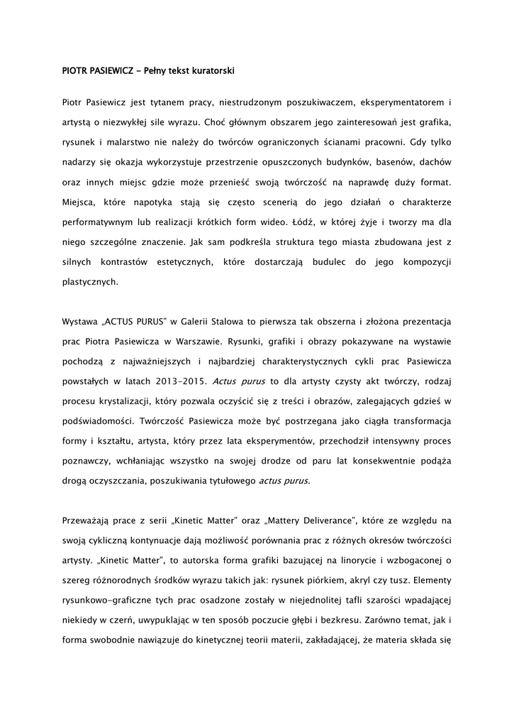 PIOTR PASIEWICZ - Pełny tekst kuratorski Piotr Pasiewicz jest tytanem pracy, niestrudzonym poszukiwaczem, eksperymentatorem i artystą o niezwykłej sile wyrazu. Choć głównym obszarem jego zainteresowań jest grafika, rysunek i malarstwo nie należy do twórców ograniczonych ścianami pracowni. Gdy tylko nadarzy się okazja wykorzystuje przestrzenie opuszczonych budynków, basenów, dachów oraz innych miejsc gdzie może przenieść swoją twórczość na naprawdę duży format. Miejsca, które napotyka stają się często scenerią do jego działań o charakterze performatywnym lub realizacji krótkich form wideo. Łódź, w której żyje i tworzy ma dla niego szczególne znaczenie. Jak sam podkreśla struktura tego miasta zbudowana jest z silnych kontrastów estetycznych, które dostarczają budulec do jego kompozycji plastycznych. Wystawa „ACTUS PURUS” w Galerii Stalowa to pierwsza tak obszerna i złożona prezentacja prac Piotra Pasiewicza w Warszawie. Rysunki, grafiki i obrazy pokazywane na wystawie pochodzą z najważniejszych i najbardziej charakterystycznych cykli prac Pasiewicza powstałych w latach 2013-2015. Actus purus to dla artysty czysty akt twórczy, rodzaj procesu krystalizacji, który pozwala oczyścić się z treści i obrazów, zalegających gdzieś w podświadomości. Twórczość Pasiewicza może być postrzegana jako ciągła transformacja formy i kształtu, artysta, który przez lata eksperymentów, przechodził intensywny proces poznawczy, wchłaniając wszystko na swojej drodze od paru lat konsekwentnie podąża drogą oczyszczania, poszukiwania tytułowego actus purus. Przeważają prace z serii „Kinetic Matter” oraz „Mattery Deliverance”, które ze względu na swoją cykliczną kontynuacje dają możliwość porównania prac z różnych okresów twórczości artysty. „Kinetic Matter”, to autorska forma grafiki bazującej na linorycie i wzbogaconej o szereg różnorodnych środków wyrazu takich jak: rysunek piórkiem, akryl czy tusz. Elementy rysunkowo-graficzne tych prac osadzone zostały w niejednolitej tafli szarości wpadającej niekiedy w czerń, uwypuklając w ten sposób poczucie głębi i bezkresu. Zarówno temat, jak i forma swobodnie nawiązuje do kinetycznej teorii materii, zakładającej, że materia składa się z atomów będących w ciągłym ruchu. Ten aspekt bezpośrednio łączy się z filozofią transformacji, przemiany i rozpadu, która jest stale obecna w całej twórczości artysty. W pracach wyczuwalny jest niepokój oraz pewnego rodzaju napięcie, które powoduje, że pomimo zamkniętej kompozycji prace mają charakter dynamiczny. Zupełnie inną formę posiadają obrazy na płótnie z serii „Mattery Deliverance”, którą artysta tworzy nieprzerwanie od 2013 roku. Prace wyróżnia bardzo intensywny kolor, który dotychczas pojawiał się w twórczości Pasiewicza bardzo oszczędnie, ograniczając się do konkretnych elementów i barw. Wprowadza do obrazu silny ładunek energetyczny, Bergsonowski élan vital, który dodatkowo rozszerza interpretacje odbiorcy o kolor oraz wszystko co się z nim kojarzy. Obrazy podobnie jak grafiki są połączeniem wielu różnorodnych technik malarskich i rysunkowych, jednak ich struktura jest bardziej dynamiczna, złożona i rozedrgana. Na wystawie „ACTUS PURUS” nie zabraknie również rysunków artysty, które stanowią często punkt wyjścia do dalszych rozważań nad formą i są najbardziej pierwotnym elementem wykorzystywanym następnie w grafikach i obrazach. Szczególnie interesującym cyklem rysunków wykonywanych przy pomocy tuszu jest „Puls-Impuls”, przypominający swoją strukturą ruch gęstej zawiesiny farby wpuszczanej do wody. Podobnie jak w przypadku „Mattery Deliverance” pomiędzy formami organicznymi Pasiewicz umieszcza kształty geometryczne, które mają uwypuklać opozycje pomiędzy tym co stałe i tym co zmienne, będące w ciągłym ruchu. Opozycje te według artysty wykluczają się nawzajem, jednocześnie nie mogąc bez siebie funkcjonować. Karol Sikora