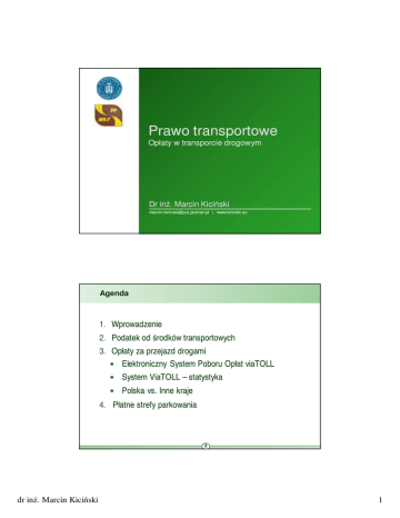 Prawo transportowe Opłaty w transporcie drogowym Dr inż. Marcin Kiciński [email protected] | www.kicinski.eu Agenda 1. Wprowadzenie 2. Podatek od środków transportowych 3. Opłaty za przejazd drogami • Elektroniczny System Poboru Opłat viaTOLL • System ViaTOLL – statystyka • Polska vs. Inne kraje 4. Płatne strefy parkowania 2 dr inż. Marcin Kiciński 1 1. Wprowadzenie Działalność transportowa • Otwarcie działalności (prawo jazdy, CKZ, badania lekarskie, zezwolenia, licencje, wymagane zabezpieczenie) • Okresowe szkolenia kierowców, • Opłaty w paliwie (akcyza, opłata paliwowa, marŜa, VAT) • Opłaty ekologiczne • Opłaty i podatki lokalne • Opłaty za przejazd drogami, tunelami, mostami, promami, płatne strefy postoju itp. 3 1. Podatek od środków transportowych dr inż. Marcin Kiciński 2 Podstawa prawna Ustawa z dnia 12. stycznia 1991 r. o podatkach i opłatach lokalnych • Rozdział 3: Podatek od środków transportowych (artykuły 8-12b) Coroczne obwieszczenia Ministra Finansów 5 Podstawa prawna Do 1997 r. – Podatek drogowy / podatek od środków transportowych Podatek od środków transportowych 6 dr inż. Marcin Kiciński 3 Podstawa prawna Cechy charakterystyczne podatku od środków transportowych Opłata ma charakter lokalny tzn. jej wysokość jest ustalana przez radę miasta/ radę gminy/ radę miasta i gminy Podatek dotyczy wybranych środków transportowych Minister finansów określa jedynie dolne i górne granice wysokości podatku obowiązujące w danym roku kalendarzowym 7 Podstawa prawna Obwieszczenia – sierpień danego roku • Obwieszczenie Ministra Finansów z 2. sierpnia 2012 r. w sprawie górnych stawek kwotowych podatków i opłat lokalnych w 2013 r. • Obwieszczenie Ministra Finansów z 9. sierpnia 2013 r. w sprawie górnych stawek kwotowych podatków i opłat lokalnych w 2014 r. • Obwieszczenie Ministra Finansów z 7. sierpnia 2014 r. w sprawie górnych stawek kwotowych podatków i opłat lokalnych w 2015 r. • Obwieszczenie Ministra Finansów z dnia 5 sierpnia 2015 r. w sprawie górnych granic stawek kwotowych podatków i opłat lokalnych w 2016 r. 8 dr inż. Marcin Kiciński 4 Podstawa prawna 9 Kogo dotyczy? Samochody cięŜarowe: powyŜej 3,5 t DMC Ciągniki siodłowe i balastowe: masa zespołu powyŜej 3,5 t DMC Przyczepy i naczepy łącznie z pojazdem silnikowym: powyŜej 7t DMC autobusy z wyjątkiem związanych wyłącznie z działalnością rolniczą prowadzoną przez podatnika podatku rolnego 10 dr inż. Marcin Kiciński 5 Przykład Mam czy nie mam płacić podatek od środków transportowych za przyczepę? 11 Zwolnienia z podatku 1. Środki transportowe przedstawicielstw dyplomatycznych, urzędów konsularnych, misji zagranicznych (zasada wzajemności) 2. Środki transportowe – zapasy mobilizacyjne, pojazdy specjalne 3. Pojazdy zabytkowe 12 dr inż. Marcin Kiciński 6 Zwroty podatku Zwroty 0 20 Wielkość podatku [%] < 20 20≤ 49 ≤ 49 69 49< ≤ 69 99 69< ≤ 99 Liczba jazd 99 < 100 75 50 25 0 13 Płatnik/terminy płatności Płatnik: • Osoby fizyczne i osoby prawne – właściciele • JeŜeli kilku właścicieli, to płatność „solidarna” 2 raty • Do 15. lutego – I rata • Do 15 września – II rata JeŜeli obowiązek powstał w ciągu roku • 14 dni od zaistnienia obowiązku – I rata • Do 15 września – II rata lub • Od 1. września – 14 dni od zaistnienia obowiązku - płatność jednorazowa składka Wysokość proporcjonalna do liczby miesięcy 14 dr inż. Marcin Kiciński 7 Górne granice – porównanie wybranych lat [zł] L. Wyszczególnienie p. 1992 Pow. 3,5 do 5,5 t Pow. 5,5 do 9 t 1 Sam. cięŜarowy Pow. 9 t. i poniŜej 12t 12 t. i więcej Pow. 3,5 t i poniŜej 12t Ciągnik siodłowy i 2 balastowy 2014 2015 676,2 810,87 1028 1352,74 818,17 821,45 1364,92 1370,38 1233,6 1623,28 1637,89 1644,45 2 354,12 3097,68 3125,56 3138,07 1439,2 1893,8 1910,85 1918,5 Od 12 do 36 t. 1819,56 2394,29 2415,84 2425,51 PowyŜej 36 t. 2354,12 3097,68 3125,56 3138,07 1233,6 1623,28 1637,89 1644,45 1439,2 1910,85 Od 7 i poniŜej 12 t. 3 Przyczepa/naczepa Od 17 do 36 t Pow. 36 t. 4 Autobusy 2013 1893,8 1819,56 2394,29 Mniej niŜ 30 miejsc 1439,2 30 miejsc i więcej 1893,8 1819,56 2394,29 1918,5 2415,84 2425,51 1910,85 1918,5 2415,84 2425,51 15 Wysokości opłat (wybrane przykłady 2014 r.) L.p. Wyszczególnienie max Poznań Stawka podstawowa Euro V i VI Pow. 5,5 do 9 t 818,17 1364,92 704 1174 250 440 Pow. 9 t. i poniŜej 12t 1637,89 540 12 t. i więcej 3125,56 Pow. 3,5 t i poniŜej 12t 1910,85 1410 od 900 do 2400 1644 Od 12 do 36 t. 2415,84 PowyŜej 36 t. 3125,56 Od 7 i poniŜej 12 t. 1637,89 Pow. 3,5 do 5,5 t 1 2 3 Samochód cięŜarowy Ciągnik siodłowy i balastowy Przyczepa / Od 12 do 36 t naczepa Pow. 36 t. 4 Autobusy 1910,85 2415,84 od 1100 do 2493 600 od 600 do 1663 Stawka podstawowa Warszawa napęd wyprodukowanych hybrydowy i w 2012 i młodszych elektryczny Suchy Las Stawka podstawowa 545 726 490 653 327 436 150 280 968 od 768 do 2782 930 908 od 726 do 2199 od 1562 do 2891 810 od 484 do 1453 od 726 do 1928 800 968 871 580 380 M niej niŜ 30 miejsc 1910,85 1200 30 miejsc i więcej 2415,84 2080 1400 1209 od 384 do 2399 816 545 730 600 od 548 do 1685(*) od 1685 do 2493 (**) 200 od 313 do 1663 871 580 690 1088 725 800 (*) do 40 t, (**) pow . 40 t 16 dr inż. Marcin Kiciński 8 Przykład Przedsiębiorstwo transportowe: 1. Transport autobusowy 2. Liczba autobusów: 300 3. Pojemność autobusów: 100 miejsc / 30 miejsc Poznań Warszawa Suchy Las 17 Przykład (roczny koszt podatku od środków transportu) 800 000,00 600 000,00 400 000,00 200 000,00 0,00 Poznań (Stawka podstawowa) Poznań (Euro V i VI) Warszawa (Stawka Warszawa Warszawa (napęd podstawowa) (wyprodukowanych w hybrydowy i 2012 i młodszych) elektryczny) Suchy Las (Stawka podstawowa) 18 dr inż. Marcin Kiciński 9 Opłaty za przejazd drogami Podstawa prawna NajwaŜniejsze daty: 1985 – uchwalanie 20 dr inż. Marcin Kiciński 10