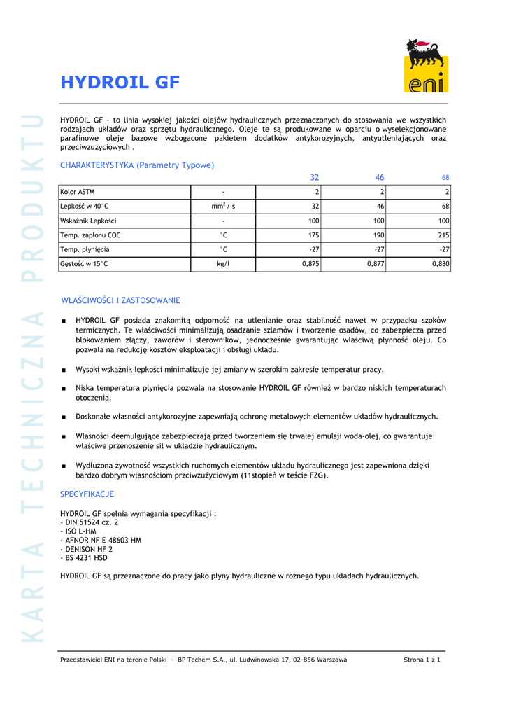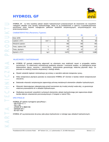 HYDROIL GF HYDROIL GF – to linia wysokiej jakości olejów hydraulicznych przeznaczonych do stosowania we wszystkich rodzajach układów oraz sprzętu hydraulicznego. Oleje te są produkowane w oparciu o wyselekcjonowane parafinowe oleje bazowe wzbogacone pakietem dodatków antykorozyjnych, antyutleniających oraz przeciwzużyciowych . CHARAKTERYSTYKA (Parametry Typowe) 32 46 68 Kolor ASTM - 2 2 2 Lepkość w 40°C 2 mm / s 32 46 68 - 100 100 100 Temp. zapłonu COC °C 175 190 215 Temp. płynięcia °C -27 -27 -27 Gęstość w 15°C kg/l 0,875 0,877 0,880 Wskaźnik Lepkości WŁAŚCIWOŚCI I ZASTOSOWANIE ■ HYDROIL GF posiada znakomitą odporność na utlenianie oraz stabilność nawet w przypadku szoków termicznych. Te właściwości minimalizują osadzanie szlamów i tworzenie osadów, co zabezpiecza przed blokowaniem złączy, zaworów i sterowników, jednocześnie gwarantując właściwą płynność oleju. Co pozwala na redukcję kosztów eksploatacji i obsługi układu. ■ Wysoki wskaźnik lepkości minimalizuje jej zmiany w szerokim zakresie temperatur pracy. ■ Niska temperatura płynięcia pozwala na stosowanie HYDROIL GF również w bardzo niskich temperaturach otoczenia. ■ Doskonałe własności antykorozyjne zapewniają ochronę metalowych elementów układów hydraulicznych. ■ Własności deemulgujące zabezpieczają przed tworzeniem się trwałej emulsji woda-olej, co gwarantuje właściwe przenoszenie sił w układzie hydraulicznym. ■ Wydłużona żywotność wszystkich ruchomych elementów układu hydraulicznego jest zapewniona dzięki bardzo dobrym własnościom przciwzużyciowym (11stopień w teście FZG). SPECYFIKACJE HYDROIL GF spełnia wymagania specyfikacji : - DIN 51524 cz. 2 - ISO L-HM - AFNOR NF E 48603 HM - DENISON HF 2 - BS 4231 HSD HYDROIL GF są przeznaczone do pracy jako płyny hydrauliczne w rożnego typu układach hydraulicznych. Przedstawiciel ENI na terenie Polski - BP Techem S.A., ul. Ludwinowska 17, 02-856 Warszawa Strona 1 z 1