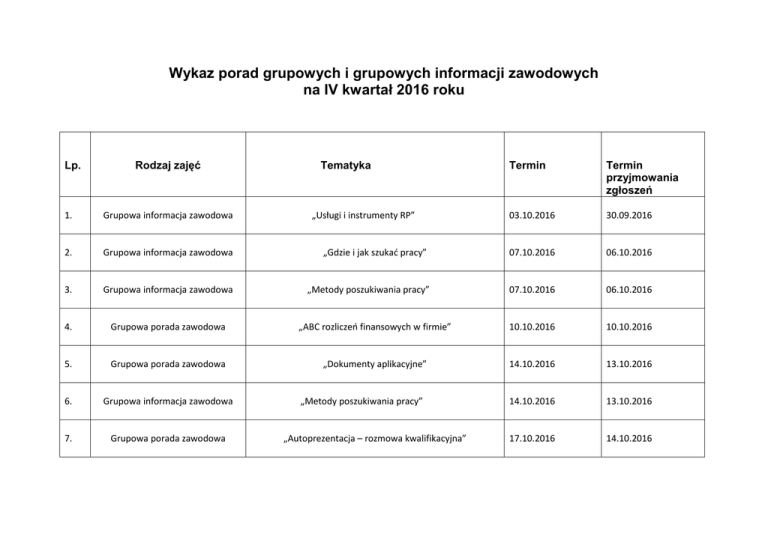 Wykaz porad grupowych i grupowych informacji zawodowych na IV kwartał 2016 roku Lp. Rodzaj zajęć Tematyka „Usługi i instrumenty RP” Termin Termin przyjmowania zgłoszeń 03.10.2016 30.09.2016 1. Grupowa informacja zawodowa 2. Grupowa informacja zawodowa „Gdzie i jak szukać pracy” 07.10.2016 06.10.2016 3. Grupowa informacja zawodowa „Metody poszukiwania pracy” 07.10.2016 06.10.2016 4. Grupowa porada zawodowa „ABC rozliczeń finansowych w firmie” 10.10.2016 10.10.2016 5. Grupowa porada zawodowa „Dokumenty aplikacyjne” 14.10.2016 13.10.2016 6. Grupowa informacja zawodowa 14.10.2016 13.10.2016 7. Grupowa porada zawodowa 17.10.2016 14.10.2016 „Metody poszukiwania pracy” „Autoprezentacja – rozmowa kwalifikacyjna” 8. Grupowa informacja zawodowa „Urząd pracy partnerem w poszukiwaniu pracy” 17.10.2016 14.10.2016 9. Grupowa informacja zawodowa „Zawody poszukiwane, zawody przyszłości” 21.10.2016 20.10..2016 10. Grupowa informacja zawodowa „ABC rynku pracy” 21.10.2016 20.10.2016 11. Grupowa informacja zawodowa „Metody poszukiwania pracy” 28.10.2016 27.10.2016 12. Grupowa informacja zawodowa „Usługi i instrumenty rynku pracy” 04.11.2016 03.11.2016 13. Grupowa informacja zawodowa „Urząd pracy partnerem w poszukiwaniu pracy” 04.11.2016 03.11.2016 14. Grupowa informacja zawodowa „Gdzie i jak szukać pracy” 07.11.2016 04.11.2016 15. Grupowa porada zawodowa „Własna firma zanim podejmiesz to wyzwanie” 07.11.2016 04.11.2016 „Dokumenty aplikacyjne” 14.11.2016 10.11.2016 16. Grupowa porada zawodowa 17. Grupowa informacja zawodowa „Metody poszukiwania pracy” 14.11.2016 10.11.2016 18. Grupowa porada zawodowa „Autoprezentacja – rozmowa kwalifikacyjna” 18.11.2016 17.11.2016 19. Grupowa porada zawodowa 20. Grupowa informacja zawodowa 21. Grupowa informacja zawodowa 22. Grupowa informacja zawodowa 23. Grupowa informacja zawodowa 24. Grupowa porada zawodowa 25. Grupowa informacja zawodowa 26. Grupowa porada zawodowa 27. Grupowa informacja zawodowa 28. Grupowa informacja zawodowa 29. Grupowa porada zawodowa „Wejdź na rynek pracy” 18.11.2016 17.11.2016 „Urząd pracy partnerem w poszukiwaniu pracy” 21.11.2016 18.11.2016 „Zawody poszukiwane, zawody przyszłości” 25.11.2016 24.11.2016 25.11.2016 24.11.2016 28.11.2016 25.11.2016 02.12.2016 01.12.2016 „Metody poszukiwania pracy” 02.12.2016 02.12.2016 „Usługi i instrumenty RP” 05.12.2016 02.12.2016 05.12.2016 02.12.2016 09.12.2016 08.12.2016 12.12.2016 09.12.2016 „ABC rynku pracy” „Metody poszukiwania pracy” „Wejdź na rynek pracy” „Gdzie i jak szukać pracy” „Metody poszukiwania pracy” „ABC rozliczeń finansowych w firmie” 30. Grupowa porada zawodowa „Dokumenty aplikacyjne” 12.12.2016 09.12.2016 31. Grupowa informacja zawodowa „Metody poszukiwania pracy” 16.12.2016 15.12.2016 32. Grupowa informacja zawodowa 19.12.2016 16.12.2016 „ABC rynku pracy”