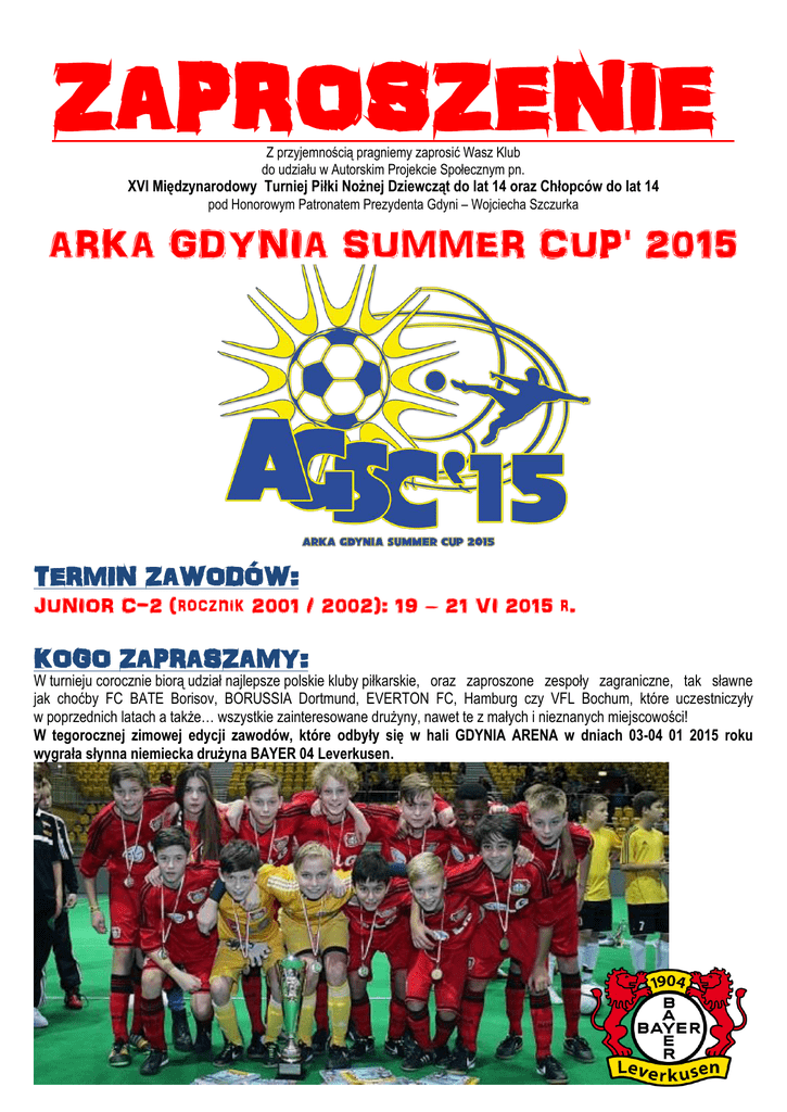 ZAPROSZENIE Z przyjemnością pragniemy zaprosić Wasz Klub do udziału w Autorskim Projekcie Społecznym pn. XVI Międzynarodowy Turniej Piłki Nożnej Dziewcząt do lat 14 oraz Chłopców do lat 14 pod Honorowym Patronatem Prezydenta Gdyni – Wojciecha Szczurka ARKA GDYNIA SUMMER CUP' 2015 TERMIN ZAWODÓW: JUNIOR C-2 (rocznik 2001 / 2002): 19 – 21 VI 2015 r. KOGO ZAPRASZAMY: W turnieju corocznie biorą udział najlepsze polskie kluby piłkarskie, oraz zaproszone zespoły zagraniczne, tak sławne jak choćby FC BATE Borisov, BORUSSIA Dortmund, EVERTON FC, Hamburg czy VFL Bochum, które uczestniczyły w poprzednich latach a także… wszystkie zainteresowane drużyny, nawet te z małych i nieznanych miejscowości! W tegorocznej zimowej edycji zawodów, które odbyły się w hali GDYNIA ARENA w dniach 03-04 01 2015 roku wygrała słynna niemiecka drużyna BAYER 04 Leverkusen. IDEA „ARKA GDYNIA SUMMER CUP” W letniej edycji turnieju corocznie biorą udział wszystkie zainteresowane drużyny, zarówno te najsłynniejsze, jak i kluby lokalne oraz z mniejszych ośrodków sportowych z Polski oraz innych europejskich państw. Same zawody rozgrywane są na kilku boiskach, zaś oferta integracyjna i edukacyjna, czynią imprezę bardzo atrakcyjną oraz realnie przydatną w rozwoju cech społecznych młodych uczestników projektu, pochodzących z różnych części Europy. - Turniej “AGSC” to: FUTBOL, o EDUKACJA, SZACUNEK, INTEGRACJA PRZYGODA I NAUKA Futbol nie jest nadrzędnym celem tego projektu – jest tylko środkiem w realizacji tworzenia atmosfery wzajemnego poszanowania wartości kulturowych. Futbol daje nam jedynie możliwość wzajemnego spotkania w danym miejscu i czasie, by wzajemnie w sposób jak najbardziej namacalny poznawać Gdynię, jej morskie i kaszubskie walory oraz budować prawidłowe postawy wobec siebie wzajemnie, bez względu na wyznawane wartości, kolor skóry czy stosowane na co dzień w swoim rodzinnym środowisku obyczaje. PARTNERZY EDUKACYJNI „AGSC’ 2015” MUZEUM MARYNARKI WOJENNEJ „AKWARIUM GDYŃSKIE” MORSKIEGO INSTYTUTU RYBACKIEGO NARODOWE MUZEUM MORSKIE – „Dar Pomorza” PARTNERZY EVENTOWI „AGSC’ 2015” KOLIBKI ADVENTURE PARK – największy park przygody w Polsce „STENA LINE” - skandynawskie promy pasażersko – towarowe CENTRALNY OŚRODEK MEDYCYNY SPORTOWEJ w Warszawie O/ Gdynia SYSTEM GIER TURNIEJ DZIEWCZAT U-14 - przewidujemy start co najmniej 8 drużyn, - boiska trawiaste o wymiarach 56 x 68 metrów, NARODOWY STADION RUGBY GDYNIA, - liczba zawodniczek – 8 plus 1 bramkarka plus dowolna liczba zawodniczek rezerwowych, - rozgrywki minimum w 2 grupach eliminacyjnych po 4 zespoły w każdej – piątek 19 VI 2015 - rozgrywki finałowe systemem dostosowanym do liczby drużyn – niedziela – 21 VI 2015 TURNIEJ ChlOPCóW U-14 - przewidujemy start co najmniej 16 drużyn, - boiska trawiaste o wymiarach 60 x 100 metrów, - liczba zawodników – 10 plus 1 bramkarz plus dowolna liczba zawodników rezerwowych, - Obiekty Gdyńskiego Centrum Sportu, - STADION MIEJSKI GDYNIA, Olimpijska 5 - rozgrywki minimum w 4 grupach eliminacyjnych po 4 zespoły w każdej – piątek 19 VI 2015 - rozgrywki finałowe systemem dostosowanym do liczby drużyn – niedziela – 21 VI 2015 LICZBA DRUŻYN CHĘTNYCH DO UCZESTNICTWA NIE JEST NICZYM OGRANICZONA! PLAN ORGANIZACYJNY PROJEKTUORGANIZACYJNY TURNIEJU CZWARTEK 18 VI 2015 – Od godzin porannych przybywanie drużyn do Gdyni. Zaprowiantowanie od kolacji. kolacja, Spotkania organizacyjne z kierownikami drużyn w miejscach zakwaterowania, przedstawienie Zespołu Organizacyjnego, dokładnego planu działania podczas pobytu w Gdyni. Dla chętnych, przybyłych w godzinach przedpołudniowych możliwość zorganizowania czasu ponad ustalonym programem pobytu. PIATEK 19 VI 2015 1/ Śniadanie, przemieszczenie się do miejsc rozgrywek 2/ Rozgrywki eliminacyjne w grupach, 3/ Seminaria edukacyjne Centralnego Ośrodka Medycyny Sportowej w Warszawie dla wszystkich uczestników, 4/ Obiad w przerwie rozgrywek (restauracja OLIMPIJSKA 5, Stadion Miejski Gdynia oraz ustalone miejsca żywienia w okolicach obiektów turniejowych). 5/ Przemieszczenie się do Gdyni Kolibek w okolice Ośrodka Wypoczynkowego NATURA Tour, do największego w Polsce parku przygody KOLIBKI ADVENTURE PARK – 3 godzinna zabawa dla zawodniczek i zawodników w formie rywalizacji w ekstremalnych aktywnościach stosownych do wieku. 6/ Dla trenerów i organizatorów LEADER’S PARTY w formie rautu na świeżym powietrzu, 7/ Kolacja dla wszystkich, 8/ KARAOKE i zabawa z D.J-em, 9 / Wyjazd do miejsc zakwaterowania około godz. 22.00. 10/ Godz. 23.00 Nocny Bieg Świętojański dla kilku tysięcy uczestników trenerzy drużyn mogą brać udział! Rejestracja do biegu na www.gdyniasport.pl SOBOTA 20 VI 2015 – EVENTS DAY - OTWARCIE LATA’ 2015 1/ Śniadanie, przemieszczenie się do Centrum Gdyni, w okolice Skweru Kościuszki i mariny jachtowej – 2/ Zbiórka na Skwerze Arki Gdynia przy Bulwarze Nadmorskim i przemarsz drużyn na Skwer Kościuszki, 3/ Uroczyste otwarcie turnieju ARKA GDYNIA SUMMER CUP’ 2015 4/ Uroczyste otwarcie DNI MORZA 2015, salwy armatnie z niszczyciela ORP BŁYSKAWICA! 5/ Zwiedzanie polskiego niszczyciela ORP „BŁYSKAWICA” oraz Muzeum Marynarki Wojennej obok plaży centralnej, 6/ Zwiedzanie polskiego żaglowca Muzeum „Dar Pomorza”, 7/ Zwiedzanie polskiego trzymasztowca Akademii Morskiej w Gdyni „ Dar Młodzieży”. 8/ Przejazd do Bazy Promowej w okolice Bałtyckiego Terminalu Kontenerowego „BCT” – zwiedzanie wielkiego promu pasażerskiego STENA LINE, w tym: - mostek kapitański, - wszystkie pokłady, - sklepy wolnocłowe, w tym skandynawskie pamiątki, - dyskoteka dla wszystkich uczestników turnieju, - obiad na promie w restauracji dla wszystkich uczestników „AGSC’2015”, 9/ Przejazd wg planu indywidualnego, np. na wieżę widokową w Gdyni Kolibkach lub do Orłowa na molo i domu Stefana Żeromskiego przy plaży 