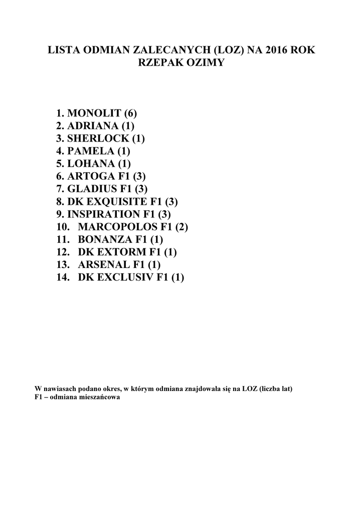 LISTA ODMIAN ZALECANYCH (LOZ) NA 2016 ROK RZEPAK OZIMY 1. MONOLIT (6) 2. ADRIANA (1) 3. SHERLOCK (1) 4. PAMELA (1) 5. LOHANA (1) 6. ARTOGA F1 (3) 7. GLADIUS F1 (3) 8. DK EXQUISITE F1 (3) 9. INSPIRATION F1 (3) 10. MARCOPOLOS F1 (2) 11. BONANZA F1 (1) 12. DK EXTORM F1 (1) 13. ARSENAL F1 (1) 14. DK EXCLUSIV F1 (1) W nawiasach podano okres, w którym odmiana znajdowała się na LOZ (liczba lat) F1 – odmiana mieszańcowa RZEPAK OZIMY – LOZ 2016 MONOLIT Odmiana populacyjna. Zawartość tłuszczu w nasionach - duża do bardzo dużej, glukozynolanów - średnia. Zawartość białka ogólnego w suchej masie beztłuszczowej - mała do średniej, włókna - średnia. Liczba nasion w łuszczynie większa od wzorca, masa 1000 nasion nieco mniejsza. Ocena rozet po zimie średnia, przezimowanie roślin małe do średniego. Termin początku kwitnienia dość późny, dojrzewania średni. Rośliny średniej wysokości, o małej do średniej odporności na wyleganie. Odporność na suchą zgniliznę i na zgniliznę twardzikową - dość duża, na czerń krzyżowych - średnia. Hodowca: Hodowla Roślin Strzelce. ADRIANA Odmiana populacyjna. Zawartość tłuszczu w nasionach bardzo duża, glukozynolanów – średnia. Zawartość białka w suchej masie beztłuszczowej oraz włókna - średnia. Liczba nasion w łuszczynie dość duża, masa 1000 nasion nieco większa od wzorca. Ocena rozet po zimie i przezimowanie roślin średnie. Termin rozpoczęcia kwitnienia i dojrzewania średni. Rośliny średniej wysokości, o dość dużej odporności na wyleganie. Odporność na porażenie zgnilizną twardzikową średnia, na suchą zgniliznę kapustnych - mała do średniej, na czerń krzyżowych - dość duża. Przedstawiciel hodowcy: Limagrain Central Europe Sociede Eoropeenne. SHERLOCK Odmiana populacyjna. Zawartość glukozynolanów w nasionach średnia, tłuszczu dość duża. Zawartość białka w suchej masie beztłuszczowej mniejsza od średniej. Masa 1000 nasion mniejsza od średniej. Zimotrwałość średnia. Termin początku kwitnienia i dojrzewania nieco późniejszy od średniej. Rośliny dość wysokie, o zaledwie średniej odporności na wyleganie. Odporność na zgniliznę twardzikową dość duża, na suchą zgniliznę kapustnych i choroby podstawy łodygi średnia, na czerń krzyżowych nieco lepsza od średniej. Przedstawiciel hodowcy: KWS Polska. PAMELA Odmiana populacyjna. Zawartość tłuszczu w nasionach dość duża, glukozynolanów nieco powyżej średniej. Zawartość białka w suchej masie beztłuszczowej średnia. Masa 1000 nasion średnia. Zimotrwałość roślin mała. Termin początku kwitnienia średni, dojrzałości technicznej dość późny. Rośliny średniej wysokości, o przeciętnej odporności na wyleganie. Odporność na zgniliznę twardzikową, suchą zgniliznę kapustnych, choroby podstawy łodygi i na czerń krzyżowych dość duża. Przedstawiciel hodowcy: Limagrain Central Europe Sociede Eoropeenne. LOHANA Odmiana populacyjna. Zawartość tłuszczu w nasionach średnia, glukozynolanów poniżej średniej. Zawartość białka w suchej masie beztłuszczowej powyżej średniej. Masa 1000 nasion średnia. Zimotrwałość roślin średnia. Rośliny średnio wysokie, o przeciętnej odporności na wyleganie. Termin początku kwitnienia i dojrzałości technicznej nieco późniejszy od średniego. Odporność na zgniliznę twardzikową, suchą zgniliznę kapustnych i choroby podstawy łodygi nieco większa od średniej, na czerń krzyżowych średnia. Przedstawiciel hodowcy: Limagrain Central Europe Sociede Eoropeenne. ARTOGA Odmiana mieszańcowa. Plon nasion bardzo duży. Zawartość glukozynolanów w nasionach średnia, tłuszczu dość duża. Zawartość białka w suchej masie beztłuszczowej średnia. Masa 1000 nasion przeciętna. Zimotrwałość lepsza od średniej. Termin początku kwitnienia nieco późniejszy od średniej, dojrzewania średni. Rośliny wysokie, o średniej odporności na wyleganie. Odporność na suchą zgniliznę kapustnych i czerń krzyżowych średnia, na choroby podstawy łodyg i zgniliznę twardzikową dość mała. Przedstawiciel hodowcy: Limagrain Central Europe Sociede Europeenne. GLADIUS Odmiana mieszańcowa.Plon nasion duży do bardzo dużego. Zawartość glukozynolanów w nasionach średnia, tłuszczu dość duża. Zawartość białka w suchej masie beztłuszczowej nieco mniejsza od średniej. Masa 1000 nasion mniejsza od średniej. Zimotrwałość średnia. Termin początku kwitnienia i dojrzewania nieco późniejszy od średniej. Rośliny dość wysokie, o średniej odporności na wyleganie. Odporność na zgniliznę twardzikową, suchą zgniliznę kapustnych, choroby podstawy łodyg i czerń krzyżowych nieco lepsza od średniej. Przedstawiciel hodowcy: Syngenta Polska. DK EXQUISITE Odmiana mieszańcowa. Plon nasion duży; wyniki plonowania stabilne w latach. Zawartość tłuszczu w nasionach dość duża, glukozynolanów średnia. Zawartość białka w suchej masie beztłuszczowej średnia. Masa 1000 nasion mniejsza od średniej. Zimotrwałość roślin dobra. Termin początku kwitnienia i dojrzałości technicznej nieco późniejszy od średniego. Rośliny wysokie, o przeciętnej odporności na wyleganie. Odporność na zgniliznę twardzikową, na suchą zgniliznę kapustnych i czerń krzyżowych większa od średniej, na choroby podstawy łodygi średnia. Przedstawiciel hodowcy: DSV Polska. INSPIRATION Odmiana mieszańcowa. Plon nasion bardzo duży; wyniki plonowania stabilne w latach. Zawartość tłuszczu w nasionach dość duża, glukozynolanów większa od średniej. Zawartość białka w suchej masie beztłuszczowej średnia. Masa 1000 nasion mniejsza od średniej. Zimotrwałość roślin dość dobra. Termin początku kwitnienia i dojrzałości technicznej średni. Rośliny dość wysokie, o dość małej odporności na wyleganie. Odporność na zgniliznę twardzikową, suchą zgniliznę kapustnych, choroby podstawy łodygi i 