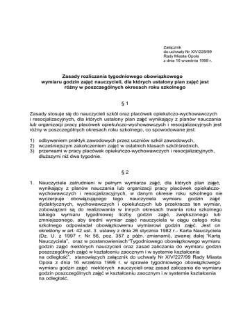 =DáF]QLN GRXFKZDá\1U ;,9 5DG\0LDVWD2SROD ]GQLDZU]HQLD U =DVDG\UR]OLF]DQLDW\JRGQLRZHJRRERZL]NRZHJR Z\PLDUXJRG]LQ]DM üQDXF]\FLHOLGOD NWyU\FKXVWDORQ\SODQ]DM üMHVW Uy*Q\ZSRV]F]HJyOQ\FKRNUHVDFKURNXV]NROQHJR =DVDG\VWRVXMHVL GRQDXF]\FLHOLV]NyáRUD]SODFyZHNRSLHNXF]RZ\FKRZDZF]\FK LUHVRFMDOL]DF\MQ\FKGODNWyU\FKXVWDORQ\SODQ]DM üZ\QLNDMF\]SODQyZQDXF]DQLD OXERUJDQL]DFMLSUDF\SODFyZHNRSLHNXF]RZ\FKRZDZF]\FKLUHVRFMDOL]DF\MQ\FKMHVW Uy*Q\ZSRV]F]HJyOQ\FKRNUHVDFKURNXV]NROQHJRFRVSRZRGRZDQHMHVW RGE\ZDQLHPSUDNW\N]DZRGRZ\FKSU]H]XF]QLyZV]Nyá]DZRGRZ\FK ZF]HQLHMV]\P]DNRF]HQLHP]DM üZRVWDWQLFKNODVDFKV]NyáUHGQLFK SU]HUZDPLZSUDF\SODFyZHNRSLHNXF]RZ\FKRZDZF]\FKLUHVRFMDOL]DF\MQ\FK GáX*V]\PLQL* GZDW\JRGQLH 1DXF]\FLHOH ]DWUXGQLHQL Z SHáQ\P Z\PLDU]H ]DM ü GOD NWyU\FK SODQ ]DM ü Z\QLNDMF\ ] SODQyZ QDXF]DQLD OXE RUJDQL]DFML SUDF\ SODFyZHN RSLHNXF]R Z\FKRZDZF]\FK L UHVRFMDOL]DF\MQ\FK Z GDQ\P RNUHVLH URNX V]NROQHJR QLH Z\F]HUSXMH RERZL]XMFHJR WHJR QDXF]\FLHOD Z\PLDUX JRG]LQ ]DM ü G\GDNW\F]Q\FK Z\FKRZDZF]\FK L RSLHNXF]\FK OXE SU]HNUDF]D WHQ Z\PLDU ]RERZL]DQL V GR UHDOL]RZDQLD Z LQQ\FK RNUHVDFK WUZDQLD URNX V]NROQHJR WDNLHJR Z\PLDUX W\JRGQLRZHM OLF]E\ JRG]LQ ]DM ü ]ZL NV]RQHJR OXE ]PQLHMV]RQHJR DE\ UHGQL Z\PLDU ]DM ü QDXF]\FLHOD Z FLJX FDáHJR URNX V]NROQHJR RGSRZLDGDá RERZL]NRZHPX Z\PLDURZL JRG]LQ ]DM ü -HVW RQ RNUHORQ\ZDUWXVWXVWDZ\]GQLDVW\F]QLDU .DUWD1DXF]\FLHOD '] 8 ] U 1U SR] ] Sy(Q ]PLDQDPL ]ZDQHM GDOHM ³.DUW 1DXF]\FLHOD´RUD]ZSRVWDQRZLHQLDFK³7\JRGQLRZHJRRERZL]NRZHJRZ\PLDUX JRG]LQ ]DM ü QLHNWyU\FK QDXF]\FLHOL RUD] ]DVDG ]DOLF]DQLD GR Z\PLDUX JRG]LQ SRV]F]HJyOQ\FK]DM üZNV]WDáFHQLX]DRF]Q\PLZV\VWHPLHNV]WDáFHQLD QD RGOHJáRü´ VWDQRZLF\FK ]DáF]QLN GR XFKZDá\ 1U ;,9 5DG\ 0LDVWD 2SROD ] GQLD ZU]HQLD U Z VSUDZLH W\JRGQLRZHJR RERZL]NRZHJR Z\PLDUXJRG]LQ]DM üQLHNWyU\FKQDXF]\FLHOL RUD]]DVDG]DOLF]DQLDGRZ\PLDUX JRG]LQSRV]F]HJyOQ\FK]DM üZNV]WDáFHQLX]DRF]Q\PLZV\VWHPLHNV]WDáFHQLD QDRGOHJáRü 8VWDORQ\GODQDXF]\FLHODQD]DVDGDFKRNUHORQ\FKZXVWZ\PLDUJRG]LQ]DM ü Uy*Q\ZSRV]F]HJyOQ\FKRNUHVDFKURNXV]NROQHJRQLHPR*HZRNUHVDFKUHDOL]DFML ]ZL NV]RQHJRZ\PLDUXJRG]LQ]DM üSU]HNUDF]Dü]WHJRW\WXáXHWDWX 3ODQ ]DM ü XVWDORQ\ ZHGáXJ ]DVDG R NWyU\FK PRZD Z XVW SRZLQLHQ E\ü RNUHORQ\GODND*GHJRQDXF]\FLHODZSODQLHRUJDQL]DF\MQ\PQDGDQ\URNV]NROQ\ LSRGDQ\QDXF]\FLHORZLGRZLDGRPRFLSU]HGUR]SRF] FLHPURNXV]NROQHJR ZZ\MWNRZ\FKSU]\SDGNDFKQLHSy(QLHMQL* GRZU]HQLD 'OD QDXF]\FLHOL NWyU\P Z SODQLH RUJDQL]DF\MQ\P QD GDQ\ URN V]NROQ\ SU]\G]LHORQR OLF]E JRG]LQ ]DM ü SU]HNUDF]DMF W\JRGQLRZ\ RERZL]NRZ\ Z\PLDU JRG]LQ ]DM ü JRG]LQDPL SRQDGZ\PLDURZ\PL V JRG]LQ\ ]DM ü UHDOL]RZDQH SRQDG W\JRGQLRZ\ RERZL]NRZ\ Z\PLDU JRG]LQ ]DM ü RNUHORQ\ ZHGáXJ]DVDGXVWDORQ\FKZXVW 'OD QDXF]\FLHOL ]DWUXGQLRQ\FK Z QLHSHáQ\PZ\PLDU]H ]DM ü UHDOL]XMF\FK Uy*Q\ Z\PLDU ]DM ü Z SRV]F]HJyOQ\FK RNUHVDFK URNX V]NROQHJR Z XPRZLHR SUDF QDOH*\RNUHOLüUHGQLZ\PLDUJRG]LQ]DM üGODFDáHJRRNUHVX]DWUXGQLHQLD 2ERZL]NRZ\ Z\PLDU JRG]LQ ]DM ü QDXF]\FLHOD ]DWUXGQLRQHJR Z SHáQ\P Z\PLDU]H SURZDG]FHJR ]DM FLD ] SU]HGPLRWyZ R Uy*Q\P Z\PLDU]H JRG]LQ XVWDOD VL ZHGáXJ SU]HGPLRWX GOD NWyUHJR Z\PLDU MHVW NRU]\VWQLHMV]\ MH*HOL QDXF]\FLHO QDXF]D WHJR SU]HGPLRWX FR QDMPQLHM Z SRáRZLH RERZL]NRZHJR Z\PLDUX 'RRERZL]NRZHJRZ\PLDUXJRG]LQ]DM üQDXF]\FLHODZOLF]DVL UyZQLH* JRG]LQ\ QDG]RURZDQLDLSU]HSURZDG]DQLDHJ]DPLQyZGRMU]DáRFL =DVDG\ RNUHORQH Z XVW VWRVXMH VL RGSRZLHGQLR GR G\UHNWRUyZ V]Nyá RUD] LQQ\FK QDXF]\FLHOL NWyU\P SRZLHU]RQR VWDQRZLVND NLHURZQLF]H MH*HOL F]\QQRFL ]ZL]DQH ] QDG]RURZDQLHP SLVHPQ\FK HJ]DPLQyZ GRMU]DáRFL L SU]HSUR ZDG]DQLHPHJ]DPLQyZXVWQ\FKSU]HNUDF]DM RERZL]XMF\LFKZ\PLDU]DM ü 3U]\G]LHORQH Z SODQLH RUJDQL]DF\MQ\P JRG]LQ\ ]DM ü QLH ]UHDOL]RZDQH SU]H] QDXF]\FLHOD ] SRZRGX FKRURE\ OXE ] SU]\F]\Q OH*F\FK SR VWURQLH SUDFRGDZF\QLH Z\PLHQLRQ\FK Z WUDNWXMH VL GOD URF]QHJR UR]OLF]HQLD JRG]LQ MDN JRG]LQ\ ]DM ü ]UHDOL]RZDQH]]DVWU]H*HQLHPXVW : SU]\SDGNX UR]ZL]DQLD ] QDXF]\FLHOHP VWRVXQNX SUDF\ SU]HG XSá\ZHP URNX V]NROQHJRQDNWyU\]RVWDáXVWDORQ\Uy*Q\SODQ]DM üUR]OLF]HQLH]SU]\G]LHORQ\FK ZSODQLHRUJDQL]DF\MQ\PJRG]LQ]DM üQDVW SXMH]GDW XVWDQLDVWRVXQNXSUDF\ ] W\P *H ]D ZV]\VWNLH SU]HSUDFRZDQH PLHVLFH EH] Z]JO GX QD Z\PLDU ]UHDOL]RZDQ\FK ]DM ü SU]\VáXJXMH QDXF]\FLHORZL SUDZR GR Z\QDJURG]HQLD ]DVDGQLF]HJR]DRERZL]NRZ\W\JRGQLRZ\Z\PLDUJRG]LQ]DM ü-HVWRQRNUHORQ\ Z DUW XVW .DUW\ 1DXF]\FLHOD RUD] Z SRVWDQRZLHQLDFK ³7\JRGQLRZHJR RERZL]NRZHJR Z\PLDUX JRG]LQ ]DM ü QLHNWyU\FK QDXF]\FLHOL RUD] ]DVDG ]DOLF]DQLD GR Z\PLDUX JRG]LQ SRV]F]HJyOQ\FK ]DM ü Z NV]WDáFHQLX ]DRF]Q\P L Z V\VWHPLH NV]WDáFHQLD QD RGOHJáRü´ VWDQRZLF\FK ]DáF]QLN GR XFKZDá\ 1U ;,9 5DG\ 0LDVWD 2SROD] GQLD ZU]HQLD U Z VSUDZLH W\JRGQLRZHJR RERZL]NRZHJR Z\PLDUX JRG]LQ ]DM ü QLHNWyU\FK QDXF]\FLHOL RUD] ]DVDG ]DOLF]DQLD GR Z\PLDUX JRG]LQSRV]F]HJyOQ\FK]DM üZNV]WDáFHQLX]DRF]Q\PLZV\VWHPLHNV]WDáFHQLD QDRGOHJáRüDWDN*H]DSU]HSUDFRZDQHZW\PF]DVLHJRG]LQ\SRQDGZ\PLDURZH