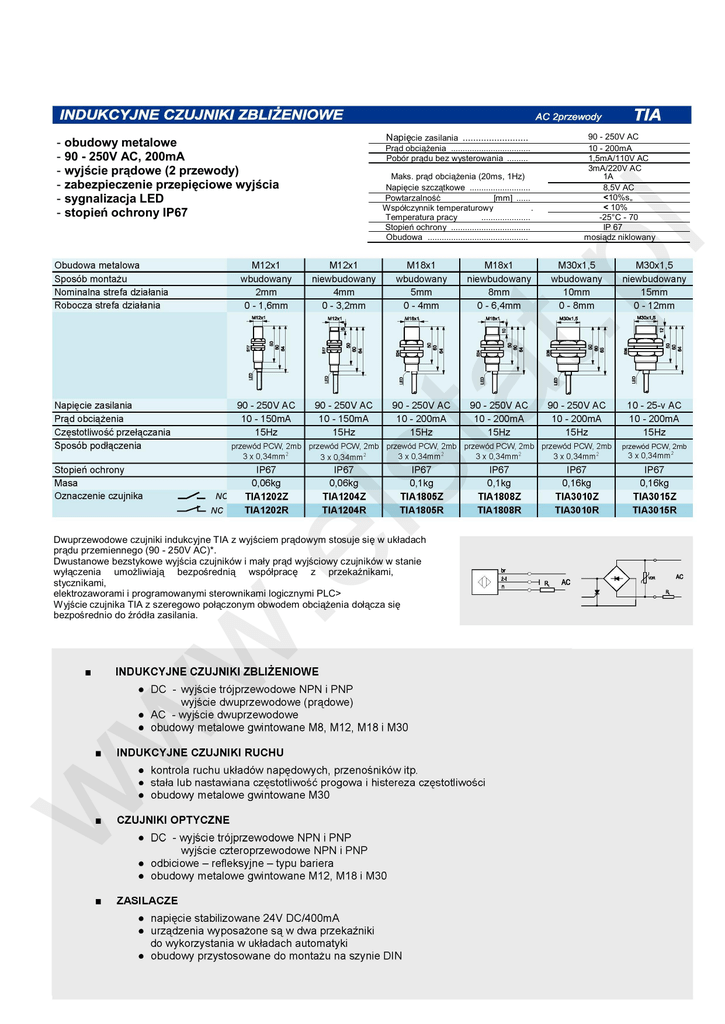 Maks. pr d obci enia (20ms, 1Hz) Napi cie szcz tkowe .......................... Powtarzalno [mm] ...... Wsp czynnik temperaturowy . Temperatura pracy ..................... Stopie ochrony .................................. Obudowa ........................................... 90 - 250V AC 10 - 200mA 1,5mA/110V AC 3mA/220V AC 1A 8,5V AC <10%s„ < 10% -25°C - 70 IP 67 mosi dz niklowany l Napi cie zasilania ......................... Pr d obci enia .................................. Pobór pr du bez wysterowania ......... obudowy metalowe 90 - 250V AC, 200mA wyj cie pr dowe (2 przewody) zabezpieczenie przepi ciowe wyj cia sygnalizacja LED stopie ochrony IP67 ls ta t.p - w w w .e Dwuprzewodowe czujniki indukcyjne TIA z wyj ciem pr dowym stosuje si w uk adach pr du przemiennego (90 - 250V AC)*. Dwustanowe bezstykowe wyj cia czujników i ma y pr d wyj ciowy czujników w stanie wy czenia umo liwiaj bezpo redni wspó prac z przeka nikami, stycznikami, elektrozaworami i programowanymi sterownikami logicznymi PLC> Wyj cie czujnika TIA z szeregowo po czonym obwodem obci enia do cza si bezpo rednio do ród a zasilania.