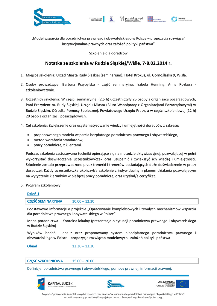 „Model wsparcia dla poradnictwa prawnego i obywatelskiego w Polsce – propozycja rozwiązań instytucjonalno-prawnych oraz założeń polityki państwa” Szkolenie dla doradców Notatka ze szkolenia w Rudzie Śląskiej/Wiśle, 7-8.02.2014 r. 1. Miejsce szkolenia: Urząd Miasta Rudy Śląskiej (seminarium); Hotel Krokus, ul. Górnośląska 9, Wisła. 2. Osoby prowadzące: Barbara Przybylska - część seminaryjna; Izabela Henning, Anna Rozkosz szkoleniowczynie. 3. Uczestnicy szkolenia: W części seminaryjnej (2,5 h) uczestniczyły 25 osoby z organizacji pozarządowych, Pani Prezydent m. Rudy Śląskiej, Urzędu Miasta (Biuro Współpracy z Organizacjami Pozarządowymi) w Rudzie Śląskim, Ośrodka Pomocy Społecznej, Powiatowego Urzędu Pracy, a w części szkoleniowej (12 h) 20 osób z organizacji pozarządowych. 4. Cel szkolenia: Zwiększenie oraz usystematyzowanie wiedzy i umiejętności doradców z zakresu: proponowanego modelu wsparcia bezpłatnego poradnictwa prawnego i obywatelskiego, metod wdrażania standardów, pracy poradniczej z klientami. Podczas szkolenia zastosowano techniki opierające się na metodzie aktywizacyjnej, pozwalającej w pełni wykorzystać doświadczenie uczestników/czek oraz uzupełnić i zwiększyć ich wiedzę i umiejętności. Szkolenie zostało przeprowadzone przez trenerki i trenerów posiadających duże doświadczenie w pracy doradczej. Każdy uczestnik/czka ukończył/a szkolenie z indywidualnym planem działania pozwalającym na wytyczenie kierunków w bieżącej pracy poradniczej oraz uzyskał/a certyfikat. 5. Program szkoleniowy Dzień 1 CZĘŚĆ SEMINARYJNA 10.00 – 12.30 Podstawowe informacje o projekcie „Opracowanie kompleksowych i trwałych mechanizmów wsparcia dla poradnictwa prawnego i obywatelskiego w Polsce” Mapa poradnictwa – Kontekst lokalny (prezentacje o sytuacji poradnictwa prawnego i obywatelskiego w Rudzie Śląskim) Wyników badań i analiz oraz proponowany system nieodpłatnego poradnictwa prawnego i obywatelskiego w Polsce - propozycje rozwiązań modelowych i założeń polityki państwa Obiad 12.30 – 13.30 CZĘŚĆ SZKOLENIOWA 15.00 – 20.00 Definicje: poradnictwa prawnego i obywatelskiego, pomocy prawnej, informacji prawnej. 2 Szkolenie PPiO w Wiśle 7-8.02.2014 r. Standardy pracy: dotyczące usług (nieodpłatność, dostępność, rzetelność udzielanych porad, poufność, rzetelność informacji) i osoby doradcy. Metodologia pracy doradcy: pierwszy kontakt z klientem: informacje na temat działania i sposobu funkcjonowania placówki poradniczej. Kolacja 20.00 Dzień 2 12.00 – 19.30 Metodologia pracy doradcy (c.d.): diagnoza problemu: techniki rozmowy, zadawanie pytań, rozpoznanie problemu i oczekiwań klienta, określanie problemu; udzielanie porad: poszukiwanie rozwiązań, wybór rozwiązania wspólnie z klientem, przedstawienie możliwych rozwiązań, gdzie należy szukać informacji, aktualizacja stanu prawnego i zasobów wiedzy na bieżąco. zakończenie porady – dokumentacja, o prowadzonych sprawach; bezpieczeństwo pracy doradczej (fizycznej, psychicznej i prawnej), trudne sytuacje z klientem. prowadzenie bazy danych, zbieranie informacji Kontrola jakości udzielanych porad. Indywidualny plan samodoskonalenia. Podsumowanie, zakończenie. Obiad 14.00-14.30 6. Podczas seminarium, zabrały głos p. Grażyna Dziedzic, Prezydent miasta Ruda Śląska, p. Anna Krzysteczko, Wice-Prezydent ds. Społecznych, i omówiły działalność w zakresie usług poradniczych. Następnie p. Karina Kaczyńska, Wice-dyrektor MOPS i p. Iwona Bagińska Woźniak, Dyrektor Powiatowego Urzędu Pracy powitali uczestników seminarium. Przemysław Stich, pracownik Biura Porad Obywatelskich w Rudzie Śląskiej, przedstawił historię prób uchwalenia ustaw sejmowych normujących system poradnictwa prawnego i obywatelskiego w kraju. Pani Barbara Dworak, Prezes Stowarzyszenia Rudzkiego Konta Pomocy przedstawiła działania Biura Porad Obywatelskich, funkcjonującego w Rudzie Śląskiej od 2002 r. 7. Szkolenie odbyło się i przebiegało się zgodnie z programem. Uczestnicy aktywnie angażowali się w ćwiczenia i dyskusje. W załączeniu przedstawiono wyniki ankiety oceniającej szkolenia. Barbara Przybylska, Koordynator Projektu Związek Biur Porad Obywatelskich Warszawa, 24 marca 2014 r. 3 Szkolenie PPiO w Wiśle 7-8.02.2014 r. „Model wsparcia dla poradnictwa prawnego i obywatelskiego w Polsce propozycja rozwiązań instytucjonalno-prawnych oraz założeń polityki państwa” Szkolenie dla doradców Wisła, 7-8 lutego 2014 r. Wyniki ankiety oceniającej Szkolenie n = 18 wypełnionych ankiet (90% uczestników szkolenia) 1. Czy poziom merytoryczny szkolenia spełnił Pani/Pana oczekiwania? (brak odpowiedzi: 2) Nie spełnił (1) Raczej nie spełnił (2) Prawie spełnił (3) Całkowicie spełnił (4) 0 1 3 12 Prosimy o krótkie uzasadnienie oceny: (brak odpowiedzi: 10) Ocena Uzasadnienie Wprowadzono nowe tematy np. etyka pracy doradcy, która była innowacyjną w treści i 4 metodzie przekazu. 4 Przekazanie treści odpowiadały tematowi szkolenie. 4 Kompetencje wykładowców, prawność pracy organizatorów. Dał odpowiedzi na nurtujące pytania. Wszystko zostało w sposób jasny i precyzyjny 4 wytłumaczone. 3 Założenia zostały omówione, mniej lub bardziej szczegółowo. Założenia określone, lecz zakres tematyczny mniej typowy dla szkoleń dla początkujących 2 doradców. brak odp. Doskonały przekaz, wysoka wiedza. brak odp. Kompetencje wykładowców, otwartość, dobry przekaz wiedzy. 2. Czy zgadza się Pan/Pani z poniższymi twierdzeniami? nie raczej się zgadzam nie się zgadzam A. Podczas szkolenia uzyskano nową wiedzę. raczej się zgadzam zgadzam się 6 12 B. Podczas szkolenia nabyto nowe umiejętności. 1 6 11 C. Nowa wiedza będzie przydatna w pracy. 1 4 13 trudno powiedzieć 3. Jak Pani/Pan ocenia stronę organizacyjną szkolenia? Skala oceny od 1 - najniższa ocena, do 5 najwyższa ocena: 4 Szkolenie PPiO 