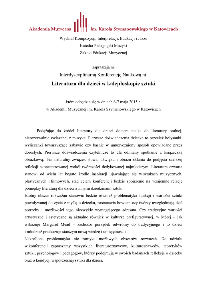 Wydział Kompozycji, Interpretacji, Edukacji i Jazzu Katedra Pedagogiki Muzyki Zakład Edukacji Muzycznej zapraszają na Interdyscyplinarną Konferencję Naukową nt. Literatura dla dzieci w kalejdoskopie sztuki która odbędzie się w dniach 6-7 maja 2015 r. w Akademii Muzycznej im. Karola Szymanowskiego w Katowicach Podążając do źródeł literatury dla dzieci dociera nauka do literatury oralnej, nierozerwalnie związanej z muzyką. Pierwsze doświadczenia dziecka to przecież kołysanki, wyliczanki towarzyszące zabawie czy baśnie w umuzyczniony sposób opowiadane przez dorosłych. Pierwsze doświadczenia czytelnicze to dla odmiany spotkanie z książeczką obrazkową. Ten naturalny związek słowa, dźwięku i obrazu skłania do podjęcia szerszej refleksji skoncentrowanej wokół twórczości dedykowanej najmłodszym. Literatura czwarta stanowi od wielu lat bogate źródło inspiracji ujawniające się w sztukach muzycznych, plastycznych i filmowych, stąd celem konferencji będzie spojrzenie na wzajemne relacje pomiędzy literaturą dla dzieci a innymi dziedzinami sztuki. Istotny obszar rozważań stanowić będzie również problematyka funkcji i wartości sztuki powoływanej do życia z myślą o dziecku, zastanawia bowiem czy twórcy uwzględniają dziś potrzeby i możliwości tego niezwykle wymagającego adresata. Czy tradycyjne wartości artystyczne i estetyczne są aktualne również w kulturze prefiguratywnej, w której – jak wskazuje Margaret Mead – zachodzi porządek odwrotny do tradycyjnego i to dzieci i młodzież przekazuje starszym nową wiedzę i umiejętności? Nakreślona problematyka nie zamyka możliwych obszarów rozważań. Do udziału w konferencji zapraszamy wszystkich literaturoznawców, kulturoznawców, teoretyków sztuki, psychologów i pedagogów, którzy podejmują w swoich badaniach refleksję o dziecku oraz o kondycji współczesnej sztuki dla dzieci. Zgłoszenia tematu prosimy nadsyłać do dnia 15 kwietnia 2015 r. na adres Akademii (z dopiskiem „KONFERENCJA - EDUKACJA”) lub drogą elektroniczną na adres: [email protected]. Zgłoszenie winno zawierać następujące dane: imię i nazwisko, miejsce zatrudnienia, zajmowane stanowisko i tytuł, adres, telefon, e-mail, tytuł wystąpienia i abstrakt (5-10 zdań) oraz dodatkowe potrzeby (np. sprzęt audiowizualny). W programie konferencji przewidujemy wystąpienia do 20 minut. Pełną wersję tekstu do druku (do 15 stron, zasady edytowania publikacji w załączeniu) należy złożyć do 31 maja 2015 r. Konferencji towarzyszyć będzie Koncert. Przewidywana opłata konferencyjna wynosi 350 zł, obejmuje materiały konferencyjne, wydanie publikacji (po uzyskaniu pozytywnej recenzji tekstu) oraz bufet kawowy i obiad. Zakwaterowanie i wyżywienie (śniadanie, kolacja) we własnym zakresie uczestnika. Szczegółowych informacji udziela dr Grażyna Darłak /e-mail [email protected] lub tel. 509119357/. Opłaty na konto Akademii: ING Bank Śląski. O/Katowice nr rachunku: 22 1050 1214 1000 0007 0000 7875 należy uiścić do 20 kwietnia 2015 r. (z dopiskiem „KONFERENCJA- EDUKACJA”) z wyrazami szacunku dr Grażyna Darłak Kierownik Zakładu Edukacji Muzycznej
