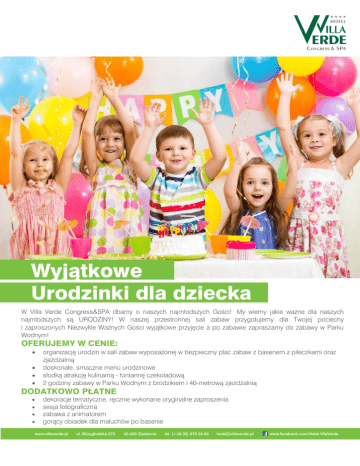 Wyjątkowe Urodzinki dla dziecka W Villa Verde Congress&SPA dbamy o naszych najmłodszych Gości! My wiemy jakie ważne dla naszych najmłodszych są URODZINY! W naszej przestronnej sali zabaw przygotujemy dla Twojej pociechy i zaproszonych Niezwykle Ważnych Gości wyjątkowe przyjęcie a po zabawie zapraszamy do zabawy w Parku Wodnym! OFERUJEMY W CENIE: organizację urodzin w sali zabaw wyposażonej w bezpieczny plac zabaw z basenem z piłeczkami oraz zjeżdżalnią doskonałe, smaczne menu urodzinowe słodką atrakcję kulinarną - fontannę czekoladową 2 godziny zabawy w Parku Wodnym z brodzikiem i 40-metrową zjeżdżalnią DODATKOWO PŁATNE dekoracje tematyczne, ręcznie wykonane oryginalne zaproszenia sesja fotograficzna zabawa z animatorem gorący obiadek dla maluchów po basenie www.villaverde.pl ul. Mrzygłodzka 273 42-400 Zawiercie tel. (+48 32) 670 38 00 [email protected] www.facebook.com/Hotel.VllaVerde MENU URODZINOWE TORTY 55 PLN/dziecko Pizza naszego wypieku Deser do wyboru: Shake truskawkowy z lodami śmietankowymi // Puchar lodów owocowych z bitą śmietaną Przekąski drobne (chipsy, paluszki, żelki) Kanapeczki dekoracyjne Kolorowa fontanna czekoladowa z filetami owocowymi i bakaliami Napoje: woda mineralna bez ograniczeń 65 PLN /1 KG/10 osób Serdecznie polecamy delikatne torty wypiekane z naturalnych składników przez hotelowego Cukiernika. Polecamy w szczególności: Tort malinowy z waniliowym creme brűlle mus malinowy, świeże maliny, waniliowy creme brűlle, polewa z białej czekolady, jasny biszkopt waniliowy Tort Tiramisu mus z serka Mascarpone, likier z likierem Kahlua, biszkopt kakaowy OBIADY DZIECIĘCE 40 PLN /osoba ZESTAW I Tradycyjny rosół z kury z makaronem Pulpety wołowe w sosie pomidorowym Ziemniaki puree Surówka z marchewki Melba - puchar lodów z owocami i polewą czekoladową ZESTAW II Zupa krem z pomidorów z groszkiem ptysiowym Tortilla z grillowanym kurczakiem Frytki Sałatka colesław Melba - puchar lodów z owocami i polewą czekoladową kawowy Tort z białej czekolady z malinami mus z białej czekolady, świeże maliny, biała polewa czekoladowa, jasny biszkopt waniliowy Tort serowy z owocami leśnymi mus serowy, owoce leśne, jasny biszkopt waniliowy Tort karmelowo-kawowy mus karmelowy, karmelizowane gruszki, likier Amaretto, biszkopt Sacher nasączony kawą CIASTA DLA GOŚCI 29 PLN /1 SZT /6 PORCJI CENNIK NAPOJÓW Wybór ciast dla Gości przygotowane w logowanych pudełkach. 6 porcji w paczce. NAPOJE ZIMNE 12 PLN /1 LITR Soki owocowe w dzbankach napoje gazowane firmy Pepsi (PET) Napoje zimne gazowane 0,2 l – a la carte wg zużycia NAPOJE GORĄCE BUFET KAWOWY 100 PLN/termos do 15 osób Świeżo parzona kawa serwowana w termosie Dodatki: mleko, cukier Wybór prestiżowych herbat smakowych Sir Williams Dodatki: mleko, cytryna, cukier Ciasta do wyboru: sernik wiedeński, karmelowe, Adwokat, Tiramisu, ambasador, szarlotka, pijak, makowiec, truskawkowe z galaretką, miodownik KAWA Z EKSPRESU Kawa z ekspresu – serwowana wg zużycia A la carte od 8 do 12 zł www.villaverde.pl ul. Mrzygłodzka 273 42-400 Zawiercie tel. (+48 32) 670 38 00 [email protected] www.facebook.com/Hotel.VillaVerde