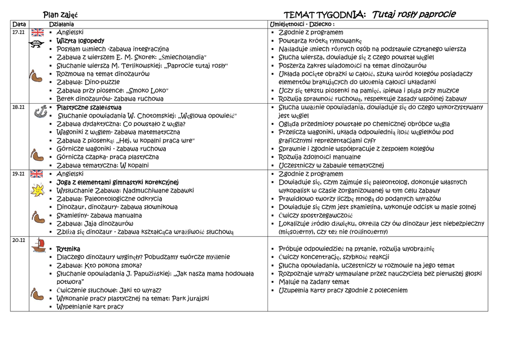 TEMAT TYGODNIA: Plan zajęć Data 17.11 18.11 19.11 Działania Angielski Wizyta logopedy Posyłam uśmiech -zabawa integracyjna Zabawa z wierszem E. M. Skorek: „Śmiecholandia" Słuchanie wiersza M. Terlikowskiej: „Paprocie tutaj rosły" Rozmowa na temat dinozaurów Zabawa: Dino-puzzle Zabawa przy piosence: „Smoko Loko" Berek dinozaurów- zabawa ruchowa Plastyczne szaleństwa Słuchanie opowiadania W. Chotomskiej: „Węglowa opowieść" Zabawa dydaktyczna: Co powstało z węgla? Wagoniki z węglem- zabawa matematyczna Zabawa z piosenką: „Hej, w kopalni praca wre" Górnicze wagoniki - zabawa ruchowa Górnicza czapka- praca plastyczna Zabawa tematyczna: W kopalni Angielski Joga z elementami gimnastyki korekcyjnej Wysłuchanie Zabawa: Nadmuchiwane zabawki Zabawa: Paleontologiczne odkrycia Dinozaur, dinozaury- zabawa słownikowa Skamieliny- zabawa manualna Zabawa: Jaja dinozaurów Zbliża się dinozaur - zabawa kształcąca wrażliwość słuchową Tutaj rosły paprocie Umiejętności - Dziecko : Zgodnie z programem Powtarza krótką rymowankę Naśladuje śmiech różnych osób na podstawie czytanego wiersza Słucha wiersza, dowiaduje się z czego powstał węgiel Poszerza zakres wiadomości na temat dinozaurów Układa pocięte obrazki w całość, szuka wśród kolegów posiadaczy elementów brakujących do ułożenia całości układanki Uczy się tekstu piosenki na pamięć, śpiewa i pląsa przy muzyce Rozwija sprawność ruchową, respektuje zasady wspólnej zabawy Słucha uważnie opowiadania, dowiaduje się do czego wykorzystywany jest węgiel Ogląda przedmioty powstałe po chemicznej obróbce węgla Przelicza wagoniki, układa odpowiednią ilość węgielków pod graficznymi reprezentacjami cyfr Sprawnie i zgodnie współpracuje z zespołem kolegów Rozwija zdolności manualne Uczestniczy w zabawie tematycznej Zgodnie z programem Dowiaduje się, czym zajmuje się paleontolog, dokonuje własnych wykopalisk w czasie zorganizowanej w tym celu zabawy Prawidłowo tworzy liczbę mnogą do podanych wyrazów Dowiaduje się czym jest skamielina, wykonuje odcisk w masie solnej Ćwiczy spostrzegawczość Lokalizuje źródło dźwięku, określa czy ów dinozaur jest niebezpieczny (mięsożerny), czy też nie (roślinożerny) 20.11 Rytmika Dlaczego dinozaury wyginęły? Pobudzamy twórcze myślenie Zabawa: Kto pokona smoka? Słuchanie opowiadania J. Papuzińskiej: „Jak nasza mama hodowała potwora” Ćwiczenie słuchowe: Jaki to wyraz? Wykonanie pracy plastycznej na temat: Park jurajski Wypełnianie kart pracy Próbuje odpowiedzieć na pytanie, rozwija wyobraźnię Ćwiczy koncentrację, szybkość reakcji Słucha opowiadania, uczestniczy w rozmowie na jego temat Rozpoznaje wyrazy wymawiane przez nauczyciela bez pierwszej głoski Maluje na zadany temat Uzupełnia karty pracy zgodnie z poleceniem 21.11 Basen-zajęcia fakultatywne Słuchanie bajki: „W krainie smoków" Układanie smoków z drewnianych klocków Zabawa dramowa: Jakim jesteś smokiem? Konkurs ziania ogniem Zabawa: Słodka zapamiętywanka Smoka Łasucha Zabawa: "Stop sylaba ba" Syczący smok- zabawa ortofoniczna Słucha z uwagą opowiadania Konstruuje postać smoka według własnego pomysłu Wyraża emocje podczas improwizacji Wydmuchuje z miseczki papierowe kulki Ćwiczy pamięć Uważnie przysłuchuje się wymawianym przez nauczyciela wyrazom, reaguje na sylabę "ba" podnosząc wówczas znak stopu Ćwiczy narządy mowy