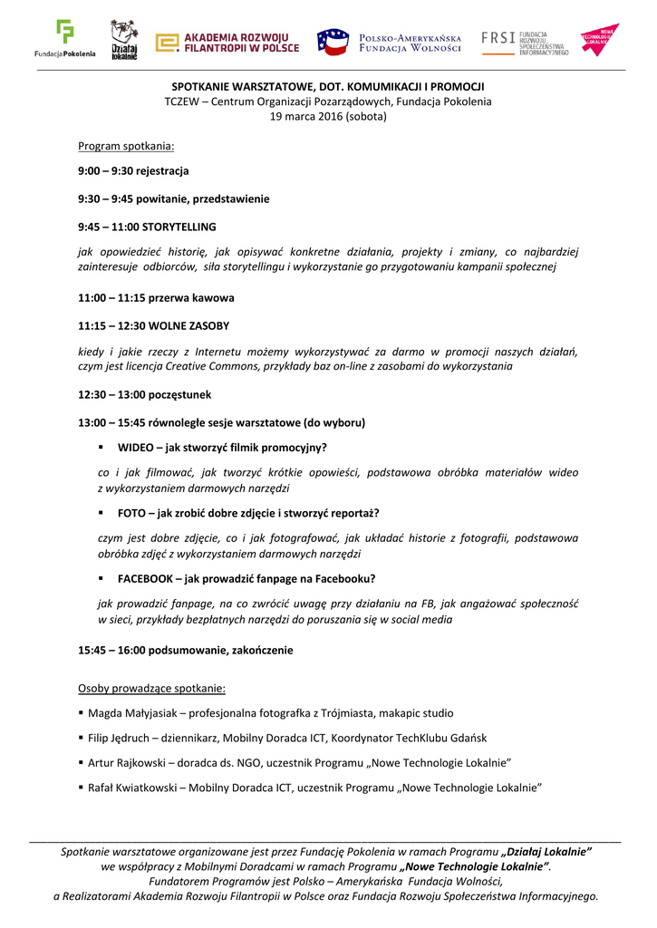 SPOTKANIE WARSZTATOWE, DOT. KOMUMIKACJI I PROMOCJI TCZEW – Centrum Organizacji Pozarządowych, Fundacja Pokolenia 19 marca 2016 (sobota) Program spotkania: 9:00 – 9:30 rejestracja 9:30 – 9:45 powitanie, przedstawienie 9:45 – 11:00 STORYTELLING jak opowiedzieć historię, jak opisywać konkretne działania, projekty i zmiany, co najbardziej zainteresuje odbiorców, siła storytellingu i wykorzystanie go przygotowaniu kampanii społecznej 11:00 – 11:15 przerwa kawowa 11:15 – 12:30 WOLNE ZASOBY kiedy i jakie rzeczy z Internetu możemy wykorzystywać za darmo w promocji naszych działań, czym jest licencja Creative Commons, przykłady baz on-line z zasobami do wykorzystania 12:30 – 13:00 poczęstunek 13:00 – 15:45 równoległe sesje warsztatowe (do wyboru) WIDEO – jak stworzyć filmik promocyjny? co i jak filmować, jak tworzyć krótkie opowieści, podstawowa obróbka materiałów wideo z wykorzystaniem darmowych narzędzi FOTO – jak zrobić dobre zdjęcie i stworzyć reportaż? czym jest dobre zdjęcie, co i jak fotografować, jak układać historie z fotografii, podstawowa obróbka zdjęć z wykorzystaniem darmowych narzędzi FACEBOOK – jak prowadzić fanpage na Facebooku? jak prowadzić fanpage, na co zwrócić uwagę przy działaniu na FB, jak angażować społeczność w sieci, przykłady bezpłatnych narzędzi do poruszania się w social media 15:45 – 16:00 podsumowanie, zakończenie Osoby prowadzące spotkanie: Magda Małyjasiak – profesjonalna fotografka z Trójmiasta, makapic studio Filip Jędruch – dziennikarz, Mobilny Doradca ICT, Koordynator TechKlubu Gdańsk Artur Rajkowski – doradca ds. NGO, uczestnik Programu „Nowe Technologie Lokalnie” Rafał Kwiatkowski – Mobilny Doradca ICT, uczestnik Programu „Nowe Technologie Lokalnie” __________________________________________________________________________________________________ Spotkanie warsztatowe organizowane jest przez Fundację Pokolenia w ramach Programu „Działaj Lokalnie” we współpracy z Mobilnymi Doradcami w ramach Programu „Nowe Technologie Lokalnie”. Fundatorem Programów jest Polsko – Amerykańska Fundacja Wolności, a Realizatorami Akademia Rozwoju Filantropii w Polsce oraz Fundacja Rozwoju Społeczeństwa Informacyjnego.