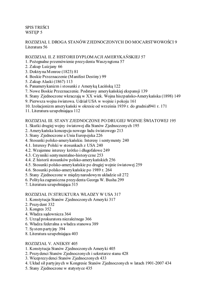 SPIS TREŚCI WSTĘP 5 ROZDZIAŁ I. DROGA STANÓW ZJEDNOCZONYCH DO MOCARSTWOWOŚCI 9 Literatura 56 ROZDZIAŁ II. Z HISTORII DYPLOM ACJI AM ERYKAŃSKIEJ 57 1. PoŜegnalne przemówienie prezydenta Waszyngtona 57 2. Zakup Luizjany 66 3. Doktryna M onroe (1823) 81 4. Boskie Przeznaczenie (M anifest Destiny) 99 5. Zakup Alaski (1867) 113 6. Panamerykanizm i stosunki z Ameryką Łacińską 122 7. Nowe Boskie Przeznaczenie. Podstawy amerykańskiej ekspansji 139 8. Stany Zjednoczone wkraczają w XX wiek. Wojna hiszpańsko-Amerykańska (1898) 149 9. Pierwsza wojna światowa. Udział USA w wojnie i pokoju 161 10. Izolacjonizm amerykański w okresie od września 1939 r. do grudnial941 r. 171 11. Literatura uzupełniająca 112 ROZDZIAŁ III. STANY ZJEDNOCZONE PO DRUGIEJ WOJNIE ŚWIATOWEJ 195 1. Skutki drugiej wojny światowej dla Stanów Zjednoczonych 195 2. Amerykańska koncepcja nowego ładu światowego 213 3. Stany Zjednoczone a Unia Europejska 226 4. Stosunki polsko-amerykańskie. Interesy i sentymenty 240 4.1. Interesy Polski w stosunkach z USA 240 4.2. Wzajemne interesy krótko i długofalowe 249 4.3. Czynniki sentymentalno-historyczne 253 4.4. Z historii stosunków polsko-amerykańskich 256 4.5. Stosunki polsko-amerykańskie po drugiej wojnie światowej 259 4.6. Stosunki polsko-amerykańskie po 1989 r. 264 5. Stany Zjednoczone w międzynarodowym układzie sił 272 6. Polityka zagraniczna prezydenta Georga W. Busha 299 7. Literatura uzupełniająca 315 ROZDZIAŁ IV.STRUKTURA WŁADZY W USA 317 1. Konstytucja Stanów Zjednoczonych Ameryki 317 2. Prezydent 332 3. Kongres 352 4. Władza sądownicza 364 5. Urząd prokuratora niezaleŜnego 366 6. Władza federalna a władza stanowa 389 7. System partyjny 394 8. Literatura uzupełniająca 403 ROZDZIAŁ V. ANEKSY 405 1. Konstytucja Stanów Zjednoczonych Ameryki 405 2. Prezydenci Stanów Zjednoczonych i sekretarze stanu 428 3. Wiceprezydenci Stanów Zjednoczonych 433 4. Układ sił partyjnych w Kongresie Stanów Zjednoczonych w latach 1901-2007 434 5. Stany Zjednoczone w statystyce 435