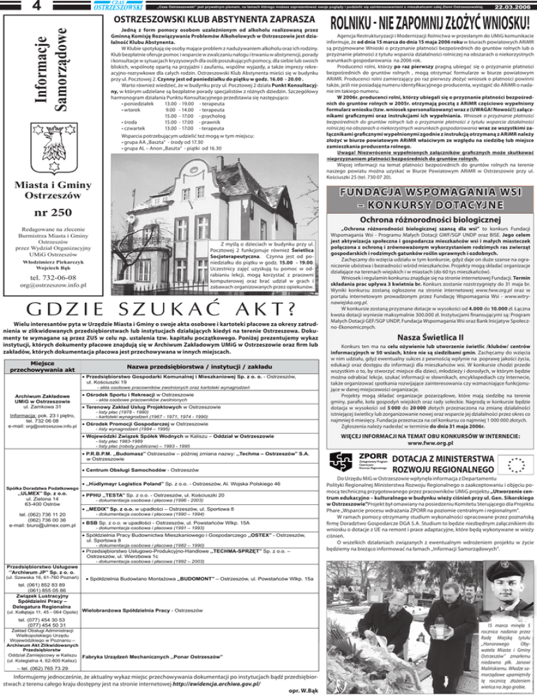 4 „Czas Ostrzeszowski” jest prywatnym pismem, na łamach którego możesz zaprezentować swoje poglądy i podzielić się zainteresowaniami z mieszkańcami całej Ziemi Ostrzeszowskiej. OSTRZESZOWSKI KLUB ABSTYNENTA ZAPRASZA Informacje Samorządowe Jedną z form pomocy osobom uzależnionym od alkoholu realizowaną przez Gminną Komisję Rozwiązywania Problemów Alkoholowych w Ostrzeszowie jest działalność Klubu Abstynenta. W Klubie spotykają się osoby mające problem z nadużywaniem alkoholu oraz ich rodziny. Klub bezpłatnie oferuje pomoc i wsparcie w zwalczaniu nałogu i trwaniu w abstynencji, porady i konsultacje w sytuacjach kryzysowych dla osób poszukujących pomocy, dla siebie lub swoich bliskich, wspólnotę opartą na przyjaźni i zaufaniu, wspólne wyjazdy, a także imprezy rekreacyjno-rozrywkowe dla całych rodzin. Ostrzeszowski Klub Abstynenta mieści się w budynku przy ul. Pocztowej 2. Czynny jest od poniedziałku do piątku w godz. 16.00 - 20.00 . Warto również wiedzieć, że w budynku przy ul. Pocztowej 2 działa Punkt Konsultacyjny, w którym udzielane są bezpłatne porady specjalistów z różnych dziedzin. Szczegółowy harmonogram działania Punktu Konsultacyjnego przedstawia się następująco: • poniedziałek 13.00 - 19.00 - terapeuta • wtorek 9.00 - 14.00 - terapeuta 15.00 - 17.00 - psycholog • środa 15.00 - 17.00 - prawnik • czwartek 13.00 - 17.00 - terapeuta Wsparcia potrzebującym udzielić też mogą w tym miejscu: • grupa AA „Baszta” - środy od 17.30 • grupa AL – Anon „Baszta” - piątki od 16.30 Miasta i Gminy Ostrzeszów Z myślą o dzieciach w budynku przy ul. Pocztowej 2 funkcjonuje również Świetlica Socjoterapeutyczna. Czynna jest od poniedziałku do piątku w godz. 15.00 - 19.00. Uczestnicy zajęć uzyskują tu pomoc w odrabianiu lekcji, mogą korzystać z pracowni komputerowej oraz brać udział w grach i zabawach organizowanych przez opiekunów. Włodzimierz Piekarczyk Wojciech Bąk tel. 732-06-08 [email protected] G DZ I E SZ U K AĆ A K T ? Wielu interesantów pyta w Urzędzie Miasta i Gminy o swoje akta osobowe i kartoteki płacowe za okresy zatrudnienia w zlikwidowanych przedsiębiorstwach lub instytucjach działających kiedyś na terenie Ostrzeszowa. Dokumenty te wymagane są przez ZUS w celu np. ustalenia tzw. kapitału początkowego. Poniżej prezentujemy wykaz instytucji, których dokumenty płacowe znajdują się w Archiwum Zakładowym UMiG w Ostrzeszowie oraz firm lub zakładów, których dokumentacja płacowa jest przechowywana w innych miejscach. ĀȀ̀ЀԀ܀̀ ࠀऀ̀ఀഀഀༀကȀༀ܀ༀᄀሀ ጀༀഀༀ̀ऀࠀ܀᐀ԀȀᔀᘀȀఀऀԀሀഀༀ܀ᜀ܀ȀကԀሀሀ᠀ЀȀ܀ᜀ܀ༀᄀᤀༀ᐀᠀ •Ѐ᠀ȀᜀကᔀԀᤀᨀԀༀȀᔀᘀༀऀጀༀᔀᬀༀȀఀԀऀᰀༀࠀ܀ᴀḀᴀကἀऀԀऀሀԀကᔀᜀఀᴀԀༀကἀऀ ᬀ!ऀᜀऀༀ!ऀༀ!ЀἀЀ$"᠀က#ᨀ"#%ᤀЀ ЀЀЀĀȀ̀Ѐ&ऀ'ᄀᘀĀ"#ࠀᘀЀఀ( ĀĀĀĀĀĀĀĀĀĀȀĀ̀ЀԀ̀Āऀࠀ܀Āఀ̀ഀऀༀЀကऀĀᄀऀሀༀጀഀ᐀Āఀ̀ᄀĀЀ̀ఀԀԀЀༀĀऀጀ̀ᔀఀᘀᄀᜀ •Ѐ᐀"Ȁༀကఀऀ ᬀༀȀᘀऀ܀Ԁऀ#ကఀȀက̀ἀԀЀЀ$"᠀က#ᨀ"#ऀᘀᨀ ĀĀĀĀĀĀĀĀĀĀȀĀ̀ЀԀ̀Āऀࠀ܀Āఀ̀ഀऀༀЀကऀĀᄀऀሀༀጀഀ᐀ •Ѐ$ကȀကᴀༀ%ऀఀഀऀᄀᔀഀ᠀ऀ&܀Ȁༀἀကఀᘀༀ%̀ЀЀЀ$"᠀က#ᨀ"#ऀᘀᨀ ĀĀĀĀĀĀĀĀĀĀȀĀሀༀ܀ԀጀĀ᠀̀ഀĀᤀᨀᬀᰀᴀĀȀĀᨀᬀᬀḀἀ ĀĀĀĀĀĀĀĀĀĀȀĀЀ̀ఀԀԀЀༀĀऀጀ̀ᔀఀᘀᄀᜀĀᤀᨀᬀ ᰀĀȀĀᨀᬀᰀᨀ!Āᨀᬀᰀ"ĀȀĀᨀᬀᬀḀἀ •Ѐ᐀"Ȁༀကఀऀ᠀Ȁༀࠀༀ̀ἀԀऀጀༀᔀᬀༀȀ̀ᜀကἀЀЀ$"᠀က#ᨀ"#ऀᘀᨀ ĀĀĀĀĀĀĀĀĀĀȀĀሀༀ܀ԀጀĀऀጀ̀ᔀఀᘀᄀᜀĀᤀᨀᬀᬀ"Ā#Āᨀᬀᬀ$ἀ •Ѐ'ༀἀက(ᜀఀԀऀԀ)ᜀကఀऀ ᬀ(ഀကఀऀ'ༀᴀ%̀ЀЀЀ&Ȁᘀ"#ĀЀ)Ѐ᐀ᜀԀഀऀऀ᐀ᔀᘀȀᜀကᔀᜀༀԀက ĀĀĀĀĀĀĀĀĀĀȀĀሀༀ܀ԀጀĀ᠀̀ഀĀᨀᬀᴀ%Ȁᨀᬀᴀᬀ ĀĀĀĀĀĀĀĀĀĀȀĀሀༀ܀ԀጀĀ᠀̀ഀĀᤀఀࠀԀጀĀ&ࠀሀༀഀᄀἀĀ#Āᨀᬀᬀ%ĀȀĀᨀᬀᬀ$ •Ѐ᠀!#!0!᠀!ሀ!ऀ++0܀ༀࠀᔀᜀ//Ѐ$"᠀က#ᨀ"#%Ѐ)Ѐ᐀%/ᘀᨀሀЀ#܀ᘀЀ#0ጀЀ++$က̀Ѐࠀऀ1ऀ᐀ᔀᘀȀᜀကᔀᜀ(//ऀ !Ā! ЀЀЀЀ$"᠀က#ᨀ"#ऀᘀᨀ •Ѐ2ကᴀᘀȀऀࠀ܀᐀ᨀᔀഀ&܀Ԁऀ ࠀༀ̀Ѐༀ(ЀἀЀ$"᠀က#ᨀ"#% .. •Ѐ++3(Ḁ%ࠀ%Ȁऀ,ༀ&ԀᔀᘀԀ̀ᔀऀ᠀ༀḀᴀ//Ѐ1᐀̀Ѐ#Ѐऀ̀ऀ̀ЀἀЀ$"᠀က#ᨀ"#%ᤀЀ2Ȁ̀Ѐ3ऀሀ"ࠀЀ4ऀȀ"ࠀᘀᨀ ( ऀЀ*ᴀ ᬀ(ഀఀऀ*ༀȀᜀᘀ᠀ऀༀᘀఀༀက&ༀऀ ++ᄀ,ሀ-.//ऀ ᬀ!ऀᜀऀༀ!ༀ! ĀȀ̀ЀԀᘀᨀȀऀЀఀ* ᴀἀ*ᰀᰀЀ$"᠀က% ᠀ᨀȀ̀Ѐ+ᰀᴀᔀ,ЀᬀᴀЀఀఀЀᔀᰀ ЀЀЀЀЀЀ+ᰀᴀᔀ,ЀᬀᴀЀᰀᰀЀᴀ ᨀἀ܀ᘀȀጀЀ-ᘀĀကऀ!ĀȀ܀ᨀ.̀ᄀऀ̀܀᐀Ȁ Agencja Restrukturyzacji i Modernizacji Rolnictwa w przesłanym do UMiG komunikacie informuje, że od dnia 15 marca do dnia 15 maja 2006 roku w biurach powiatowych ARiMR są przyjmowane Wnioski o przyznanie płatności bezpośrednich do gruntów rolnych lub o przyznanie płatności z tytułu wsparcia działalności rolniczej na obszarach o niekorzystnych warunkach gospodarowania na 2006 rok. Producenci rolni, którzy po raz pierwszy pragną ubiegać się o przyznanie płatności bezpośrednich do gruntów rolnych , mogą otrzymać formularze w biurze powiatowym ARiMR. Producenci rolni zamierzający po raz pierwszy złożyć wniosek o płatności powinni także, jeśli nie posiadają numeru identyfikacyjnego producenta, wystąpić do ARiMR o nadanie im takiego numeru. W 2006r. producenci rolni, którzy ubiegali się o przyznanie płatności bezpośrednich do gruntów rolnych w 2005r. otrzymają pocztą z ARiMR częściowo wypełniony formularz wniosku (tzw. wniosek spersonalizowany) wraz z (UWAGA! Nowość!) załącznikami graficznymi oraz instrukcjami ich wypełniania. Wniosek o przyznanie płatności bezpo