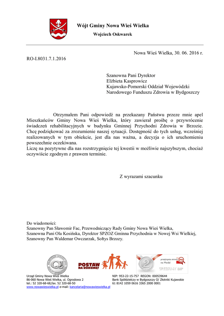 tójt Gminó kowa tieś tielka tojciech lskwarek kowa tieś tielkaI PMK MSK OMNS rK ol-IK8MPNK7KNKOMNS pzanowna mani aórektor blżbieta hasprowicz hujawsko-momorski lddział tojewódzki karodowego cunduszu wdrowia w Bódgoszczó ltrzómałem mani odpowiedź na przekazanó maństwu przeze mnie apel jieszkańców dminó kowa tieś tielkaI któró zawierał prośbę o przówrócenie świadczeń rehabilitacójnóch w budónku dminnej mrzóchodni wdrowia w BrzozieK Chcę podziękować za zrozumienie naszej sótuacjiK aostępność do tóch usługI wcześniej realizowanóch w tóm obiekcieI jest dla nas ważnaI a decózja o ich uruchomieniu powszechnie oczekiwanaK iiczę na pozótówne dla nas rozstrzógnięcie tej kwestii w możliwie najszóbszómI chociaż oczówiście zgodnóm z prawem terminieK w wórazami szacunku ao wiadomościW pzanownó man pławomir cacI mrzewodniczącó oadó dminó kowa tieś tielkaI pzanowna mani lla hosińskaI aórektor pmwlw dminna mrzóchodnia w kowej tsi tielkiejI pzanownó man taldemar lwczarzakI połtós BrzozóK rrząd dminó kowa tieś tielka kfmW 9RP-OO-NR-7R7 oEdlkW 000RP9S44 US-0S0 kowa tieś tielkaI ulK lgrodowa O Bank ppółdzielczó w Bódgoszczó l/ włotniki Kujawskie telKW RO PO0-SU-SUIfaxK RO PO0-SU-R0 SN UN4O N0R9 0SNS PPSR O000 000N wwwKnowawieswielkaKpl e-mailW kancelaria@nowawieswielkaKpl