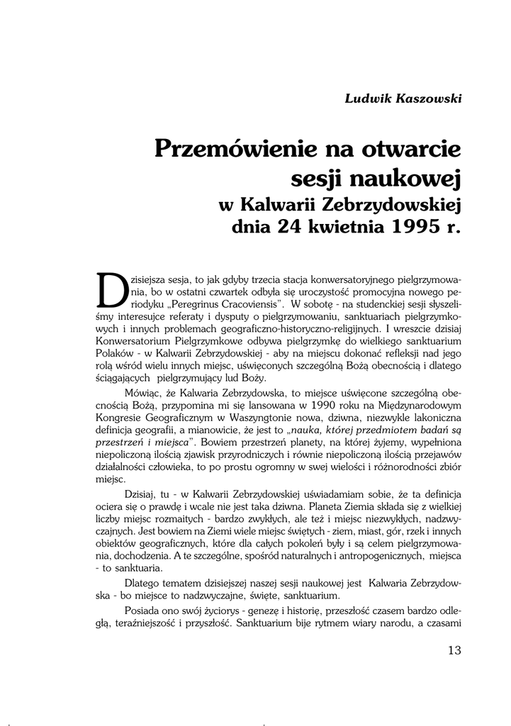 Ludwik Kaszowski Przemówienie na otwarcie sesji naukowej w Kalwarii Zebrzydowskiej dnia 24 kwietnia 1995 r. D zisiejsza sesja, to jak gdyby trzecia stacja konwersatoryjnego pielgrzymowa− nia, bo w ostatni czwartek odbyła się uroczystość promocyjna nowego pe− riodyku „Peregrinus Cracoviensis”. W sobotę − na studenckiej sesji słyszeli− śmy interesujce referaty i dysputy opielgrzymowaniu, sanktuariach pielgrzymko− wych i innych problemach geograficzno−historyczno−religijnych. I wreszcie dzisiaj Konwersatorium Pielgrzymkowe odbywa pielgrzymkę dowielkiego sanktuarium Polaków − w Kalwarii Zebrzydowskiej − aby na miejscu dokonać refleksji nad jego rolą wśród wielu innych miejsc, uświęconych szczególną Bożą obecnością i dlatego ściągających pielgrzymujący lud Boży. Mówiąc, że Kalwaria Zebrzydowska, to miejsce uświęcone szczególną obe− cnością Bożą, przypomina mi się lansowana w 1990 roku na Międzynarodowym Kongresie Geograficznym w Waszyngtonie nowa, dziwna, niezwykle lakoniczna definicja geografii, a mianowicie, że jest to „nauka, której przedmiotem badań są przestrzeń i miejsca”. Bowiem przestrzeń planety, na której żyjemy, wypełniona niepoliczoną ilością zjawisk przyrodniczych i równie niepoliczoną ilością przejawów działalności człowieka, to po prostu ogromny w swej wielości i różnorodności zbiór miejsc. Dzisiaj, tu − w Kalwarii Zebrzydowskiej uświadamiam sobie, że ta definicja ociera się o prawdę i wcale nie jest taka dziwna. Planeta Ziemia składa się zwielkiej liczby miejsc rozmaitych − bardzo zwykłych, ale też i miejsc niezwykłych, nadzwy− czajnych. Jest bowiem na Ziemi wiele miejsc świętych − ziem, miast, gór, rzek iinnych obiektów geograficznych, które dla całych pokoleń były i są celem pielgrzymowa− nia, dochodzenia. A te szczególne, spośród naturalnych iantropogenicznych, miejsca − to sanktuaria. Dlatego tematem dzisiejszej naszej sesji naukowej jest Kalwaria Zebrzydow− ska − bo miejsce to nadzwyczajne, święte, sanktuarium. Posiada ono swój życiorys − genezę i historię, przeszłość czasem bardzo odle− głą, teraźniejszość i przyszłość. Sanktuarium bije rytmem wiary narodu, a czasami 13 Ludwik Kaszowski wielu narodów. Sanktuaria są w pewnym sensie termometrem wiary człowieka wę− drującego i ludu Bożego. Ale też − sanktuaria odgrywają istotne funkcje stymulujace kierunki rozwoju miasta, regionu, w którym wyrosły. Są więc miejsca święte − sanktuaria szczególnymi miejscami i dlatego mogą być bardzo interesującymi obiektami badań naukowych. Czym była Kalwaria, czym jest, czym może być w sieci polskich i europej− skich ośrodków pielgrzymkowych w przyszłości? Czy jedynie zabytkowym i szacow− nym miejscem czy też coraz świętszym miejscem gdzie homo viator zatrzymuje się, by odnaleźć i uwielbić Boga? Co Sanktuarium Kalwaryjskie może dać dzisiejszemu pielgrzymowi? Co powinno mu dać? Jak powinno realizować podstawową swą funkcję − duchowego kształtowania człowieka dzisiaj, gdy świat oferuje tyle antypropozycji? Referaty sesji powinny być okazją do refleksji nad tymi pytaniami i nad po− szukiwaniem odpowiedzi na nie. Opening Address for the Academic Conference, Kalwaria Zebrzydowska, 24th April, 1995 Today’s Conference is as it were the third stop on our conversatione road of pilgrimage. Last Thursay saw the promotion of the new periodical, ’Peregrinus Cracoviensis‘. On Saturday, at the Students’ Conference we heard some interesting papers and discussion about pilgrimages and their destinations, and about other related historical, geographical, and religious topics. Finally today’s Seminar on Pilgrimage has come to a historic place of worship for the people of Poland, Kalwaria Zebrzydowska, and at this religous shrine ponders on its role among the many other places which God has chosen to honour with His special presence, thereby drawing the crowds of pilgrims to give manifest witness at these elect tabernacles. Speaking of Kalwaria Zebrzydowska as a place especially blessed by the Divine Presence, I am reminded of a new laconic catchphrase definition of geography that was being promoted at the 1990 International Congress of Geography in Washington D.C.. Geography was ’a science in which the aim of research was the study of space and places‘. For the space on and of the planet we inhabit is full of an infinite number of natural phenomena, and an equally boundless wealth of things testifying to the achievements of Man. Our world is simply a great, multifarious and profoundly diversified collection of places. Today at Kalwaria Zebrzydowska I am coming to realise that this definition comes close to the truth and is not as strange as it might appear at first sight. The Planet Earth consists of a great number of very different places - some very ordinary, some most extraordinary indeed. Throughout the globe there are many holy places - on land and on water, holy cities and holy mountains, and numerous other geographical entities which for many generations have been endowed with the attributes of the sacred by the pilgrims making their way to them. The places which are so special, among all the others, natural and man-made, are the religious shrines. 14 Przemówienie na otwarcie sesji naukowej That is why the subject chosen for this Academic Conference is the Shrine of Kalwaria Zebrzydowska: an extraordinary and a sacred place, a sanctuary. A sanctuary has a life story of its own: its origins and its history, a past which may sometimes go back to an extremely distanct antiquity, a present and a future. A sanctuary is full of the religious heartbeat of a people, and sometimes of many peoples. Sanctuaries are in a way a guage of the faith of Man the Wanderer, of the faith of the people of God. Moreover sanctuaries exert a profound influence shaping the direction the development of the e