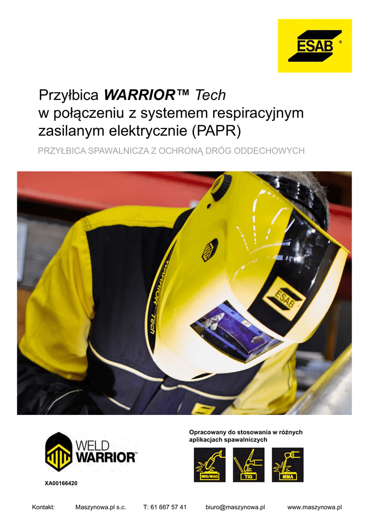 Przyłbica WARRIOR™ Tech w połączeniu z systemem respiracyjnym zasilanym elektrycznie (PAPR) PRZYŁBICA SPAWALNICZA Z OCHRONĄ DRÓG ODDECHOWYCH Opracowany do stosowania w różnych aplikacjach spawalniczych XA00166420 Kontakt: Maszynowa.pl s.c. T: 61 667 57 41 [email protected] www.maszynowa.pl Hełm WARRIOR™ Tech Przyłbica spawalnicza WARRIOR™ Tech została zaprojektowana, aby sprostać potrzebom różnych spawaczy, zapewniając nowoczesną lekką maskę chroniącą przedZdjęcie ciepłem, produktu iskrami i odpryskami. Automatyczny filtr spawalniczy zapewnia dużą jasność widzenia, a tym samy doskonałą jakość Umieszczone z lewej optyki wykorzystującej najnowszą technologię ADF. lub z prawej strony w Przyłbica WARRIOR™ Tech zapewnia doskonałą funkcjonalność, wydajność i komfort pracy zależności od kąta zarówno dla pracowników budowlanych, konserwatorów oraz spawaczy dorywczych, jak i spawaczy zawodowych. REGULACJA REGULACJA POZIOMA Od 16,5 do 23 cm 3 stopnie regulacji poziomej dla zwiększenia pola widzenia WIĘKSZA WYGODA Ułożona pod kątem przednia taśma okalająca nagłowia zmniejsza ucisk na płat czołowy głowy Masa= 520 g 5 PUNKTÓW POCHYLENIA Dostosowywanie położenia przyłbicy do 5 różnych kątów pochylenia REGULOWANY ZATRZASK Standardowo dostępny w różnych konfiguracjach dioptrii Dla lepszego dopasowania głowy i większej wygody Funkcje i korzyści dla spawacza... ZWIĘKSZONA WYDAJNOŚĆ REGULACJA CZUŁOŚCI Cztery czujniki łuku zapewniające szybszą reakcję i większy zasięg Funkcja przydatna podczas spawania przy małym natężeniu prądu (TIG) dla lepszej reakcji na łuk elektryczny Optymalna wydajność dla większości prac przy spawaniu konstrukcji, jak i spawaniu w pozycjach przymusowych i wyymagający przemieszczania spawacza WIĘKSZA WIDOCZNOŚĆ REGULACJA OPÓŹNIENIA 98 mm x 48 mm (3,85" x 1,88") Umożliwia spawaczowi ustawienie czasu, przez jaki filtr pozostanie w stanie zaciemnienia po ustaniu łuku spawalniczego Szersze pole widzenia oraz większa percepcja przestrzenna Klasa optyczna 1/2/1/2 Poziom zaciemnienia 9-13 Kontakt: Maszynowa.pl s.c. T: 61 667 57 41 Krótkie opóźnienie pomaga na szybszą pracę podczas sczepiania, a dłuższe opóźnienia przydatne są dla wyższego natężenia prądu przy spawaniu [email protected] www.maszynowa.pl Hełm WARRIOR™ Tech W połączeniu z półmaską filtrującą Przyłbica WARRIOR™ Tech została opracowana przede wszystkim z myślą o bezpieczeństwie użytkownika i chronie przed oparami spawalniczymi. Przyłbica WARRIOR™ Tech oferowana jest w połączeniu z systemem nawiewowym zasilanym elektrycznie (PAPR) firmy ESAB. Zarówno jednostka Eco Air, jak i Aristo® Air oferowane są wraz z przyłbicą WARRIOR ™ Tech zapewniając kompletny system oddechowy. Aparaty nawiewawe produkowane są z zachowaniem wysokiego poziomu bezpieczeństwa wg normy EN12941, jednocześnie zachowując komfort użytkowania. MECHANICZNY HARMONIJKOWY PRZECIWPYŁOWY WKŁAD FILTRA TH2P/3P BLOKADA PRZEWODU Materiał filtracyjny wykonany jest z mikrowłókien szklanych MECHANICZNY HARMONIJKOWY PRZECIWPYŁOWY WĘGLOWY WKŁAD FILTRA TH2P Mechanizm blokujący zapewniający większą wytrzymałość FILTR WSTĘPNY Materiał filtracyjny wykonany jest z mikrowłókien szklanych, który w połączeniu z 2 warstwami węgla aktywnego, zapewnia bardzo dużą powierzchnię pochłaniania zapachu, bez wpływu na ogólną wydajność. Do stosowania w połączeniu z węglowymi filtrami wstępnymi. FILTR WSTĘPNY Dłuższa żywotność filtra głównego Regularna wymiana filtrów wstępnych przedłuży żywotność filtra głównego. ESAB zaleca wymianę filtra wstępnego raz na zmianę roboczą (8 godzin). W miejscach o dużym zapyleniu filtr wstępny należy wymieniać częściej (2-3 razy) na zmianę. SOLIDNE DRZWICZKI FILTR GŁÓWNY I FILTR WĘGLOWY FILTR WSTĘPNY I FILTR WSTĘPNY WĘGLOWY Jednostki nawiewawe PAPR firmy ESAB Eco Air Szer. 160 x Wys. 160 x Grub. 87 mm 1000 g Inteligentna ładowarka Niklowo-wodorkowy 485 g 8 godz. przy 170 l/min Min. przepływ powietrza 170 l/min Nie Nie Tak Nie Tak Nie Nie Tak Tak Kontakt: Maszynowa.pl s.c. Aristo® Air Szer. 195 x Wys. 160 x Grub. 93 mm Wymiary półmaski PAPR 935 g Ciężar jednostki (akumulator + filtr) Inteligentna ładowarka Ładowarka akumulatora Litowo-jonowy Akumulator 327 g Ciężar akumulatora 8 godz. przy 210 l/min 11/12 przy 175 l/min Czas pracy akumulatora 170/210 l/min - zmienna regulacja Przepływ powietrza Tak Regulowany przepływ powietrza Tak Diodowy wskaźnik przepływu powietrza Tak Alarm ostrzegawczy akumulatora (dźwiękowy) Tak Alarm ostrzegawczy akumulatora (wizualny) Tak Alarm ostrzegawczy filtra (dźwiękowy) Tak Alarm ostrzegawczy filtra (wizualny) Tak Wskaźnik diodowy akumulatora Tak Filtr główny (przeciwpyłowy) Filtr główny (przeciwpyłowy/przeciwzapachowy) Tak T: 61 667 57 41 [email protected] www.maszynowa.pl Informacje na temat zamawiania WARRIOR™ Tech WARRIOR™ Tech Przyłbica WARRIOR™ Tech 9-13 posiada zewnętrzną regulację zaciemnienia pomiędzy DIN 9 a DIN 13. Opóźnienie i czułość można regulować od wewnątrz. Dostępne w tradycyjnych kolorach żółtym i czarnym WARRIOR™ Tech Czarny WARRIOR™ Tech Żółty 0700 000 400 0700 000 401 WARRIOR™ Tech przygotowany do pracy nawiewem Przyłbica WARRIOR™ Tech przygotowana do pracy z nawiewem dostarczana jako kompletna jednostka gotowa do połączenia z aparatem nawiewowym firmy ESAB. Jednostka zawiera: przyłbicę spawalniczą WARRIOR™Tech ,nagłowie, przewód powietrza oraz uszczelnienia twarzy i głowy. Przyłbica WARRIOR™ Tech w kolorze czarnym przygotowana do pracy z nawiewem 0700 000 405 Przyłbica WARRIOR™ Tech w kolorze żółtym przygotowana do pracy z nawiewem 0700 000 406 Aristo® Air Urządzenie nawiewowo-filtrujące Aristo® Air PAPR dostarczane jest jako kompletne, gotowe do użycia urządzenie. Urządzenie zawiera: jednostkę nawiewo