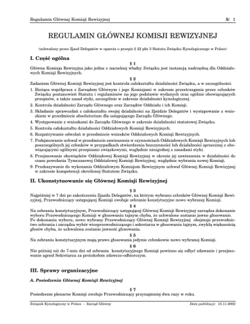 Regulamin Głównej Komisji Rewizyjnej 5/ 1 REGULAMIN GŁÓWNEJ KOMISJI REWIZYJNEJ (uchwalony przez Zjazd Delegatów w oparciu o przepis § 22 pkt 3 Statutu Związku Kynologicznego w Polsce) I. Część ogólna §1 Główna Komisja Rewizyjna jako jedna z naczelnej władzy Związku jest instancją nadrzędną dla Oddziałowych Komisji Rewizyjnych. §2 Zadaniem Głównej Komisji Rewizyjnej jest kontrola całokształtu działalności Związku, a w szczególności: 1. Bieżąca współpraca z Zarządem Głównym i jego Komisjami w zakresie przestrzegania przez członków Związku postanowień Statutu i regulaminów na jego podstawie wydanych oraz ogólnie obowiązujących przepisów, a także zasad etyki, szczególnie w zakresie działalności kynologicznej. 2. Kontrola działalności Zarządu Głównego oraz Zarządów Oddziału i ich Komisji. 3. Składanie sprawozdań z całokształtu swojej działalności na Zjeździe Delegatów i występowanie z wnioskiem w przedmiocie absolutorium dla ustępującego Zarządu Głównego. 4. Występowanie z wnioskami do Zarządu Głównego w zakresie działalności statutowej Związku. 5. Kontrola całokształtu działalności Oddziałowych Komisji Rewizyjnych. 6. Rozpatrywanie odwołań w przedmiocie wniosków Oddziałowych Komisji Rewizyjnych. 7. Podejmowanie uchwał w przedmiocie zawieszenia w czynnościach Oddziałowych Komisji Rewizyjnych lub poszczególnych jej członków w przypadkach stwierdzenia bezczynności lub działalności sprzecznej z obowiązującymi ogólnymi przepisami związkowymi, względnie niezgodnej z zasadami etyki. 8. Przejmowanie obowiązków Oddziałowej Komisji Rewizyjnej w okresie jej zawieszenia w działalności do czasu powołania Tymczasowej Oddziałowej Komisji Rewizyjnej, względnie wybrania nowej Komisji. 9. Przekazywanie do wykonania Oddziałowym Komisjom Rewizyjnym uchwał Głównej Komisji Rewizyjnej w zakresie kompetencji określonej Statutem Związku. II. Ukonstytuowanie się Głównej Komisji Rewizyjnej §3 Najpóźniej w 7 dni po zakończeniu Zjazdu Delegatów, na którym wybrano członków Głównej Komisji Rewizyjnej, Przewodniczący ustępującej Komisji zwołuje zebranie konstytucyjne nowo wybranej Komisji. §4 Na zebraniu konstytucyjnym, Przewodniczący ustępującej Głównej Komisji Rewizyjnej zarządza dokonanie wyboru Przewodniczącego Komisji w głosowaniu tajnym chyba, że uchwalone zostanie jawne głosowanie. Po dokonaniu wyboru, nowo wybrany Przewodniczący Głównej Komisji Rewizyjnej obejmuje przewodnictwo zebrania i zarządza wybór wiceprzewodniczącego i sekretarza w głosowaniu tajnym, zwykłą większością głosów chyba, że uchwalona zostanie jawność głosowania. §5 Na zebraniu konstytucyjnym mają prawo głosowania jedynie członkowie nowo wybranej Komisji. §6 Nie później niż do 7-miu dni od zebrania konstytucyjnego Komisji powinno się odbyć zdawanie i przejmowanie agend Sekretarza za protokołem zdawczo-odbiorczym. III. Sprawy organizacyjne A. Posiedzenia Głównej Komisji Rewizyjnej §7 Posiedzenie plenarne Komisji zwołuje Przewodniczący przynajmniej dwa razy w roku. Związek Kynologiczny w Polsce - Zarząd Główny Data publikacji: 15.11.2002 5/ 2 Regulamin Głównej Komisji Rewizyjnej §8 Do zakresu działania plenarnego posiedzenia Komisji należy: 1. zatwierdzanie planów pracy Komisji, 2. zatwierdzanie sprawozdań z działalności Komisji, 3. podejmowanie uchwał w sprawach zawieszenia w działaniu Oddziałowych Komisji Rewizyjnych lub ich członków, 4. wnioskowanie w zakresie przeprowadzania dochodzeń przez Rzeczników, 5. rozpatrywanie wyników kontroli działalności Zarządu Głównego, Zarządów Oddziałów i Oddziałowych Komisji Rewizyjnych przeprowadzonych przez poszczególnych członków Głównej Komisji Rewizyjnej i podejmowanie decyzji względnie uchwał do przekazania sprawy organom kompetentnym. §9 1. Uchwały Komisji zapadają zwykłą większością głosów przy obecności co najmniej trzech członków Komisji, w tym Przewodniczącego lub jego zastępcy. W razie równości głosów rozstrzyga głos Przewodniczącego. 2. Członek Komisji ma prawo zgłoszenia sprzeciwu do protokołu przeciw podjętej uchwale. § 10 Posiedzenia Komisji są protokołowane i kolejno numerowane w danej kadencji. Protokoły winny zawierać dokładnie sprecyzowane wnioski i uchwały z podaniem wyniku głosowania nad każdym wnioskiem. Każdy protokół po jego przyjęciu powinien być podpisany przez Przewodniczącego i Sekretarza Komisji względnie przez członka Komisji protokołującego dane posiedzenie. Ewentualne poprawki do protokołu należy wprowadzać do protokołu następnego. B. Podział funkcji i zakres kompetencji członków Głównej Komisji Rewizyjnej § 11 1. Przewodniczący Komisji reprezentuje Komisję na zewnątrz oraz kieruje pracami wchodzącymi w zakres jej działania. 2. Do czynności Przewodniczącego Komisji należy w szczególności: a) zwoływanie oraz przewodniczenie na zebraniach Komisji, b) kierowanie pracami Komisji w oparciu o ustalony plan pracy, c) nadzorowanie wykonywania przez Oddziałowe Komisje Rewizyjne ich zadań określonych statutem i regulaminami na jego podstawie wydanymi, a także uchwał Głównej Komisji Rewizyjnej, d) występowanie do Plenum oraz Prezydium Zarządu Głównego z wnioskami w sprawach wynikających z zakresu kompetencji Komisji, a dotyczących działalności Zarządu Głównego i Komisji przy nim działających oraz działalności Zarządów Oddziałów, e) podpisywanie wszelkiej korespondencji imieniem Komisji, f) opracowywanie, łącznie z sekretarzem Komisji, sprawozdań z działalności Komisji, g) przyjmowanie skarg i wniosków w sprawach leżących w kompetencji Komisji, h) branie udziału w posiedzeniach Plenum Zarządu Głównego. § 12 Zastępca Przewodniczącego Komisji zastępuje Przewodniczącego Komisji we wszystkich sprawach i czynnościach w czasie jego nieobecności. Pomiędzy Przewodniczącym, a je