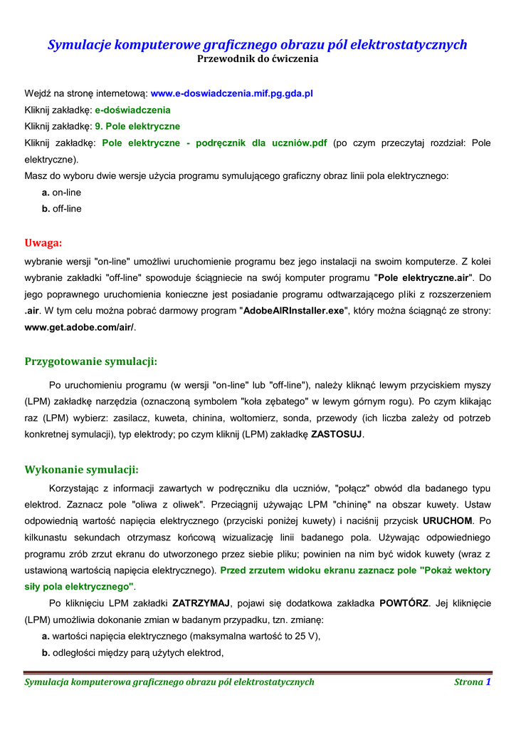 wybranie zakładki "off-line" spowoduje ściągniecie na swój komputer programu "Pole elektryczne.air". Do