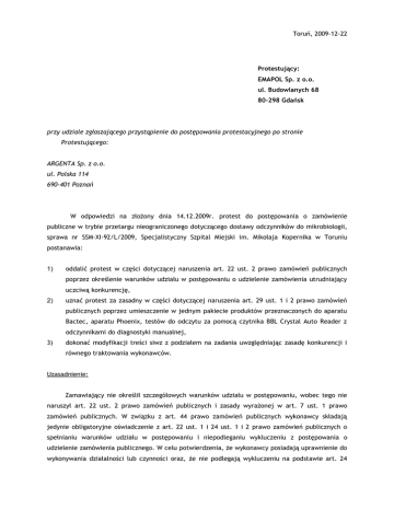 Toruń, 2009-12-22 Protestujący: EMAPOL Sp. z o.o. ul. Budowlanych 68 80-298 Gdańsk przy udziale zgłaszającego przystąpienie do postępowania protestacyjnego po stronie Protestującego: ARGENTA Sp. z o.o. ul. Polska 114 690-401 Poznań W odpowiedzi na złożony dnia 14.12.2009r. protest do postępowania o zamówienie publiczne w trybie przetargu nieograniczonego dotyczącego dostawy odczynników do mikrobiologii, sprawa nr SSM-XI-92/L/2009, Specjalistyczny Szpital Miejski im. Mikołaja Kopernika w Toruniu postanawia: 1) oddalić protest w części dotyczącej naruszenia art. 22 ust. 2 prawo zamówień publicznych poprzez określenie warunków udziału w postępowaniu o udzielenie zamówienia utrudniający uczciwą konkurencję, 2) uznać protest za zasadny w części dotyczącej naruszenia art. 29 ust. 1 i 2 prawo zamówień publicznych poprzez umieszczenie w jednym pakiecie produktów przeznaczonych do aparatu Bactec, aparatu Phoenix, testów do odczytu za pomocą czytnika BBL Crystal Auto Reader z odczynnikami do diagnostyki manualnej, 3) dokonać modyfikacji treści siwz z podziałem na zadania uwzględniając zasadę konkurencji i równego traktowania wykonawców. Uzasadnienie: Zamawiający nie określił szczegółowych warunków udziału w postępowaniu, wobec tego nie naruszył art. 22 ust. 2 prawo zamówień publicznych i zasady wyrażonej w art. 7 ust. 1 prawo zamówień publicznych. W związku z art. 44 prawo zamówień publicznych wykonawcy składają jedynie obligatoryjne oświadczenie z art. 22 ust. 1 i 24 ust. 1 i 2 prawo zamówień publicznych o spełnianiu warunków udziału w postępowaniu i niepodleganiu wykluczeniu z postępowania o udzielenie zamówienia publicznego. W celu potwierdzenia, że wykonawcy posiadają uprawnienie do wykonywania działalności lub czynności oraz, że nie podlegają wykluczeniu na podstawie art. 24 ustawy prawo zamówień publicznych zamawiający żąda załączenia do oferty następujących dokumentów: a) aktualnego odpisu z właściwego rejestru albo aktualnego zaświadczenia o wpisie do ewidencji działalności gospodarczej, jeżeli odrębne przepisy wymagają wpisu do rejestru lub zgłoszenia do ewidencji działalności gospodarczej, wystawionego nie wcześniej niż 6 miesięcy przed upływem terminu składania ofert, b) aktualnego zaświadczenia właściwego naczelnika urzędu skarbowego oraz właściwego oddziału Zakładu Ubezpieczeń Społecznych lub Kasy Rolniczego Ubezpieczenia Społecznego potwierdzających odpowiednio, że wykonawca nie zalega z opłacaniem podatków, opłat oraz składek na ubezpieczenie zdrowotne i społeczne, lub zaświadczeń, że uzyskał przewidziane prawem zwolnienie, odroczenie lub rozłożenie na raty zaległych płatności lub wstrzymanie w całości wykonania decyzji właściwego organu - wystawionych nie wcześniej niż 3 miesiące przed upływem terminu składania ofert, c) aktualnej informacji z Krajowego Rejestru Karnego w zakresie określonym w art. 24 ust. 1 pkt 4-8 ustawy prawo zamówień publicznych, wystawiona nie wcześniej niż 6 miesięcy przed upływem terminu składnia ofert, d) aktualnej informacji z Krajowego Rejestru Karnego w zakresie określonym w art. 24 ust. 1 pkt 9 ustawy prawo zamówień publicznych wystawiona nie wcześniej niż 6 miesięcy przed upływem terminu składnia ofert. Dokumenty powyższe są jak najbardziej zgodne z par. 1, ust 1 Rozporządzania Prezesa Rady Ministrów w sprawie rodzajów dokumentów, jakich może żądać zamawiający od wykonawcy, oraz form, w jakich te dokumenty mogą być składane i mogą być wymagane bez ograniczenia przez zamawiającego celem potwierdzenia posiadania uprawnienia do wykonywania działalności i niepodlegania wykluczeniu z postępowania o udzielenie zamówienia publicznego. Wobec tego żądanie powyższych oświadczeń i dokumentów jest jak najbardziej właściwe w związku z tym zamawiający nie naruszył art. 22 ust. 2 i art. 7 ust. 1 prawo zamówień publicznych. Zarzuty wykonawcy powinny zatem zostać skonkretyzowane i odnosić się do wadliwego określenia warunków udziału w niniejszym postępowaniu. Stwierdzamy, że zamawiający w ogóle nie naruszył art. 22 ust. 2 prawo zamówień publicznych, wykonawca w tym zakresie w ogóle nie dowiódł naruszenia tegoż artykułu. Informujemy, że od niniejszego protestu nie przysługuje odwołanie, bowiem na podstawie art. 182 ust. 2 pkt 1 i art. 184 ust. 1a prawo zamówień publicznych protest ten jest ostatecznie rozstrzygnięty. Dnia 22 grudnia rozstrzygnięcie protestu zamieszczono na stronie www.med.torun.pl