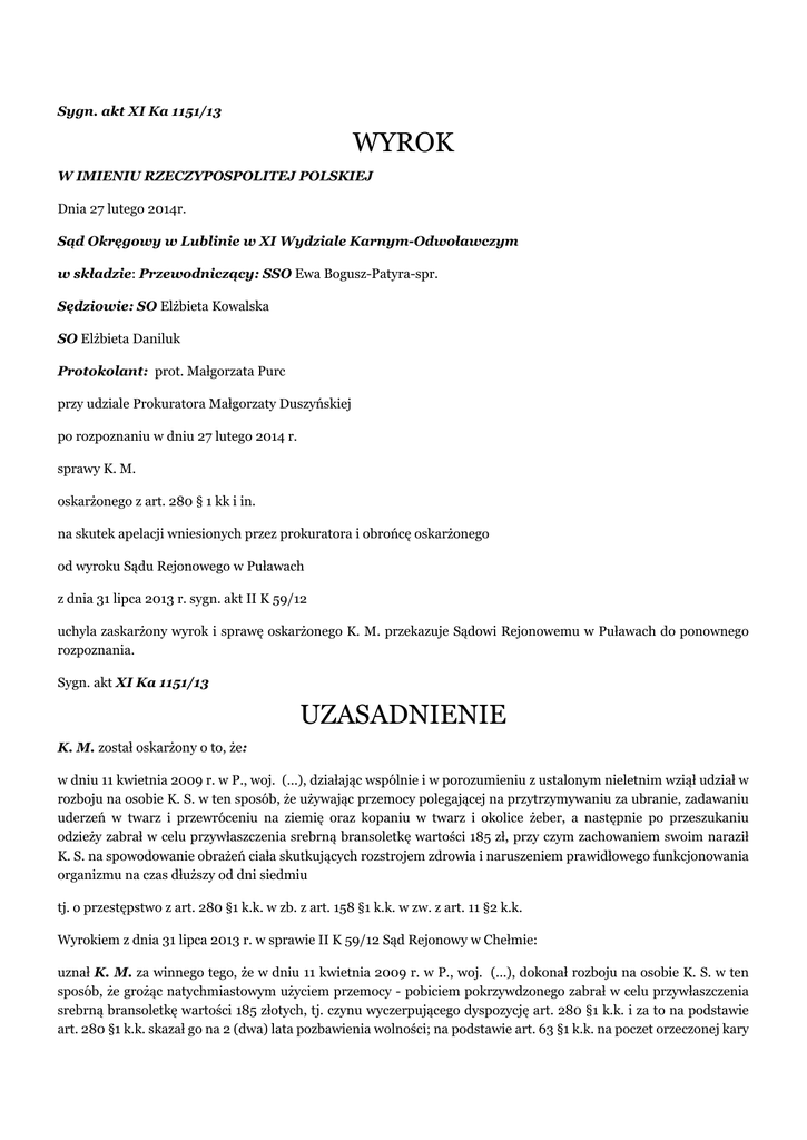 Sygn. akt XI Ka 1151/13 WYROK W IMIENIU RZECZYPOSPOLITEJ POLSKIEJ Dnia 27 lutego 2014r. Sąd Okręgowy w Lublinie w XI Wydziale Karnym-Odwoławczym w składzie: Przewodniczący: SSO Ewa Bogusz-Patyra-spr. Sędziowie: SO Elżbieta Kowalska SO Elżbieta Daniluk Protokolant: prot. Małgorzata Purc przy udziale Prokuratora Małgorzaty Duszyńskiej po rozpoznaniu w dniu 27 lutego 2014 r. sprawy K. M. oskarżonego z art. 280 § 1 kk i in. na skutek apelacji wniesionych przez prokuratora i obrońcę oskarżonego od wyroku Sądu Rejonowego w Puławach z dnia 31 lipca 2013 r. sygn. akt II K 59/12 uchyla zaskarżony wyrok i sprawę oskarżonego K. M. przekazuje Sądowi Rejonowemu w Puławach do ponownego rozpoznania. Sygn. akt XI Ka 1151/13 UZASADNIENIE K. M. został oskarżony o to, że: w dniu 11 kwietnia 2009 r. w P., woj. (...), działając wspólnie i w porozumieniu z ustalonym nieletnim wziął udział w rozboju na osobie K. S. w ten sposób, że używając przemocy polegającej na przytrzymywaniu za ubranie, zadawaniu uderzeń w twarz i przewróceniu na ziemię oraz kopaniu w twarz i okolice żeber, a następnie po przeszukaniu odzieży zabrał w celu przywłaszczenia srebrną bransoletkę wartości 185 zł, przy czym zachowaniem swoim naraził K. S. na spowodowanie obrażeń ciała skutkujących rozstrojem zdrowia i naruszeniem prawidłowego funkcjonowania organizmu na czas dłuższy od dni siedmiu tj. o przestępstwo z art. 280 §1 k.k. w zb. z art. 158 §1 k.k. w zw. z art. 11 §2 k.k. Wyrokiem z dnia 31 lipca 2013 r. w sprawie II K 59/12 Sąd Rejonowy w Chełmie: uznał K. M. za winnego tego, że w dniu 11 kwietnia 2009 r. w P., woj. (...), dokonał rozboju na osobie K. S. w ten sposób, że grożąc natychmiastowym użyciem przemocy - pobiciem pokrzywdzonego zabrał w celu przywłaszczenia srebrną bransoletkę wartości 185 złotych, tj. czynu wyczerpującego dyspozycję art. 280 §1 k.k. i za to na podstawie art. 280 §1 k.k. skazał go na 2 (dwa) lata pozbawienia wolności; na podstawie art. 63 §1 k.k. na poczet orzeczonej kary pozbawienia wolności zaliczył oskarżonemu okres zatrzymania i tymczasowego aresztowania w sprawie od dnia 15 kwietnia 2009 roku do dnia 15 września 2009 roku ; zasądził od Skarbu Państwa na rzecz Kancelarii Adwokackiej w P. adw. R. B. kwotę 1446,48 złotych tytułem obrony z urzędu; na podstawie art. 624 §1 k.p.k. zwolnił oskarżonego od zapłaty na rzecz Skarbu Państwa kosztów sądowych. Apelację od powyższego wyroku złożyli prokurator i obrońca oskarżonego. Prokurator na podstawie art.425 § 1 i 2 kpk i art. 444 kpk zaskarżył wyrok w całości na niekorzyść oskarżonego. Powołując przepis art. 427 kpk oraz art. 438 pkt 3 kpk wyrokowi temu zarzucił: - błąd w ustaleniach faktycznych przyjętych za podstawę wyroku, polegający na błędnym ustaleniu, że pobicie K. S. przez K. M. i nieletniego M. J., będące elementem rozboju na osobie pokrzywdzonego, stanowi odrębne przestępstwo, ze względu na błędnie ustalony odstęp czasowy między pobiciem a zaborem mienia, podczas gdy prawidłowa analiza zebranego w sprawie materiału dowodowego wskazuje, że pobicie pokrzywdzonego we wstępnej fazie zdarzenia należy do znamion rozboju, a mianowicie stanowi użycie przemocy w celu kradzieży mienia. Powołując się na powyższy zarzut wniósł o uchylenie zaskarżonego wyroku i przekazanie sprawy do ponownego rozpoznania Sądowi I instancji. Natomiast obrońca oskarżonego zaskarżając wyrok w całości na zasadzie art. 444kpk w zw. z art. 425 § 1 i § 2 kpk zarzucił: - błąd w ustaleniach faktycznych mający istotny wpływ na treść zaskarżonego orzeczenia polegający na przyjęciu, iż oskarżony działał z zamiarem przywłaszczenia bransoletki należącej do pokrzywdzonego, podczas gdy prawidłowa analiza materiału dowodowego w sprawie wskazuje, iż między oskarżonym a pokrzywdzonym doszło do zamiany - ewentualnie w przypadku nieuwzględnienia powyższego zarzutu na podstawie art. 438 pkt 4 kpk rażącą niewspółmierność kary poprzez wymierzenie oskarżonemu bezwzględnej kary pozbawienia wolności w wymiarze 2 lat, w sytuacji gdy na podstawie ujawnionych okoliczności sprawy uznać należy, iż karą wystarczającą powinna być kara pozbawienia wolności z warunkowym zawieszeniem jej wykonania. W konkluzji wniósł o uniewinnienie oskarżonego od zarzucanego mu czynu, ewentualnie o zmianę zaskarżonego wyroku w części dotyczącej kary i wymierzenie oskarżonemu kary pozbawienia wolności z warunkowym zawieszeniem jej wykonania. Sąd Okręgowy zważył, co następuje: Na uwzględnienie zasługuje wniosek sformułowany w apelacji prokuratora, a mianowicie o uchylenie zaskarżonego wyroku i przekazanie sprawy do ponownego rozpoznania Sądowi I instancji, choć jego słuszność nie do końca wynika z trafności sformułowanego w tymże środku odwoławczym zarzutu. Rację też przyznać należy obrońcy oskarżonego, o ile wskazuje na niedostateczną analizę materiału dowodowego pod kątem dokonania prawidłowych ustaleń odnośnie istnienia po stronie K. M. zamiaru przywłaszczenia bransoletki należącej do pokrzywdzonego. Natomiast Sąd Okręgowy zrezygnował z odnoszenia się do drugiego z alternatywnie sformułowanych w tymże środku odwoławczym zarzutów z uwagi na to, że jego rozpoznanie, z uwagi na uchylenie wyroku z powodu jego wadliwości w przedmiocie winy, byłoby przedwczesne ( art. 436 kpk). Odnosząc się do apelacji prokuratora stwierdzić należy, że nie ma on racji o ile usiłuje wykazać, iż prawidłowa analiza zebranego w sprawie materiału dowodowego wskazuje, że pobicie pokrzywdzonego we wstępnej fazie zdarzenia należy do znamion rozboju. Nawet bowiem przytoczone w tejże apelacji zeznania pokrzywdzonego i jego brata, a zatem osób najbardziej zainteresowanych wydaniem niekorzystnego dla oskarżonego orzeczenia wskazują na to, że pomiędzy pobiciem pokrzywdzonego, a wyegzekwowaniem