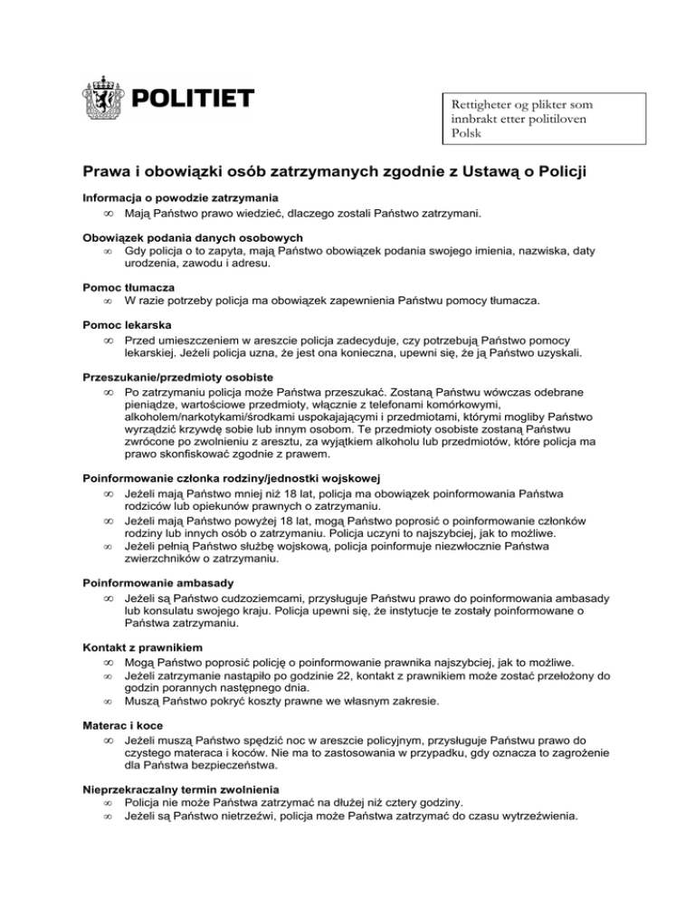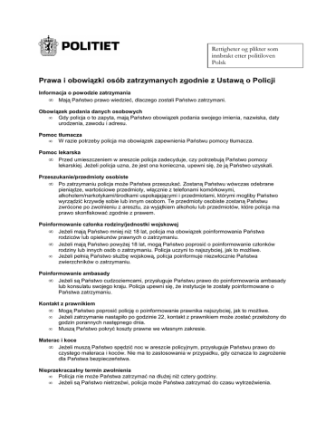 Rettigheter og plikter som innbrakt etter politiloven Polsk Prawa i obowiązki osób zatrzymanych zgodnie z Ustawą o Policji Informacja o powodzie zatrzymania • Mają Państwo prawo wiedzieć, dlaczego zostali Państwo zatrzymani. Obowiązek podania danych osobowych • Gdy policja o to zapyta, mają Państwo obowiązek podania swojego imienia, nazwiska, daty urodzenia, zawodu i adresu. Pomoc tłumacza • W razie potrzeby policja ma obowiązek zapewnienia Państwu pomocy tłumacza. Pomoc lekarska • Przed umieszczeniem w areszcie policja zadecyduje, czy potrzebują Państwo pomocy lekarskiej. Jeżeli policja uzna, że jest ona konieczna, upewni się, że ją Państwo uzyskali. Przeszukanie/przedmioty osobiste • Po zatrzymaniu policja może Państwa przeszukać. Zostaną Państwu wówczas odebrane pieniądze, wartościowe przedmioty, włącznie z telefonami komórkowymi, alkoholem/narkotykami/środkami uspokajającymi i przedmiotami, którymi mogliby Państwo wyrządzić krzywdę sobie lub innym osobom. Te przedmioty osobiste zostaną Państwu zwrócone po zwolnieniu z aresztu, za wyjątkiem alkoholu lub przedmiotów, które policja ma prawo skonfiskować zgodnie z prawem. Poinformowanie członka rodziny/jednostki wojskowej • Jeżeli mają Państwo mniej niż 18 lat, policja ma obowiązek poinformowania Państwa rodziców lub opiekunów prawnych o zatrzymaniu. • Jeżeli mają Państwo powyżej 18 lat, mogą Państwo poprosić o poinformowanie członków rodziny lub innych osób o zatrzymaniu. Policja uczyni to najszybciej, jak to możliwe. • Jeżeli pełnią Państwo służbę wojskową, policja poinformuje niezwłocznie Państwa zwierzchników o zatrzymaniu. Poinformowanie ambasady • Jeżeli są Państwo cudzoziemcami, przysługuje Państwu prawo do poinformowania ambasady lub konsulatu swojego kraju. Policja upewni się, że instytucje te zostały poinformowane o Państwa zatrzymaniu. Kontakt z prawnikiem • Mogą Państwo poprosić policję o poinformowanie prawnika najszybciej, jak to możliwe. • Jeżeli zatrzymanie nastąpiło po godzinie 22, kontakt z prawnikiem może zostać przełożony do godzin porannych następnego dnia. • Muszą Państwo pokryć koszty prawne we własnym zakresie. Materac i koce • Jeżeli muszą Państwo spędzić noc w areszcie policyjnym, przysługuje Państwu prawo do czystego materaca i koców. Nie ma to zastosowania w przypadku, gdy oznacza to zagrożenie dla Państwa bezpieczeństwa. Nieprzekraczalny termin zwolnienia • Policja nie może Państwa zatrzymać na dłużej niż cztery godziny. • Jeżeli są Państwo nietrzeźwi, policja może Państwa zatrzymać do czasu wytrzeźwienia. • W przypadku dłuższego zatrzymania przez policję konieczna jest stosowna decyzja odpowiednich władz. Zostaną Państwo o tym poinformowani. Składanie skarg na policję • Jeżeli sądzą Państwo, że podczas zatrzymania policja postąpiła niewłaściwie, po zwolnieniu mają Państwo prawo złożyć skargę do naczelnika policji. Składanie doniesienia na policję • Jeżeli sądzą Państwo, że jakakolwiek osoba pracująca w policji popełniła przestępstwo kryminalne, mogą Państwo złożyć doniesienie w tej sprawie do Norweskiego Biura Śledczego ds. Policji (Norwegian Bureau for the Investigation of Police Affairs) pod adresem: P O Box 93, 2301 Hamar lub na miejscowym posterunku policji.