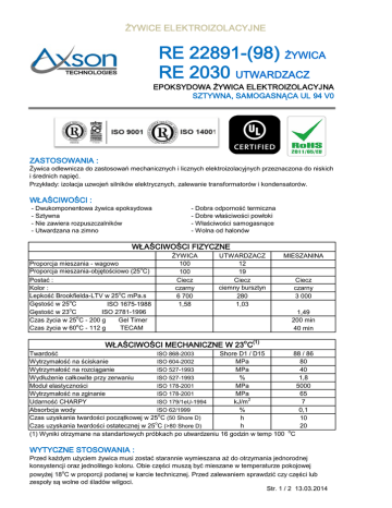 ŻYWICE ELEKTROIZOLACYJNE RE 22891-(98) ŻYWICA RE 2030 UTWARDZACZ EPOKSYDOWA ŻYWICA ELEKTROIZOLACYJNA SZTYWNA, SAMOGASNĄCA UL 94 V0 ZASTOSOWANIA : Żywica odlewnicza do zastosowań mechanicznych i licznych elektroizolacyjnych przeznaczona do niskich i średnich napięć. Przykłady: izolacja uzwojeń silników elektrycznych, zalewanie transformatorów i kondensatorów. WŁAŚCIWOŚCI : - Dwukomponentowa żywica epoksydowa - Sztywna - Nie zawiera rozpuszczalników - Utwardzana na zimno - Dobra odporność termiczna - Dobre właściwości powłoki - Właściwości samogasnące - Wolna od halonów WŁAŚCIWOŚCI FIZYCZNE Proporcja mieszania - wagowo Proporcja mieszania-objętościowo (25oC) Postać : Kolor : Lepkość Brookfielda-LTV w 25oC mPa.s Gęstość w 25oC ISO 1675-1988 o Gęstość w 23 C ISO 2781-1996 Czas życia w 25oC - 200 g Gel Timer Czas życia w 60oC - 112 g TECAM ŻYWICA 100 100 Ciecz czarny 6 700 1,58 UTWARDZACZ 12 19 Ciecz ciemny bursztyn 280 1,03 MIESZANINA Ciecz czarny 3 000 1,49 200 min 40 min WŁAŚCIWOŚCI MECHANICZNE W 23o C(1) Twardość ISO 868-2003 Shore D1 / D15 88 / 86 Wytrzymałość na ściskanie ISO 604-2002 MPa 80 Wytrzymałość na rozciąganie ISO 527-1993 MPa 40 Wydłużenie całkowite przy zerwaniu ISO 527-1993 % 1,8 Moduł elastyczności ISO 178-2001 MPa 5000 Wytrzymałość na zginanie ISO 178-2001 MPa 65 Udarność CHARPY ISO 179/1eU-1994 kJ/m2 7 Absorbcja wody ISO 62/1999 % 0,1 Czas uzyskania twardości początkowej w 25oC (50 Shore D) h 10 Czas uzyskania twardości ostatecznej w 25oC (>80 Shore D) h 20 (1) Wyniki otrzymane na standartowych próbkach po utwardzeniu 16 godzin w temp 100 oC WYTYCZNE STOSOWANIA : Przed każdym użyciem żywica musi zostać starannie wymieszana aż do otrzymania jednorodnej konsystencji oraz jednolitego koloru. Obie części muszą być mieszane w temperaturze pokojowej powyżej 18oC w proporcji podanej w karcie technicznej. Przed zalewaniem sprawdzić czy części lub zespoły są wolne od śladów wilgoci. Str. 1 / 2 13.03.2014 ŻYWICE ELEKTROIZOLACYJNE RE 22891-(98) ŻYWICA RE 2030 UTWARDZACZ EPOKSYDOWA ŻYWICA DIELEKTRYCZNA TWARDA SAMOGASNĄCA UL 94 V0 WŁAŚCIWOŚCI CIEPLNE ( 1 ) Temperatura użytkowania Przewodność cieplna Temperatura zeszklenia o ISO 2582-1978 ISO 11359-2002 Współczynnik rozszerzalności cieplnej [ +20, +50 ]oC [ + 90, + 130 ]oC Palność ( grubość 6 mm ) C W/mK o C -40 ; 150 0,5 65 10-6K-1 60 130 V0 0,1 Spełniona ISO 11359-1999 UL 94-1979 o Absorbcja wody ( 24 h. w 23 C ) ISO 62-1999 Dyrektywa 2002/95/CE ( ROHS ) z późniejszymi zmianami E 113398 % WŁAŚCIWOŚCI DIELEKTRYCZNE I IZOLACYJNE W 23 o C ( 1 ) Wytrzymałość dielektryczna (50Hz-1mm) CEI 60243-1 E2 : 1998 kV / mm Stała dielektryczna ε (100Hz) CEI 60250 : 1969 Współczynnik strat tan δ (100Hz) CEI 60250 : 1969 Rezystywność skrośna ( 1000 V ) CEI 60093 E2 : 1980 Ω.cm ( 1 ) Wartości otrzymano na standardowych próbkach / utwardzanie: 16 h w 100oC 27 4 0,04 5 x 1015 BEZPIECZEŃSTWO I HIGIENA PRACY : Zwykłe środki bezpieczeństwa powinny być zachowane podczas pracy z tym produktem : - zapewnić dobrą wentylację - nosić rękawice i okulary ochronne - nosić ubranie ochronne ( wodoodporne ) Szczegółowe informacje zawarte są w kartach charakterystyki zywicy i utwardzacza. PRZECHOWYWANIE : Okres składowania wynosi 6 miesięcy dla żywicy i 12 miesięcy dla utwardzacza w oryginalnych nie otwieranych pojemnikach w temperaturze pomiędzy 15 i 25 oC. Po otwarciu pojemnik należy szczelnie zamknąć pod osłoną gazu obojętnego ( suche powietrze, azot itp.. ). OPAKOWANIA : Żywica 1 x 10kg Utwardzacz 1 x 1,2kg GWARANCJA : Wszystkie informacje zawarte powyżej są rezultatem badań i testów przeprowadzonych w naszym laboratorium w ściśle określonych warunkach. Użytkownik ponosi pełną odpowiedzialność za określenie przydatności ( w swoich warunkach ) produktu AXSON ( przed dokonaniem zakupu ) do proponowanego zastosowania. AXSON gwarantuje zgodność swojego produktu z jego specyfikacją lecz nie może zagwarantować jego kompatybilności z jakimkolwiek szczególnym zastosowaniem.AXSON odrzuca jakąkolwiek odpowiedzialność za zniszczenia lub wypadki, które spowodowane zostały użyciem jego produktów. Odpowiedzialność AXSON jest ściśle ograniczona do zwrotu pieniędzy lub wymiany produktu niezgodnego z jego specyfikacją. AMOD - Andrzej Modrzewski 01-793 Warszawa ul. Rydygiera 8 tel. / fax. ( 22 ) 633-85-06 tel. ( 22 ) 669-39-76 tel. komórkowy ( 602 ) 26-11-15 INTERNET: www.amod.pl i www.amod.com.pl e-mail:[email protected] Przedstawiciel w Polsce : Str. 2 / 2 13.03.2014