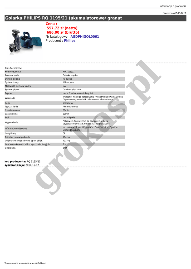Informacje o produkcie Utworzono 07-03-2017 Golarka PHILIPS RQ 1195/21 (akumulatorowe/ granat Cena : 557,72 zł (netto) 686,00 zł (brutto) Nr katalogowy : AGDPHIGOL0061 Producent : Philips Opis Techniczny: RQ 1195/21 Przeznaczenie Golarka męska System golenia Na sucho System tnący Wibracyjny Możliwość mycia w wodzie tak System głowic DualPrecision mm Trymer tak. z 5 ustawieniami długości Wskaźniki Wskaźnik niskiego naładowania ,Wskaźnik ładowania w toku ,5-poziomowy wskaźnik naładowania akumulatora Kolor granatowy Typ zasilania Akumulatorowe Czas ładowania 60min Czas golenia 50min Etui tak, miękkie Wyposażenie Pokrowiec ,Szczoteczka do czyszczenia ,Baza czyszcząco-ładująca ,Nasadka zabezpieczająca Informacje dodatkowe technologie: Super Lift and Cut, DualPrecision, GyroFlex, SkinGlide, Aquatec Certyfikaty CE as ok Orientacyjna waga brutto 1841 g Orientacyjna waga brutto opak. zbior. 4017 g Ilość w opakowaniu zbiorczym - orientacyjnie 2 szt. Gwarancja 24M gr kod producenta: RQ 1195/21 synchronizacja: 2014-12-12 Wygenerowano w programie www.oscGold.com .p l Kod Producenta
