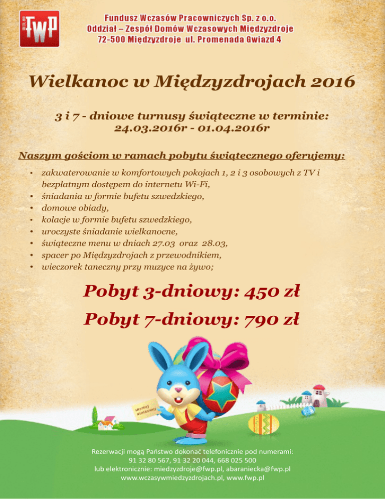 Wielkanoc w Międzyzdrojach 2016 3 i 7 - dniowe turnusy świąteczne w terminie: 24.03.2016r - 01.04.2016r Naszym gościom w ramach pobytu świątecznego oferujemy: • • • • • • • • zakwaterowanie w komfortowych pokojach 1, 2 i 3 osobowych z TV i bezpłatnym dostępem do internetu Wi-Fi, śniadania w formie bufetu szwedzkiego, domowe obiady, kolacje w formie bufetu szwedzkiego, uroczyste śniadanie wielkanocne, świąteczne menu w dniach 27.03 oraz 28.03, spacer po Międzyzdrojach z przewodnikiem, wieczorek taneczny przy muzyce na żywo; Pobyt 3-dniowy: 450 zł Pobyt 7-dniowy: 790 zł Rezerwacji mogą Państwo dokonać telefonicznie pod numerami: 91 32 80 567, 91 32 20 044, 668 025 500 lub elektronicznie: [email protected], [email protected] www.wczasywmiedzyzdrojach.pl, www.fwp.pl