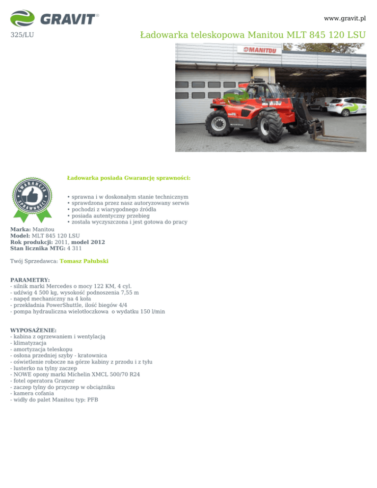 www.gravit.pl Ładowarka teleskopowa Manitou MLT 845 120 LSU 325/LU Ładowarka posiada Gwarancję sprawności: • sprawna i w doskonałym stanie technicznym • sprawdzona przez nasz autoryzowany serwis • pochodzi z wiarygodnego źródła • posiada autentyczny przebieg • została wyczyszczona i jest gotowa do pracy Marka: Manitou Model: MLT 845 120 LSU Rok produkcji: 2011, model 2012 Stan licznika MTG: 4 311 Twój Sprzedawca: Tomasz Pałubski PARAMETRY: - silnik marki Mercedes o mocy 122 KM, 4 cyl. - udźwig 4 500 kg, wysokość podnoszenia 7,55 m - napęd mechaniczny na 4 koła - przekładnia PowerShuttle, ilość biegów 4/4 - pompa hydrauliczna wielotłoczkowa o wydatku 150 l/min WYPOSAŻENIE: - kabina z ogrzewaniem i wentylacją - klimatyzacja - amortyzacja teleskopu - osłona przedniej szyby - kratownica - oświetlenie robocze na górze kabiny z przodu i z tyłu - lusterko na tylny zaczep - NOWE opony marki Michelin XMCL 500/70 R24 - fotel operatora Gramer - zaczep tylny do przyczep w obciążniku - kamera cofania - widły do palet Manitou typ: PFB