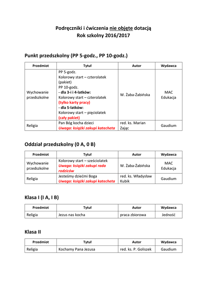 Podręczniki i ćwiczenia nie objęte dotacją Rok szkolny 2016/2017 Punkt przedszkolny (PP 5-godz., PP 10-godz.) Przedmiot Wychowanie przedszkolne Religia Tytuł PP 5-godz. Kolorowy start – czterolatek (pakiet) PP 10-godz. - dla 3-i i 4-latków: Kolorowy start – czterolatek (tylko karty pracy) - dla 5-latków: Kolorowy start – pięciolatek (cały pakiet) Pan Bóg kocha dzieci Uwaga: książki zakupi katecheta Autor Wydawca W. Żaba-Żabińska MAC Edukacja red. ks. Marian Zając Gaudium Oddział przedszkolny (0 A, 0 B) Przedmiot Wychowanie przedszkolne Religia Tytuł Kolorowy start – sześciolatek Uwaga: książki zakupi rada rodziców Jesteśmy dziećmi Boga Uwaga: książki zakupi katecheta Autor Wydawca W. Żaba-Żabińska MAC Edukacja red. ks. Władysław Kubik Gaudium Autor Wydawca Klasa I (I A, I B) Przedmiot Religia Tytuł Jezus nas kocha praca zbiorowa Jedność Klasa II Przedmiot Religia Tytuł Kochamy Pana Jezusa Autor Wydawca red. ks. P. Goliszek Gaudium Klasa III (III A, III B, III C) Przedmiot Religia Tytuł Przyjmujemy Pana Jezusa Autor Wydawca red. ks. P. Goliszek Gaudium Autor Wydawca Klasa IV (IV A, IV B) Przedmiot Religia Tytuł Jestem Chrześcijaninem red. ks. W. Janiga Gaudium Klasa V Przedmiot Tytuł Autor Wydawca Religia Wierzę w Boga red. ks. W. Janiga Gaudium Wychowanie do życia w rodzinie W drodze ku dorosłości. Ćwiczenia i materiały dla klasy 5 szkoły podstawowej T. Król Rubikon Klasa VI Przedmiot Religia Tytuł Autor Wierzę w Kościół red. ks. W. Janiga 1) Słowa na start! Podręcznik do kształcenia literackiego i kulturowego dla klasy VI szkoły podstawowej M. Derlukiewicz Język polski Język angielski Plastyka Matematyka Gaudium Nowa Era 2) Słowa na start! Podręcznik do kształcenia językowego dla klasy VI szkoły podstawowej, cz. I i II Historia i społeczeństwo Wydawca Wczoraj i dziś - podręcznik do historii i społeczeństwa dla klasy 6 (podręcznik + zeszyt ćwiczeń) Go International! 3 (podręcznik i zeszyt ćwiczeń z płytą CD) A. Wojciechowska, A. Marcinkiewicz G. Wojciechowski M. Tulip, C. Bianchi, A, Wypychowicz S. Stopczyk, B. Neubart, J. Chołaścińska Matematyka 6 (seria Matematyka M. Dobrowolska, z plusem) – podręcznik M. Karpiński, Plastyka. Klasa 4-6. Podręcznik do szkoły podstawowej. Nowa Era PWN WSiP GWO Przedmiot Tytuł Autor Wydawca P. Zarzycki, M. Jucewicz Przyroda Muzyka Zajęcia techniczne Zajęcia komputerowe Wychowanie do życia w rodzinie Tajemnice przyrody – podręcznik dla klasy szóstej szkoły podstawowej (podręcznik oraz zeszyt ćwiczeń) Muzyczny świat – podręcznik dla klasy 6 Jak to działa? Podręcznik z ćwiczeniami do zajęć technicznych dla klas 4-6 Komputerowe opowieści. Podręcznik do zajęć komputerowych dla klas IV-VI szkoły podstawowej (z płytą CD) „W drodze ku dorosłości. Ćwiczenia i materiały dla klasy 6 szkoły podstawowej” J. Stawarz, H. Kowalczyk, F. Szlajfer Nowa Era T. Wójcik MAC Edukacja L. Łabęcki, M. Łabęcka Nowa Era M. Gulgowski, J. Lipski T. Król Czarny Kruk Rubikon
